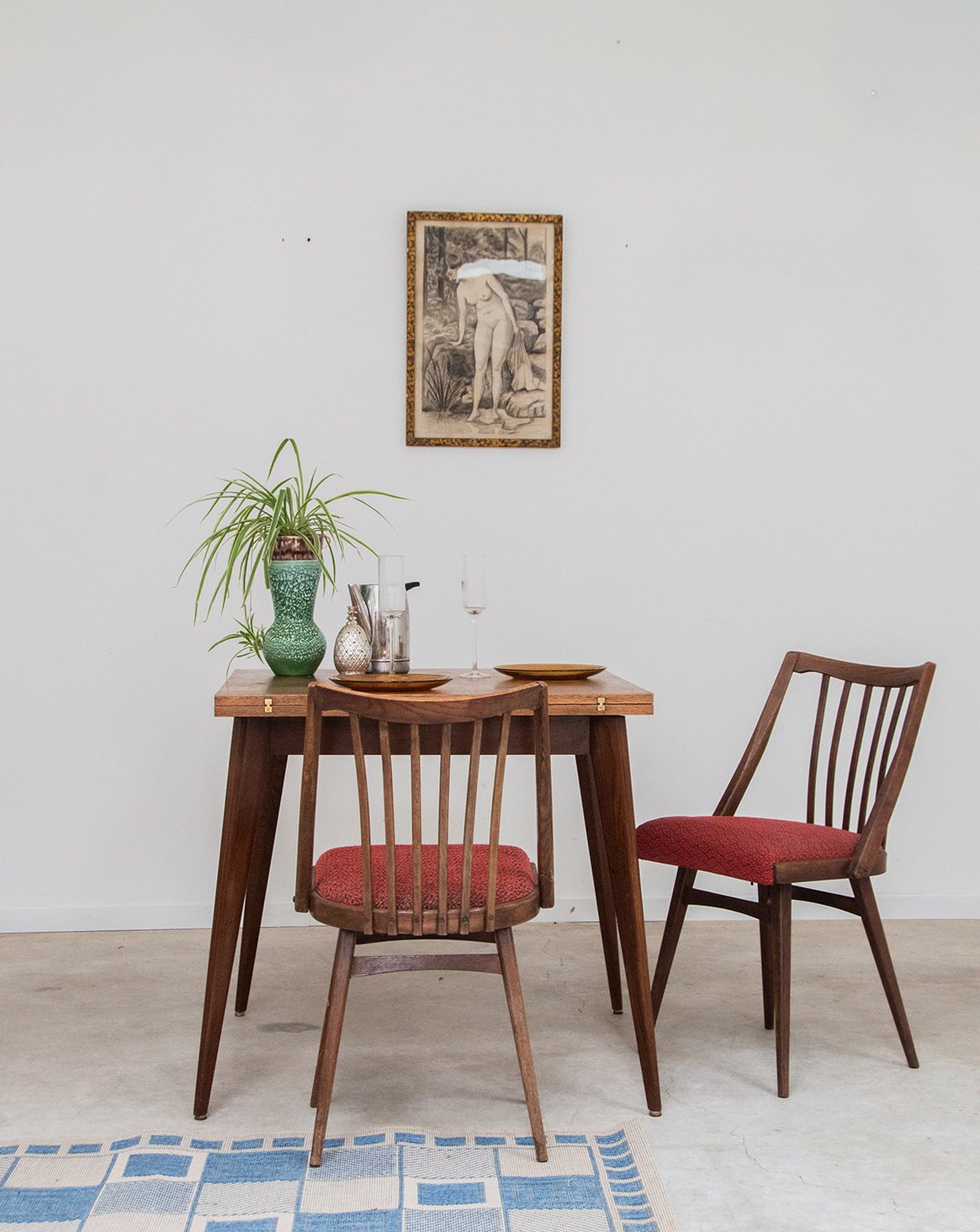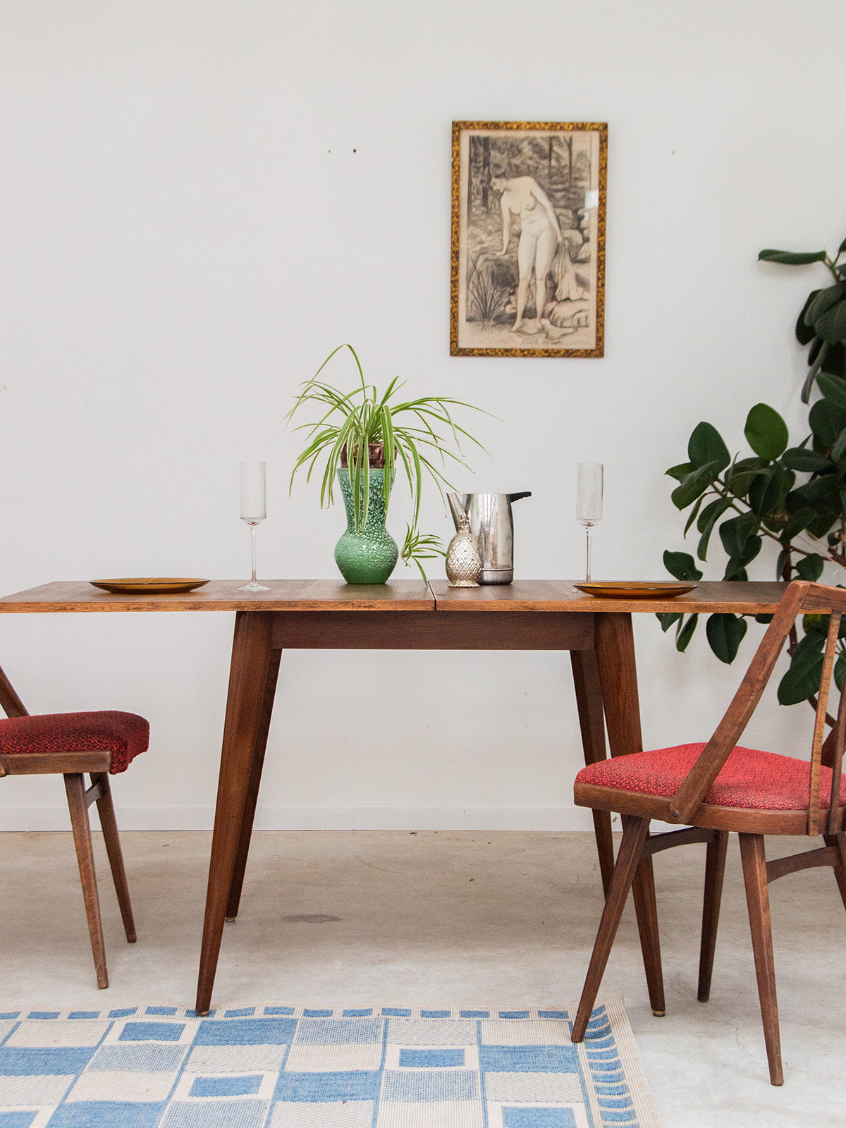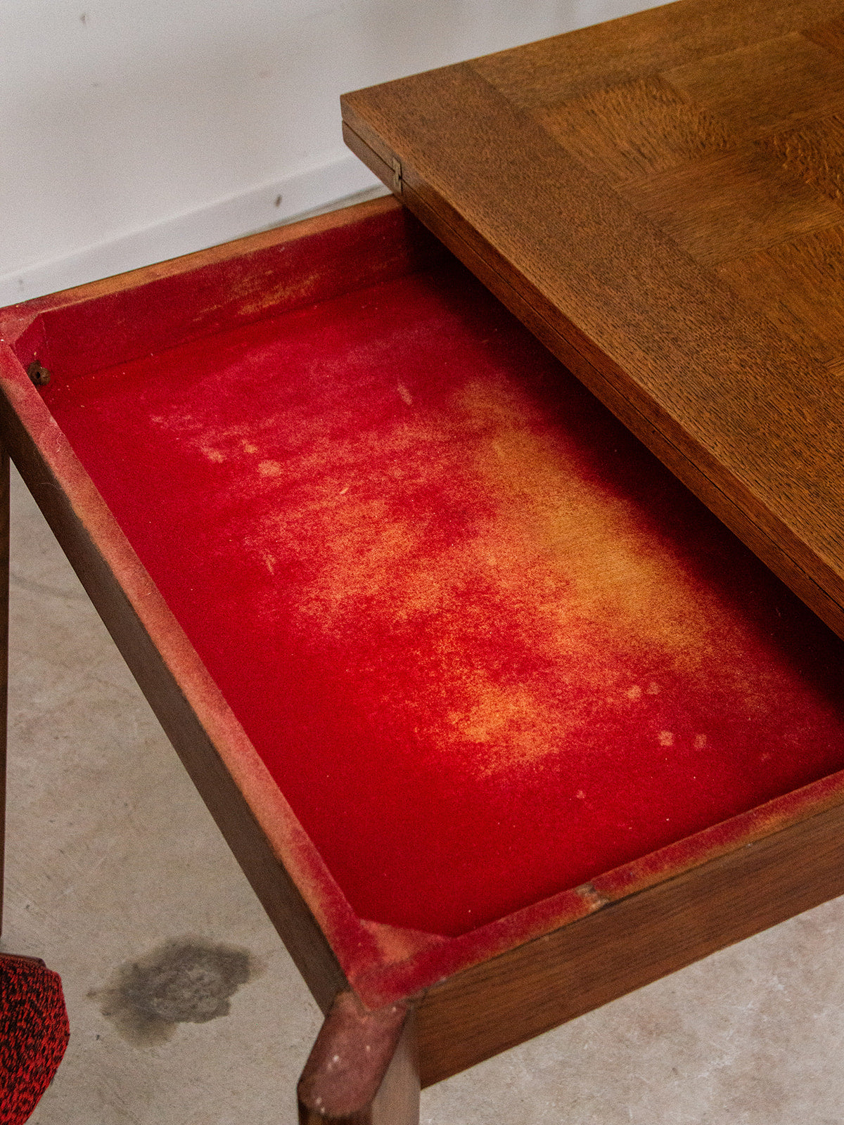 Practical and original, this dining or games table captivates with its swiveling, fold-out top decorated with graphic tiles. Its spaced-apart dark wood compass legs provide stability and retro charm. Inside, a compartment with worn red fabric provides discreet storage space. Ideal for seating up to 6 guests, it combines style and functionality in your living room or dining room.