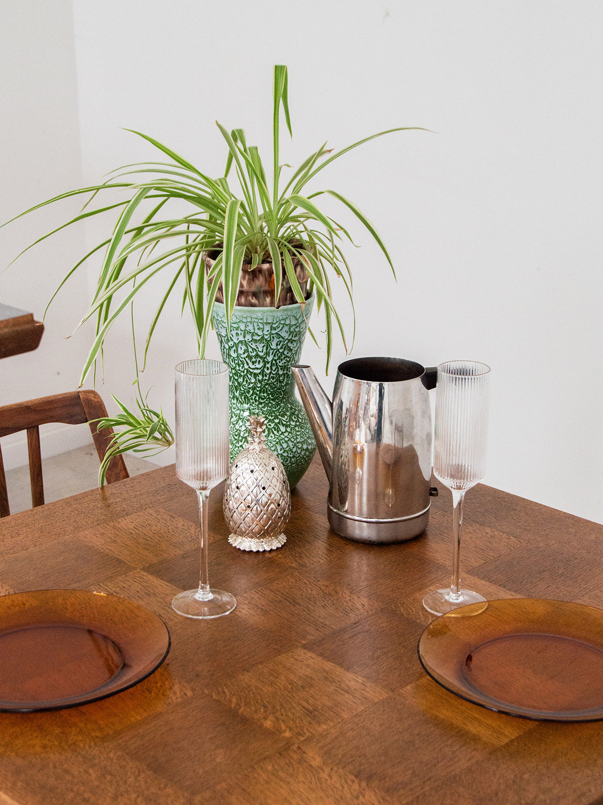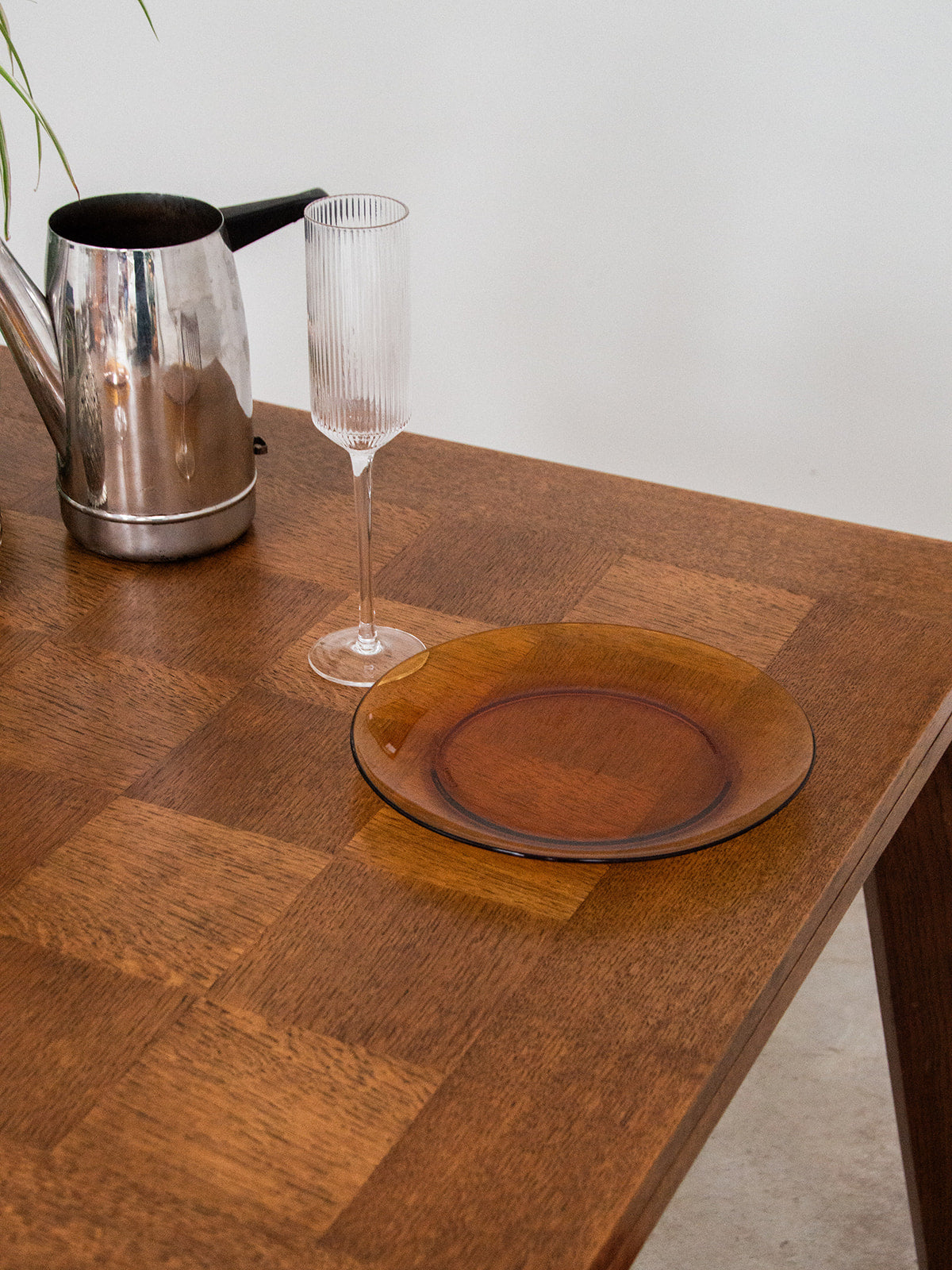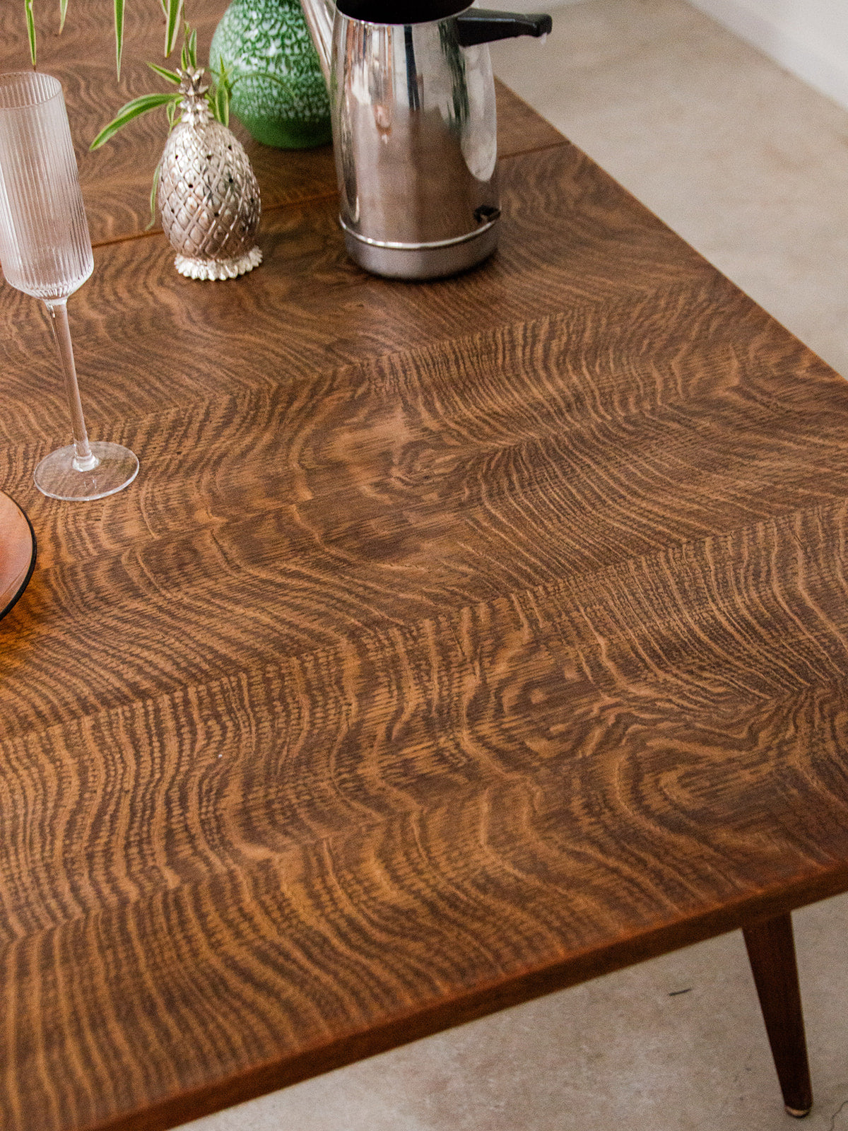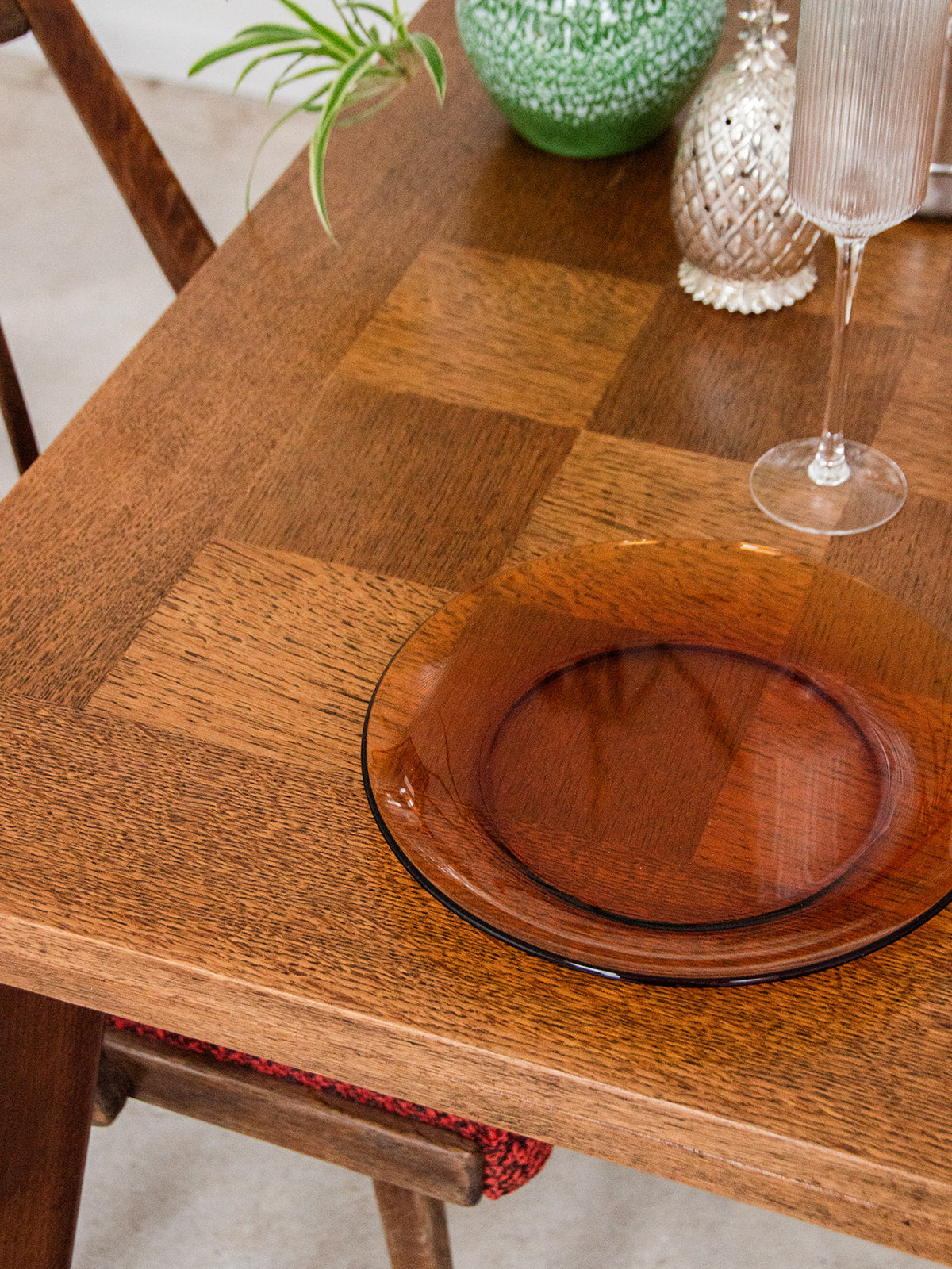 Practical and original, this dining or games table captivates with its swiveling, fold-out top decorated with graphic tiles. Its spaced-apart dark wood compass legs provide stability and retro charm. Inside, a compartment with worn red fabric provides discreet storage space. Ideal for seating up to 6 guests, it combines style and functionality in your living room or dining room.