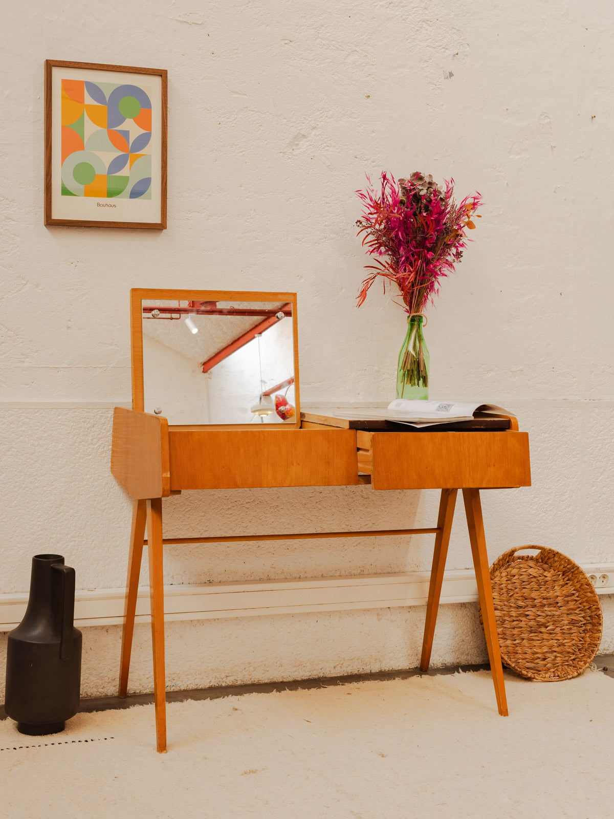 The term "dressing table" appeared at the beginning of the 20th century, while the piece of furniture has existed since Antiquity. Composed of a shelf, one or more mirrors and numerous drawers, the dressing table is a storage piece, but above all a place of preparation where one applies makeup, perfumes and does one's hair. If originally, this furniture corresponds to both men and women, it very quickly became the embodiment of feminine mystery. The dressing table can indeed be equipped with secret hiding places, in order to receive intimate correspondence. Today, the dressing table is back in the spotlight and works very well in all styles of interiors!