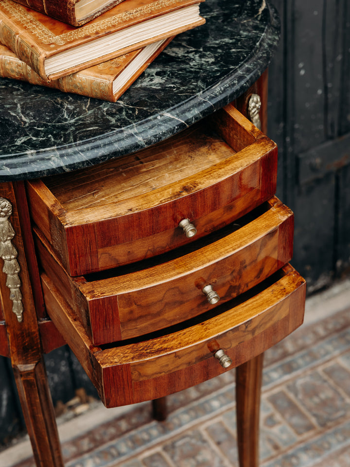 Bring a touch of elegance to your home with this tall, oval bedside table, finely crafted in veneer and on legs. Its removable green marble top is eye-catching, while its three spacious drawers provide convenient storage. Brass details, inspired by the Louis XV style, add a touch of timeless sophistication to this charming piece.