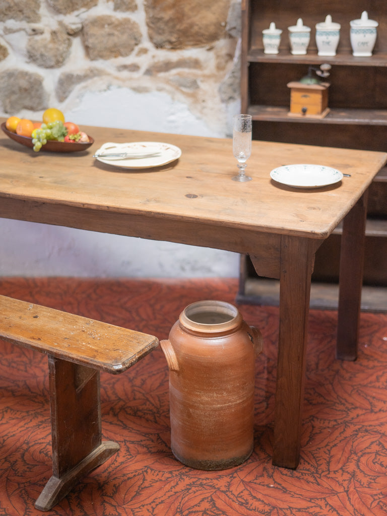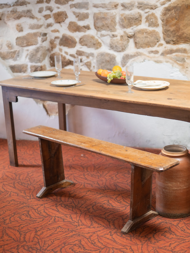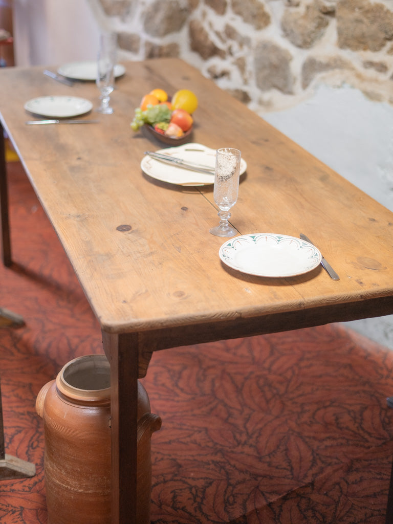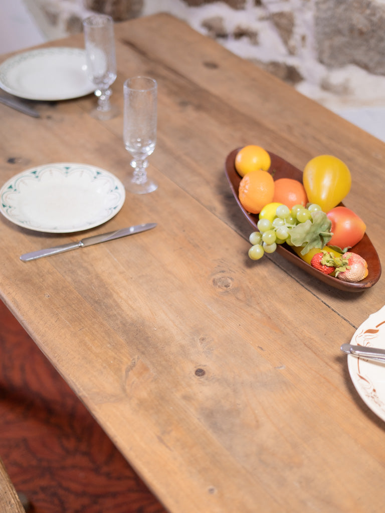 Discover our antique wooden farmhouse table, a true symbol of authentic charm. Its unique patina and generous lines make it an ideal centerpiece for gathering 6 to 8 guests around delicious meals. Perfect for creating a warm atmosphere, this table will bring a welcoming and timeless feel to your home. Let yourself be seduced by its traditional look and its history, which will enrich your convivial moments.
