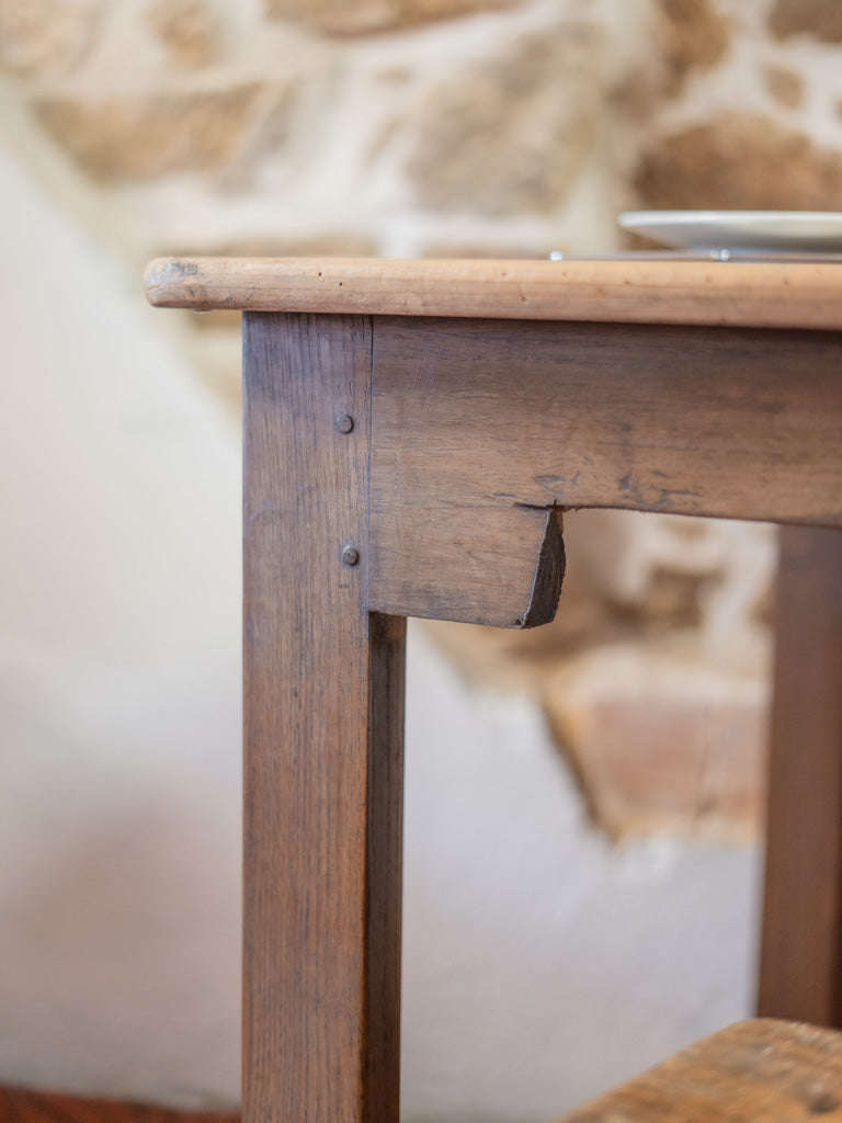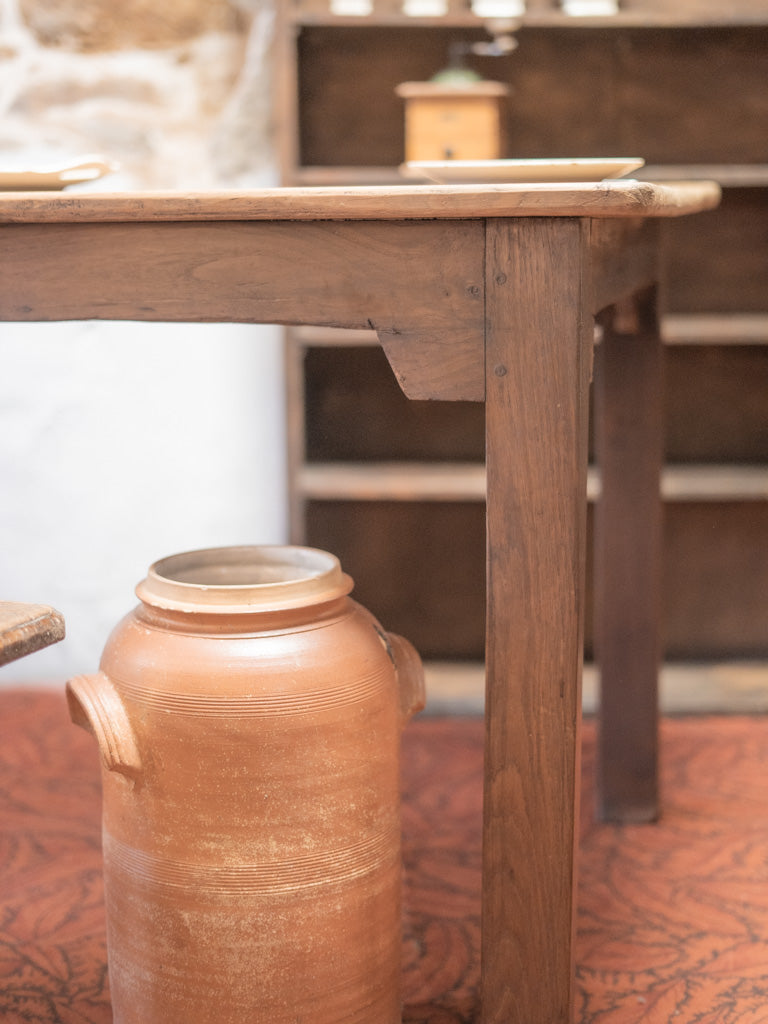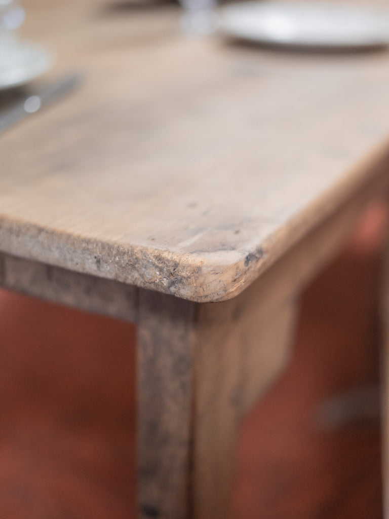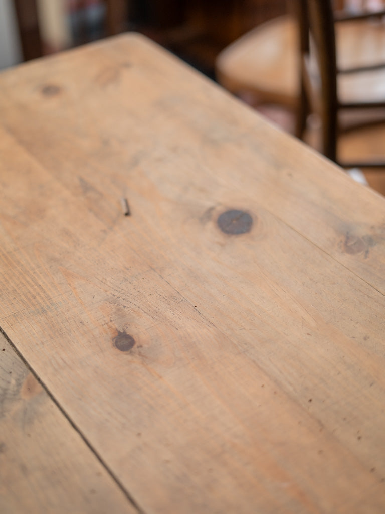 Discover our antique wooden farmhouse table, a true symbol of authentic charm. Its unique patina and generous lines make it an ideal centerpiece for gathering 6 to 8 guests around delicious meals. Perfect for creating a warm atmosphere, this table will bring a welcoming and timeless feel to your home. Let yourself be seduced by its traditional look and its history, which will enrich your convivial moments.