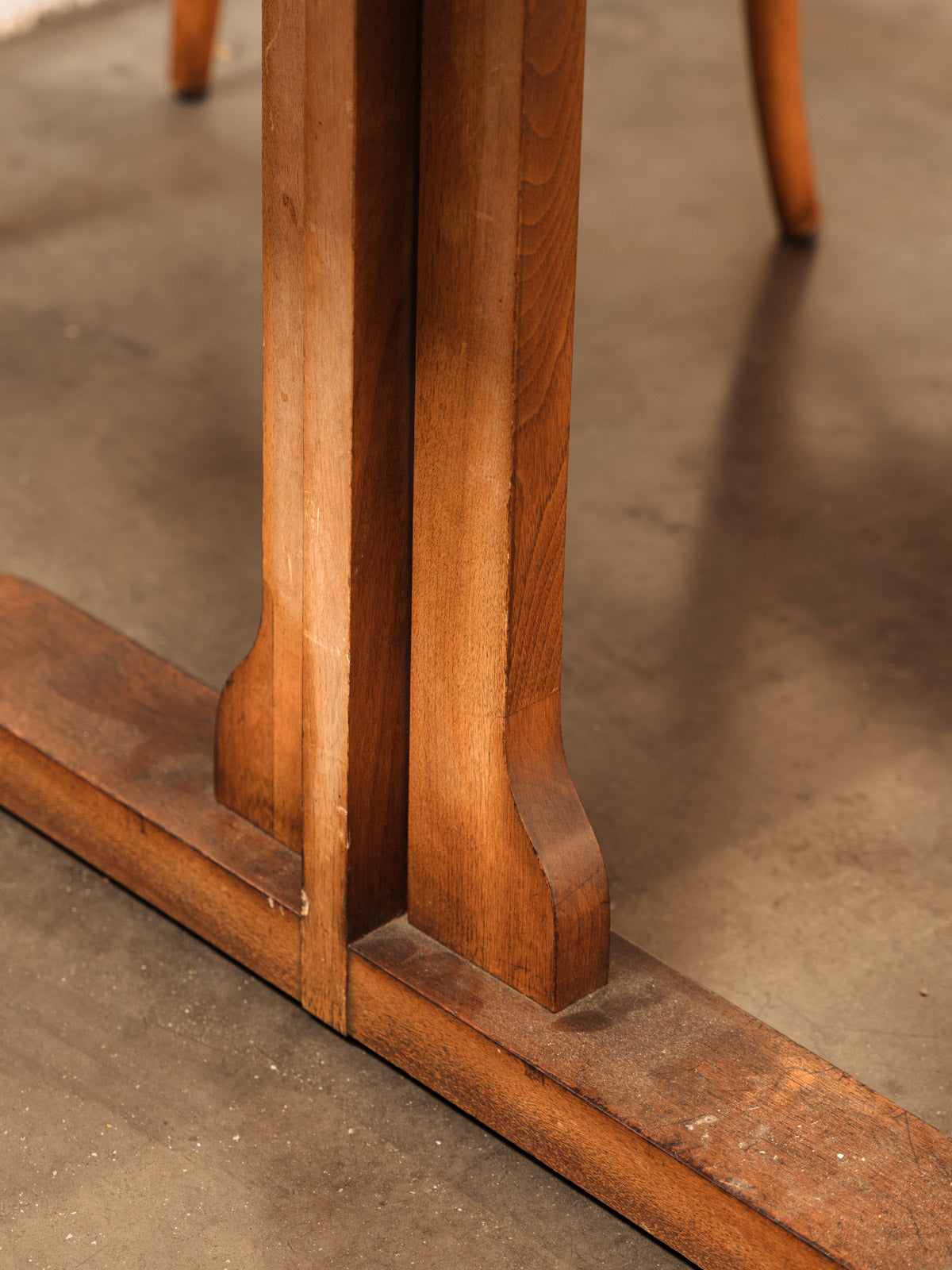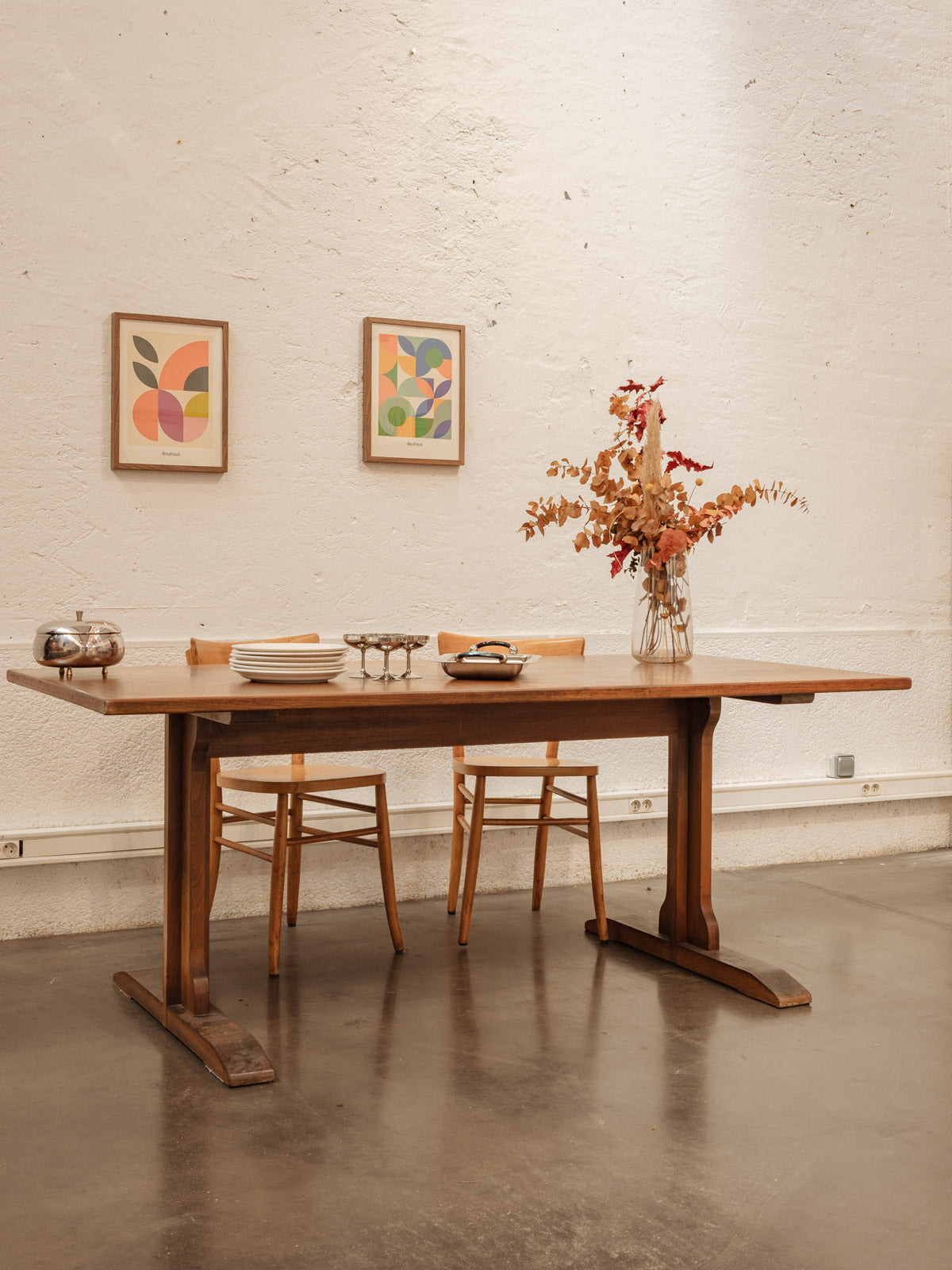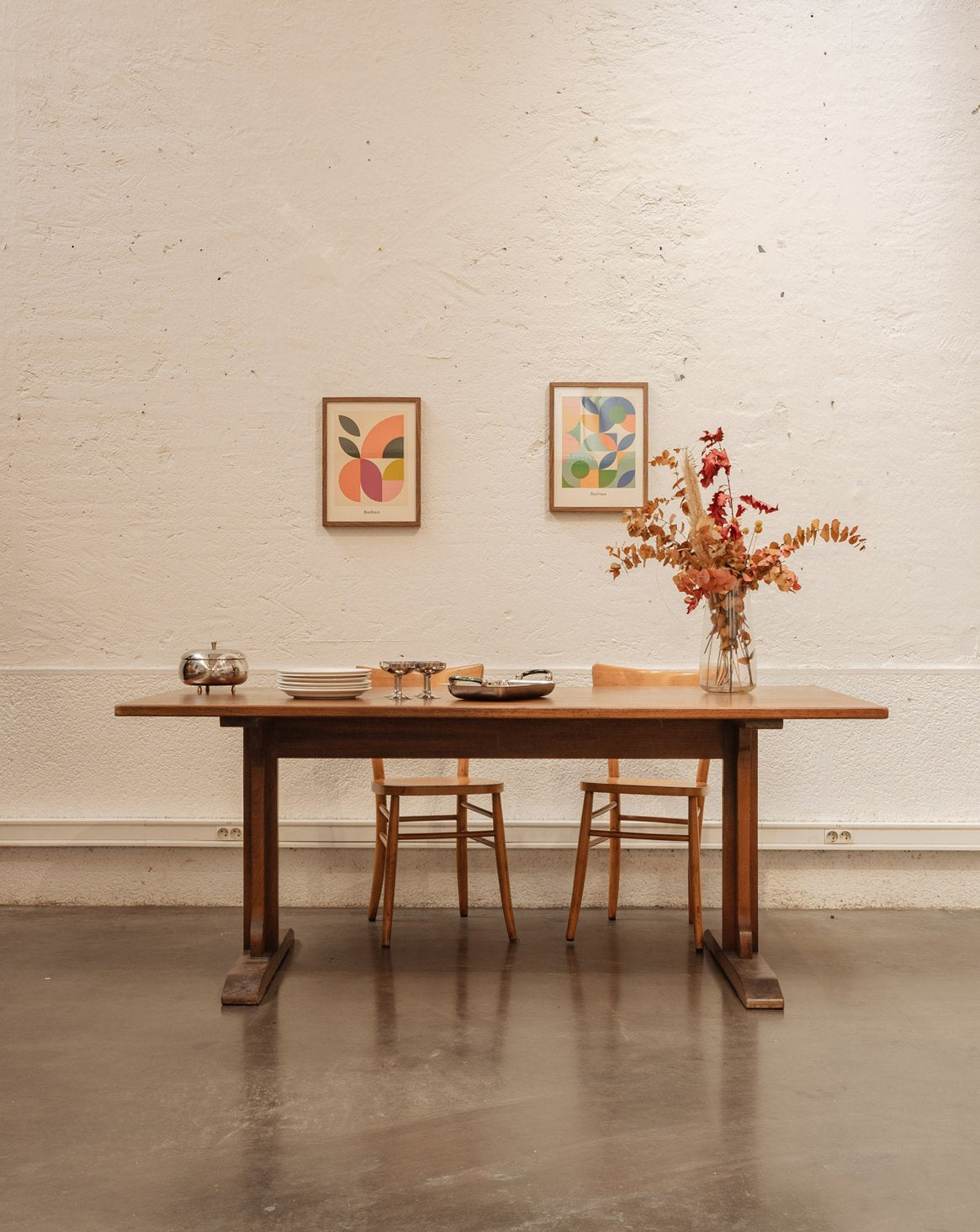 Discover this wooden trestle-style dining table, emblematic of the 1960s, which will enhance your interior. With its ideal seating capacity for 6 to 8 people, it embodies the chic and functional spirit of Charlotte Perriand. Its Italian design combines elegance and simplicity, making it a must-have for convivial meals. Bring a warm, retro touch to your dining room with this unique and timeless piece.