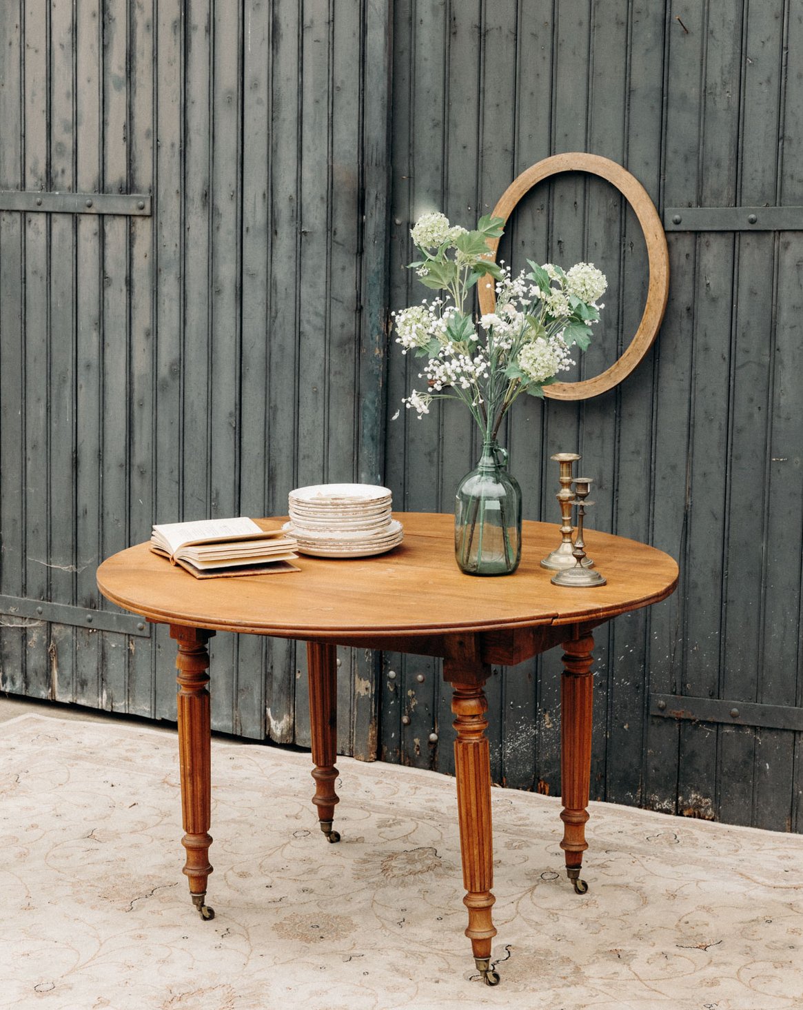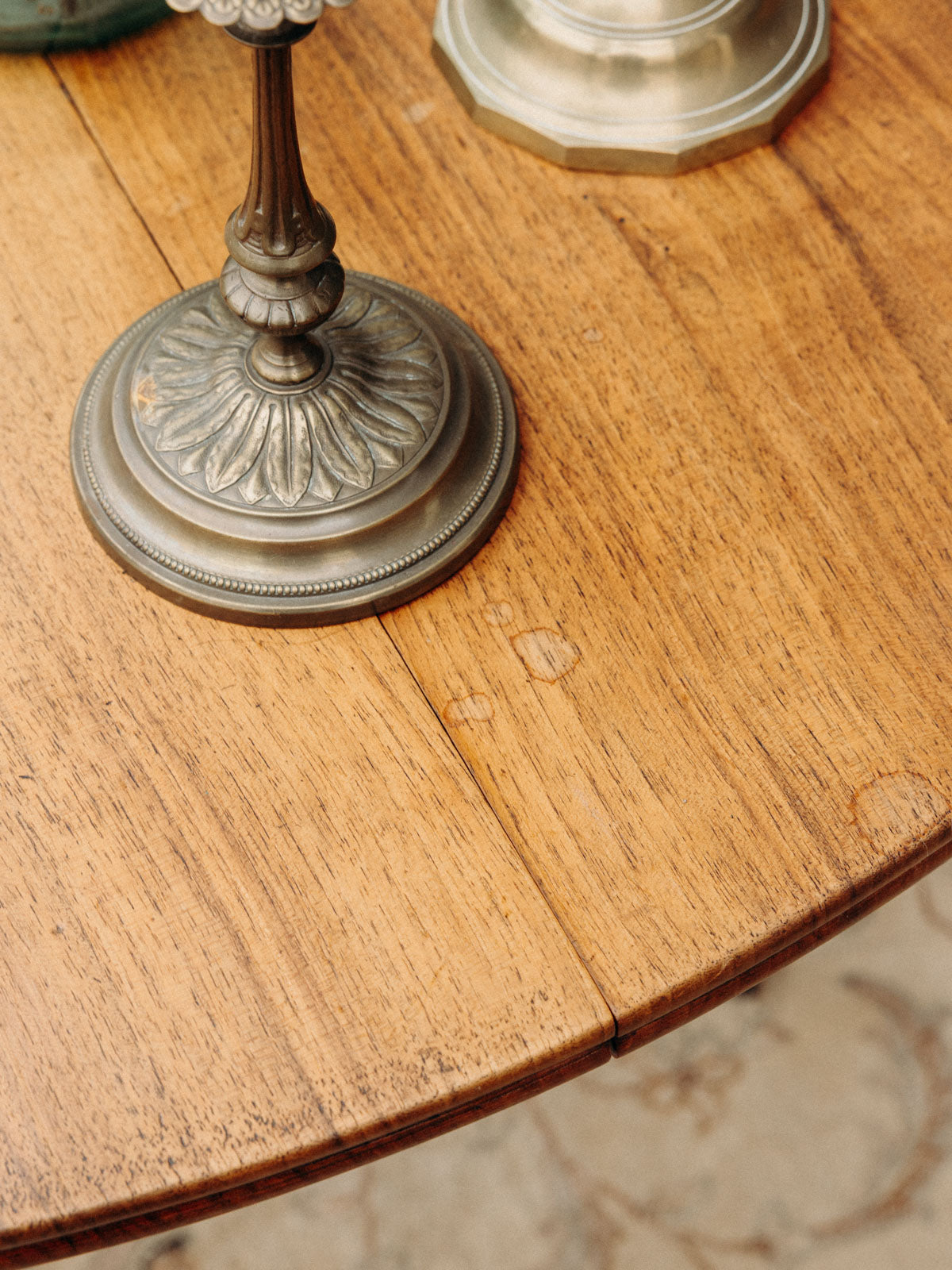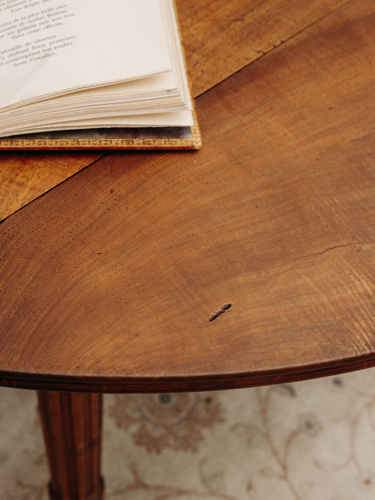 Bring a touch of elegance to your home with this round folding wooden dining table. Its attractive legs add character to the design while providing practical functionality. Although the tabletop has some marks, this gives it an authentic and unique charm. Ideal for meals with family or friends, this table is discreet thanks to its folding system. Ideal for comfortably seating 4 to 5 people.