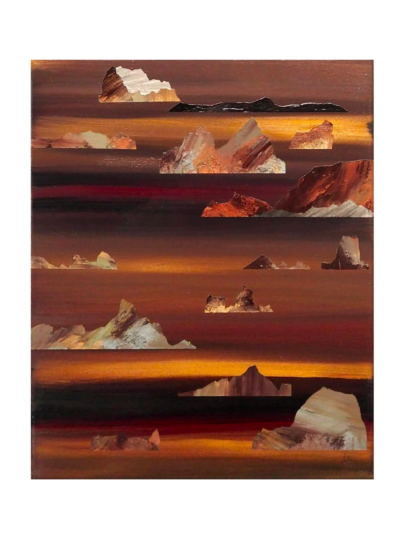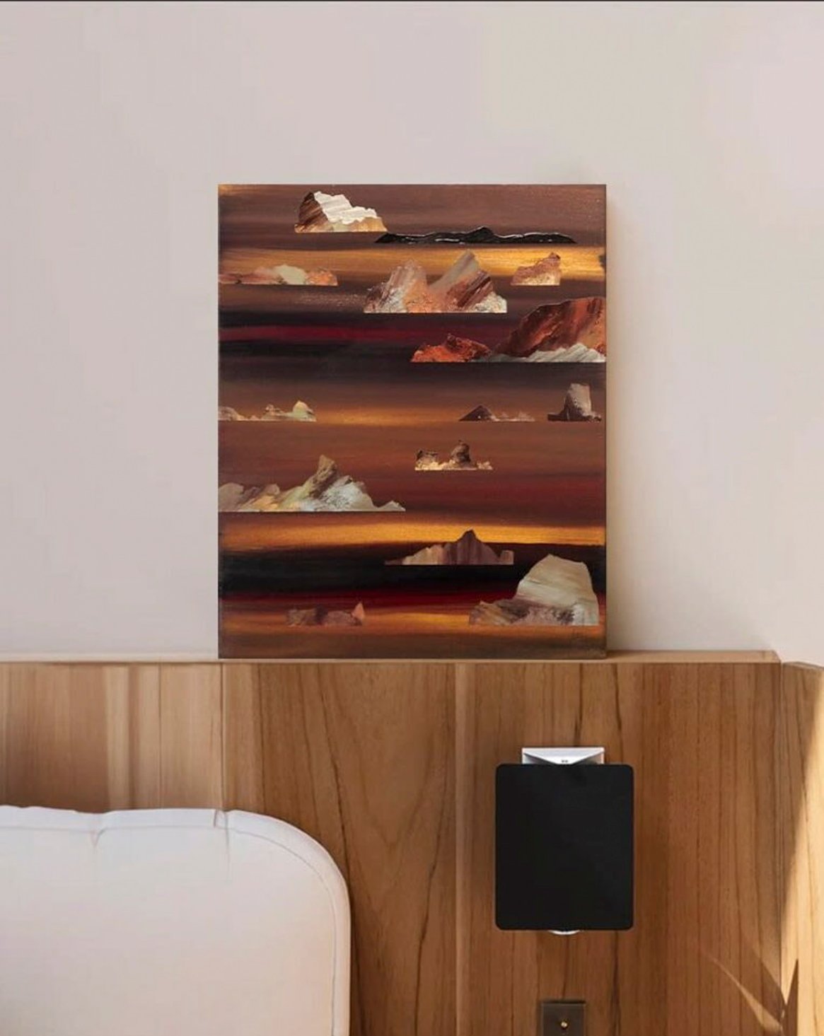 Based in Paris in the Villa du Lavoir, Hubert Jouzeau explores pictorial material as a sensory and poetic language. His works play with gold, gilt, and textures, evoking twilight landscapes and luminous atmospheres. Inspired by nature and architecture, he transposes freehand palm tree motifs or more complex compositions, blending minimalism, color, and geometric lines to create imaginary landscapes that are both surprising and sensitive.