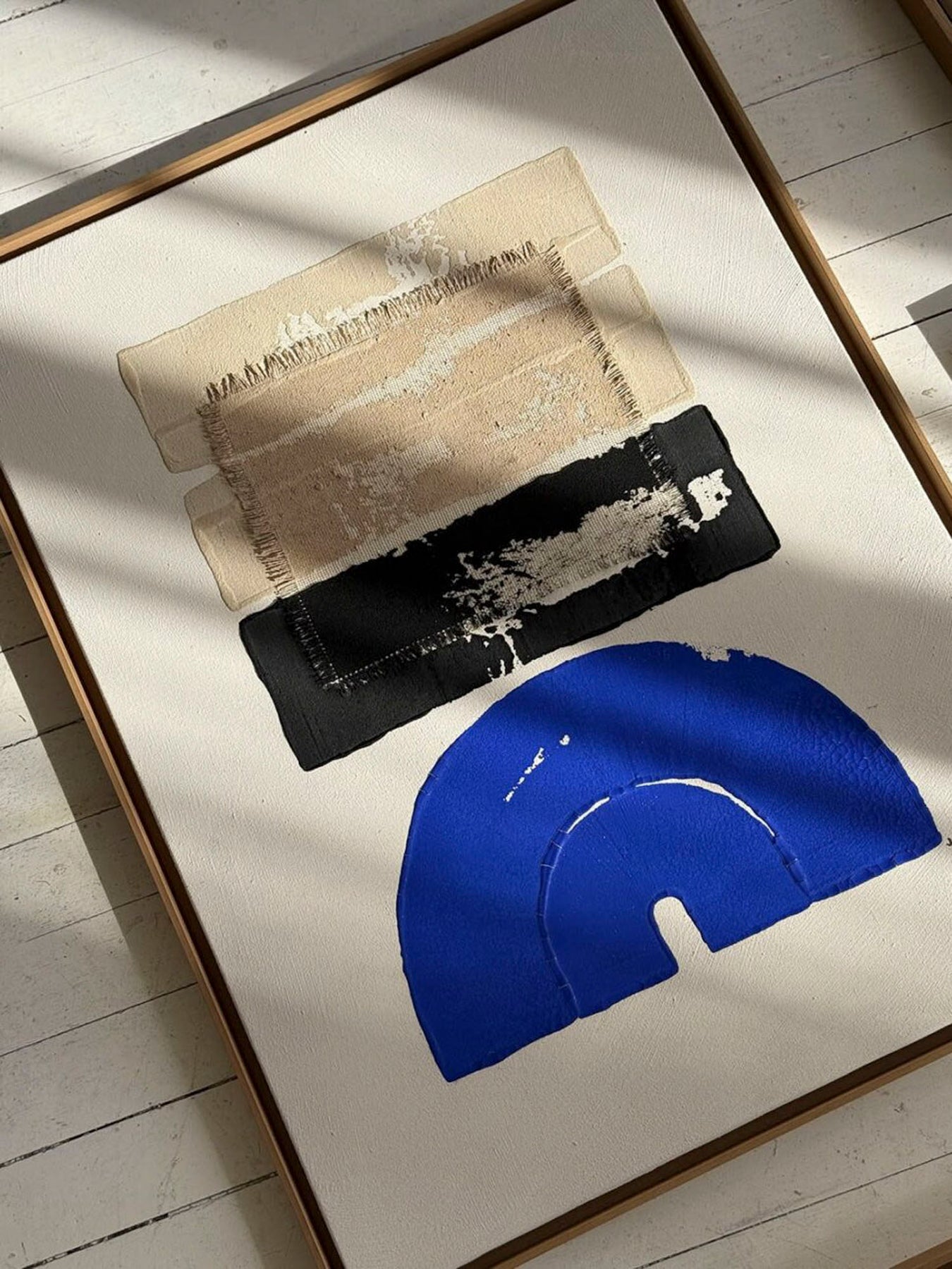 Discover Mykonos #85 , a work by Johanna Gaudeau , created in 2025. Made of lime and acrylic paint on burlap, enriched with sea water and Mykonian sand, this unique creation combines natural textures and authentic colors, offering a composition that is both sensitive and evocative. Its tactile and poetic language makes it a perfect addition to enhance an interior with character and depth. A unique work, presented by the Parisian gallery Wilo & Grove .