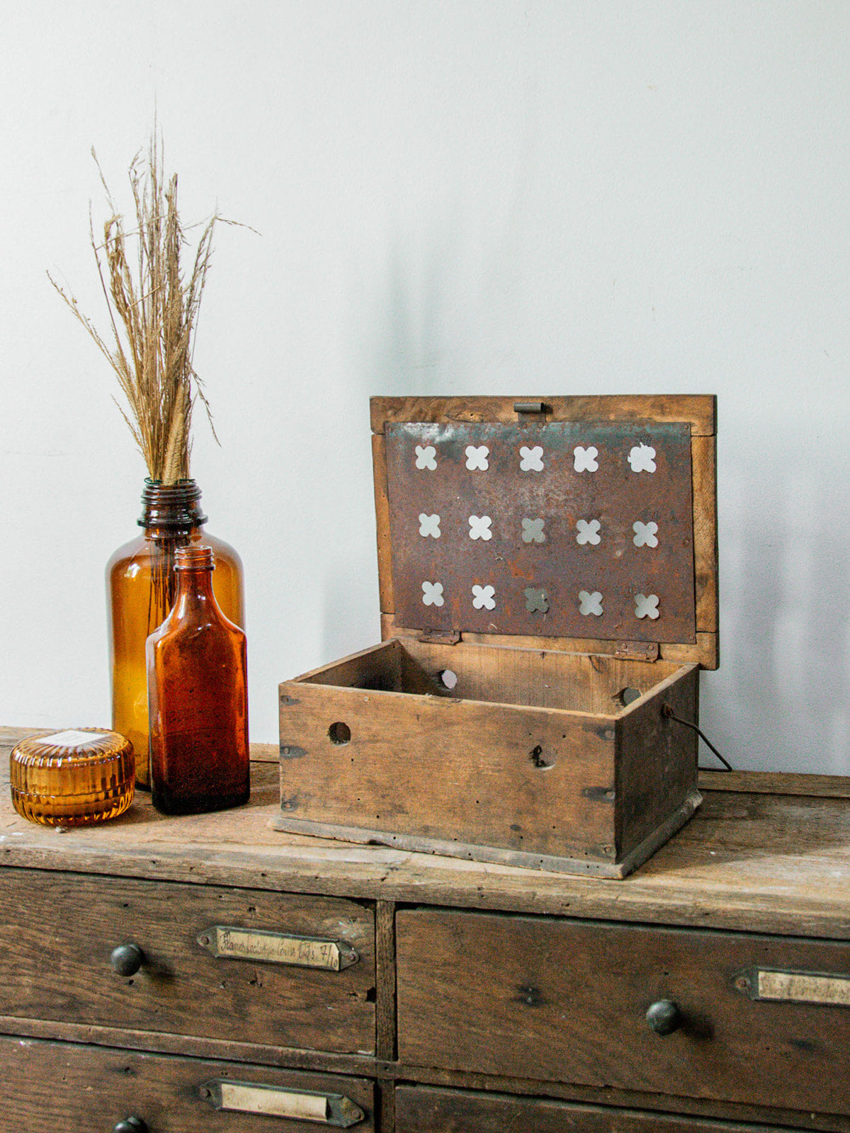 Discover this practical and elegant wooden warming box, featuring an easy-to-grip metal handle. Its simple and functional design makes it an ideal accessory for storing your small items. A few signs of wear give it an authentic vintage charm. This versatile piece is perfect for any interior style. A piece that's both useful and full of character.