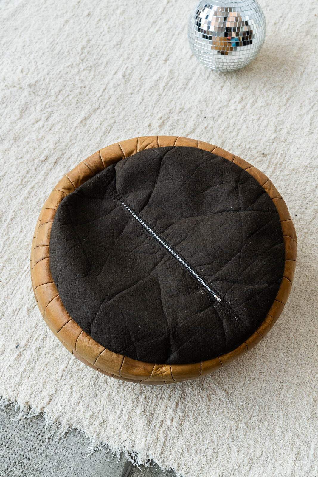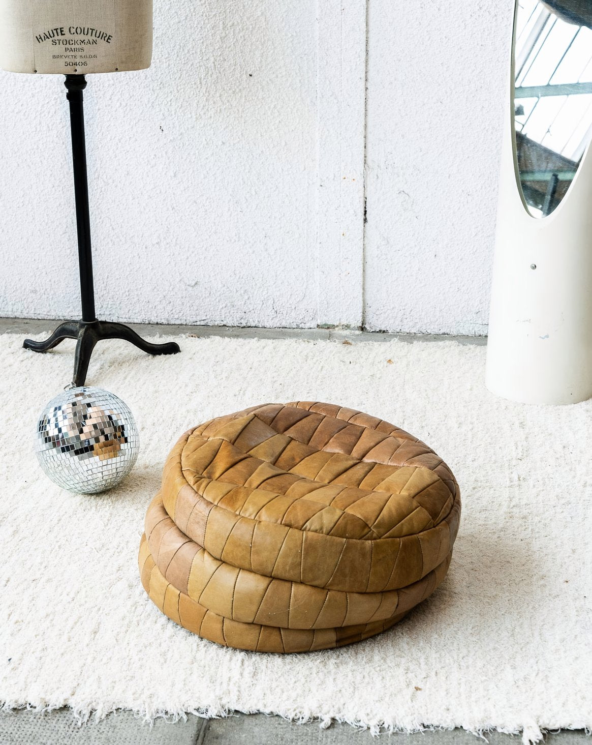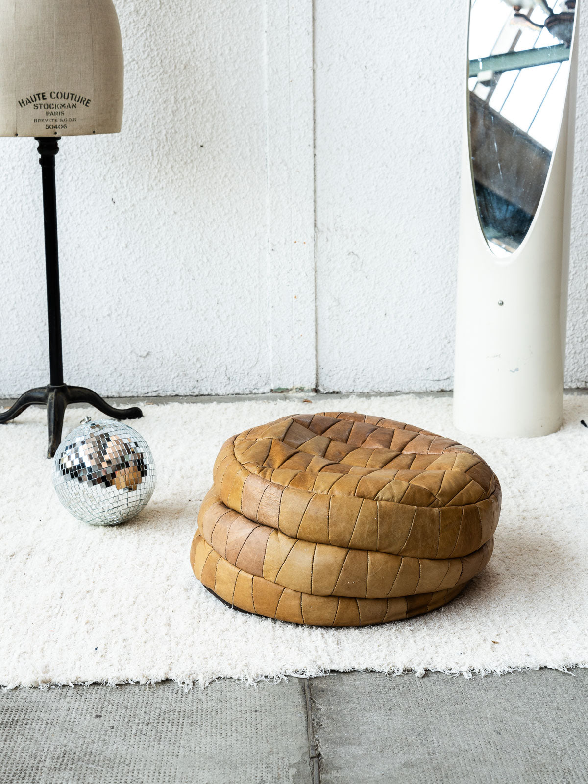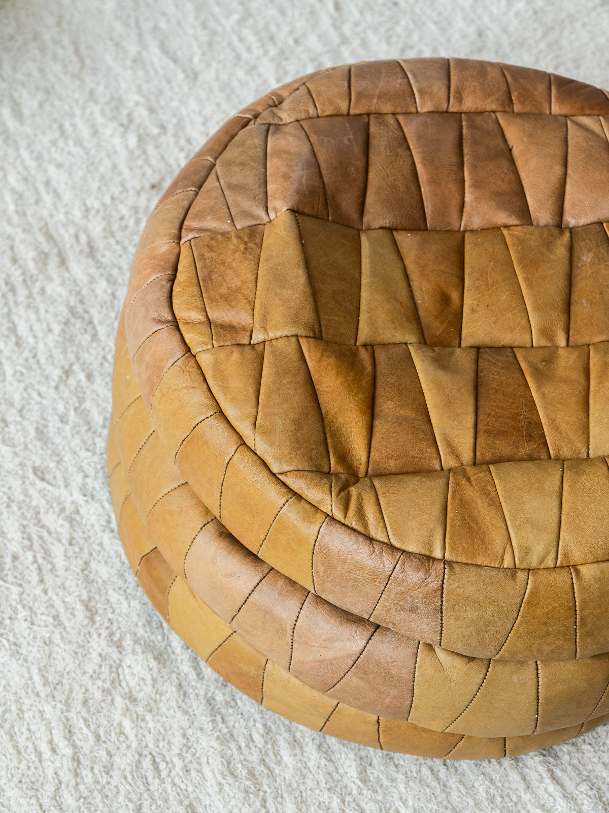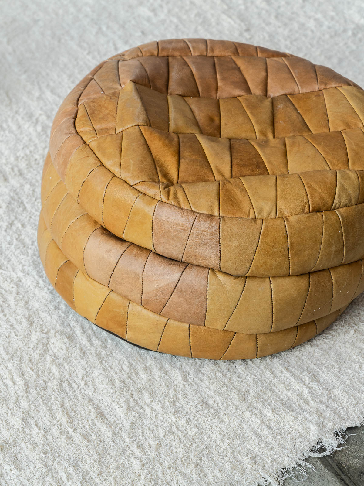 Discover our camel-colored leather pouf, attributed to De Sede, combining elegance and comfort. Its neat design and clean lines make it a perfect addition to any modern interior. The pouf's density can be adjusted by adding filler beads, allowing for customization according to your preferences. Bring a warm and stylish touch to your space with this one-of-a-kind pouf.
