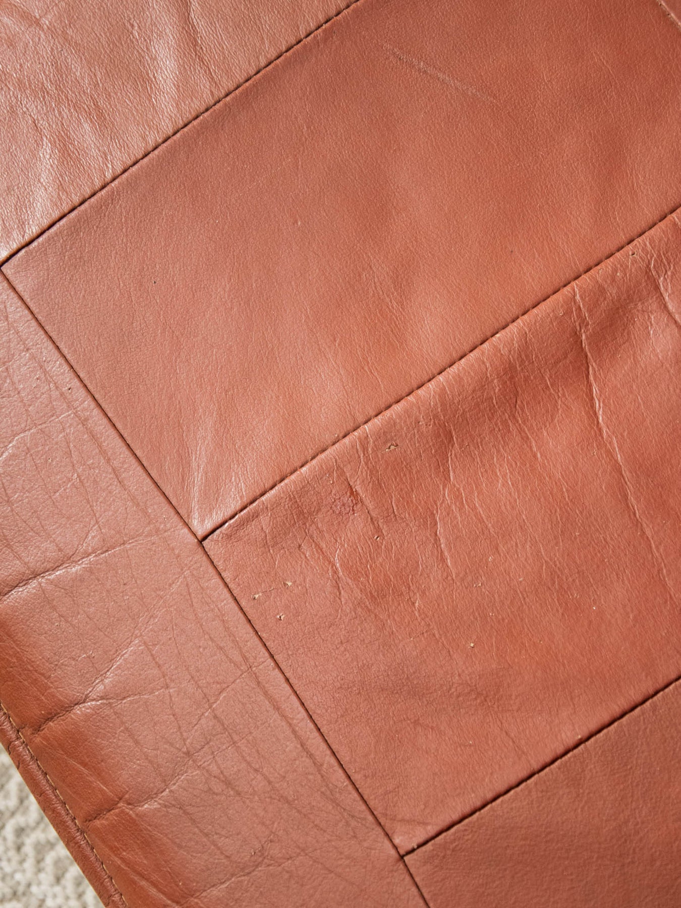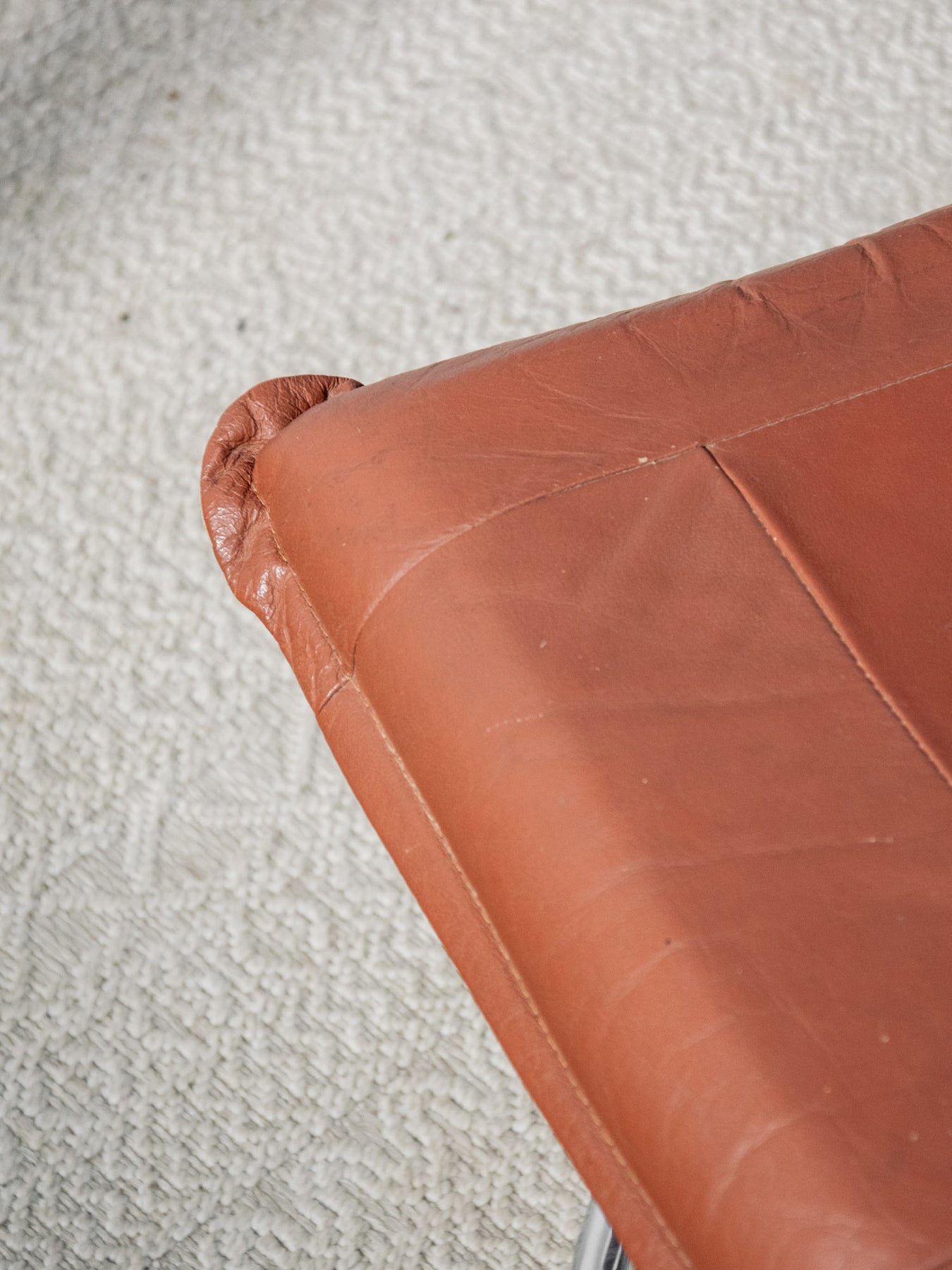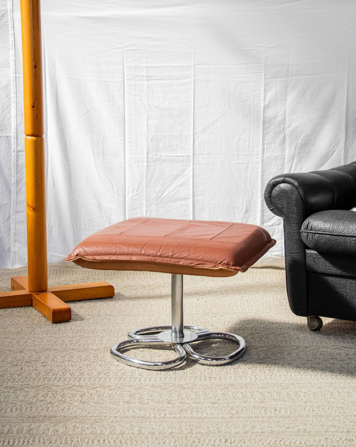 Discover our terracotta brown leather ottoman, a piece that's both elegant and functional. Its contemporary design, combined with sturdy metal legs, brings a modern touch to your home. Perfect for complementing a living room or relaxation area, this ottoman will also work well as a footrest or occasional seating. Treat yourself to comfort and style with this essential accessory.