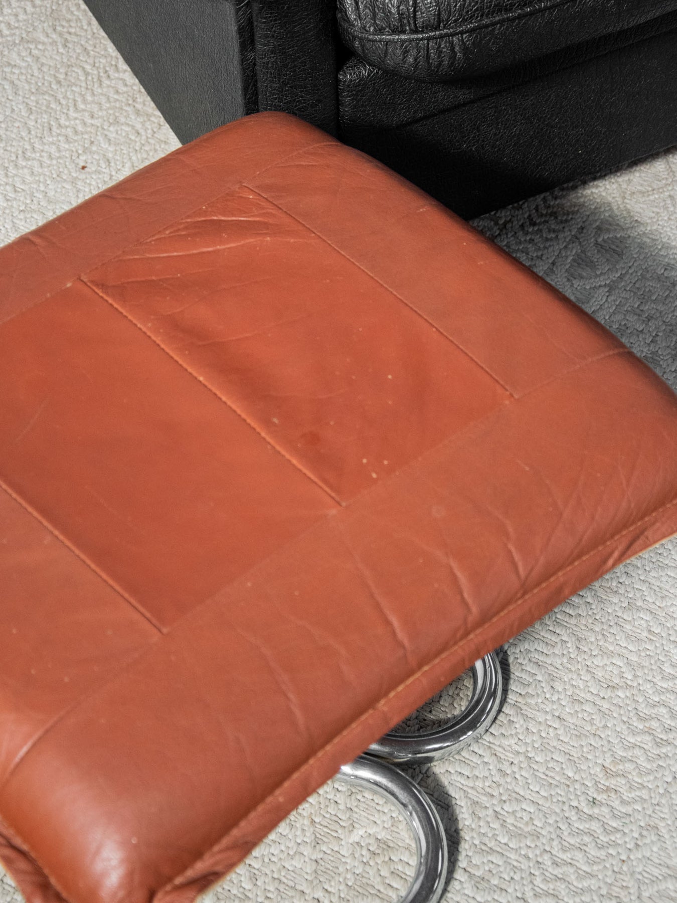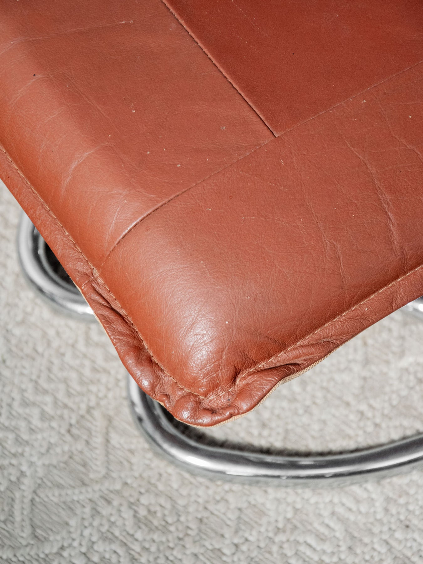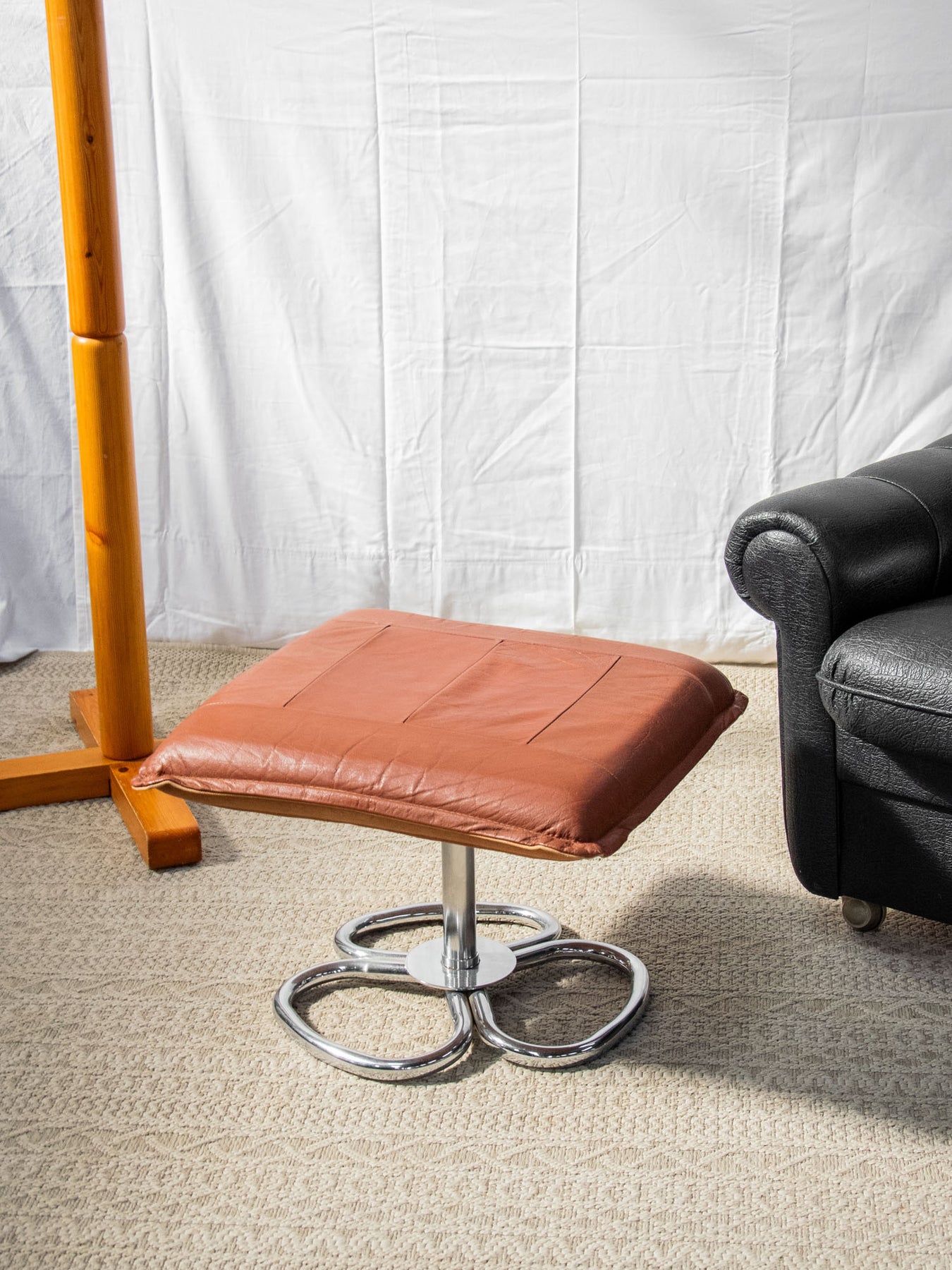 Discover our terracotta brown leather ottoman, a piece that's both elegant and functional. Its contemporary design, combined with sturdy metal legs, brings a modern touch to your home. Perfect for complementing a living room or relaxation area, this ottoman will also work well as a footrest or occasional seating. Treat yourself to comfort and style with this essential accessory.