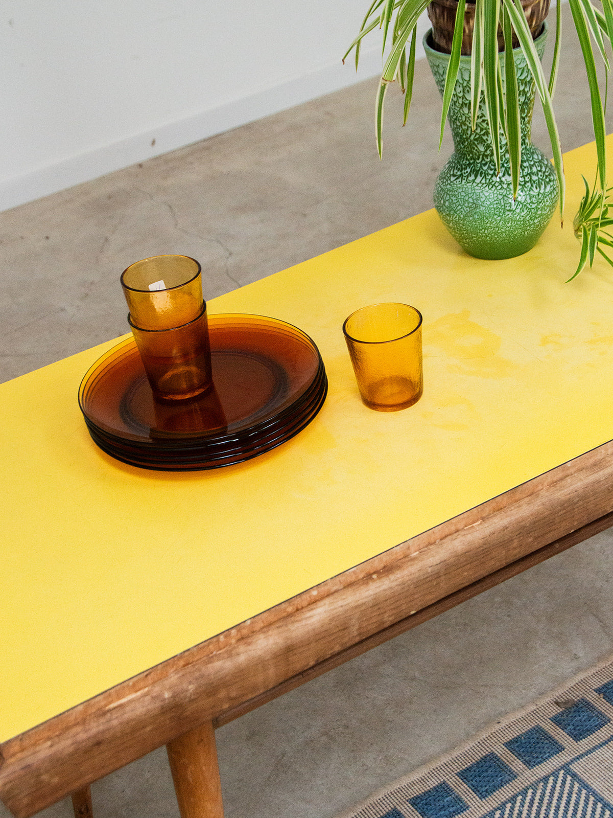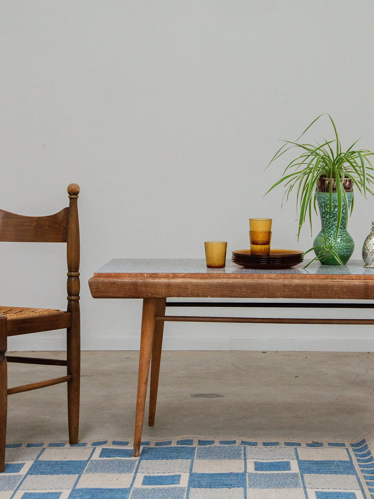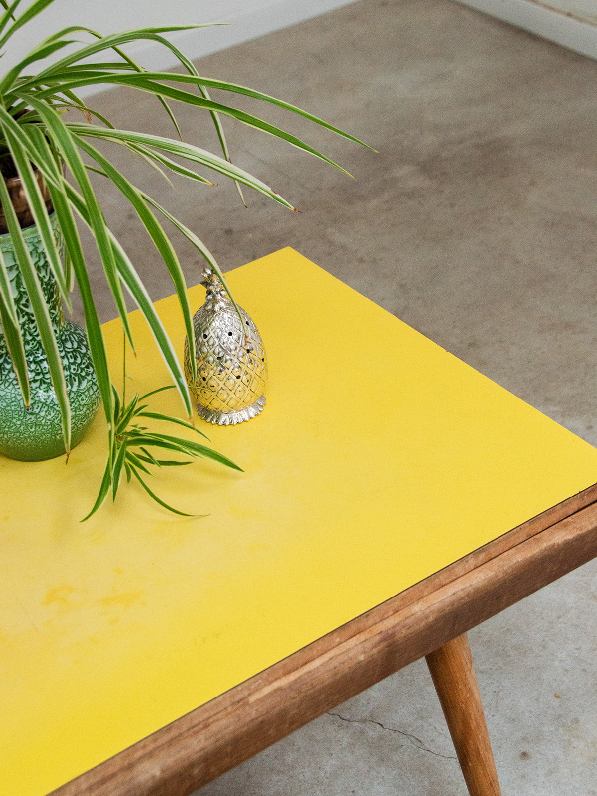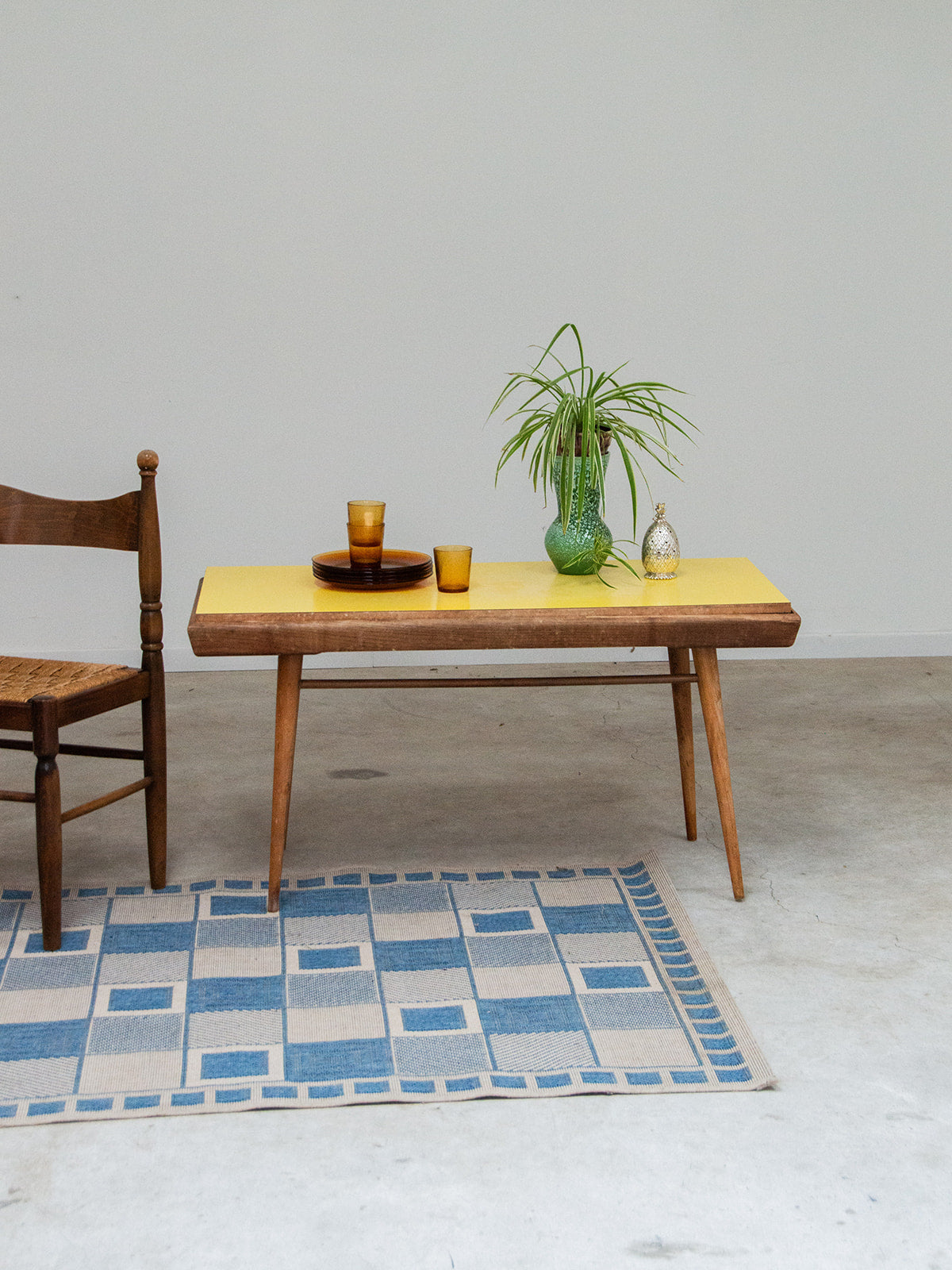 Bring a retro and practical touch to your home with this extra-tall side or coffee table. Its reversible yellow and gray Formica top offers two different ambiances to suit your tastes, while the wooden structure ensures strength and charm. With its signs of wear, it reveals its authentic, vintage character, perfect for complementing a living room or reading nook.
