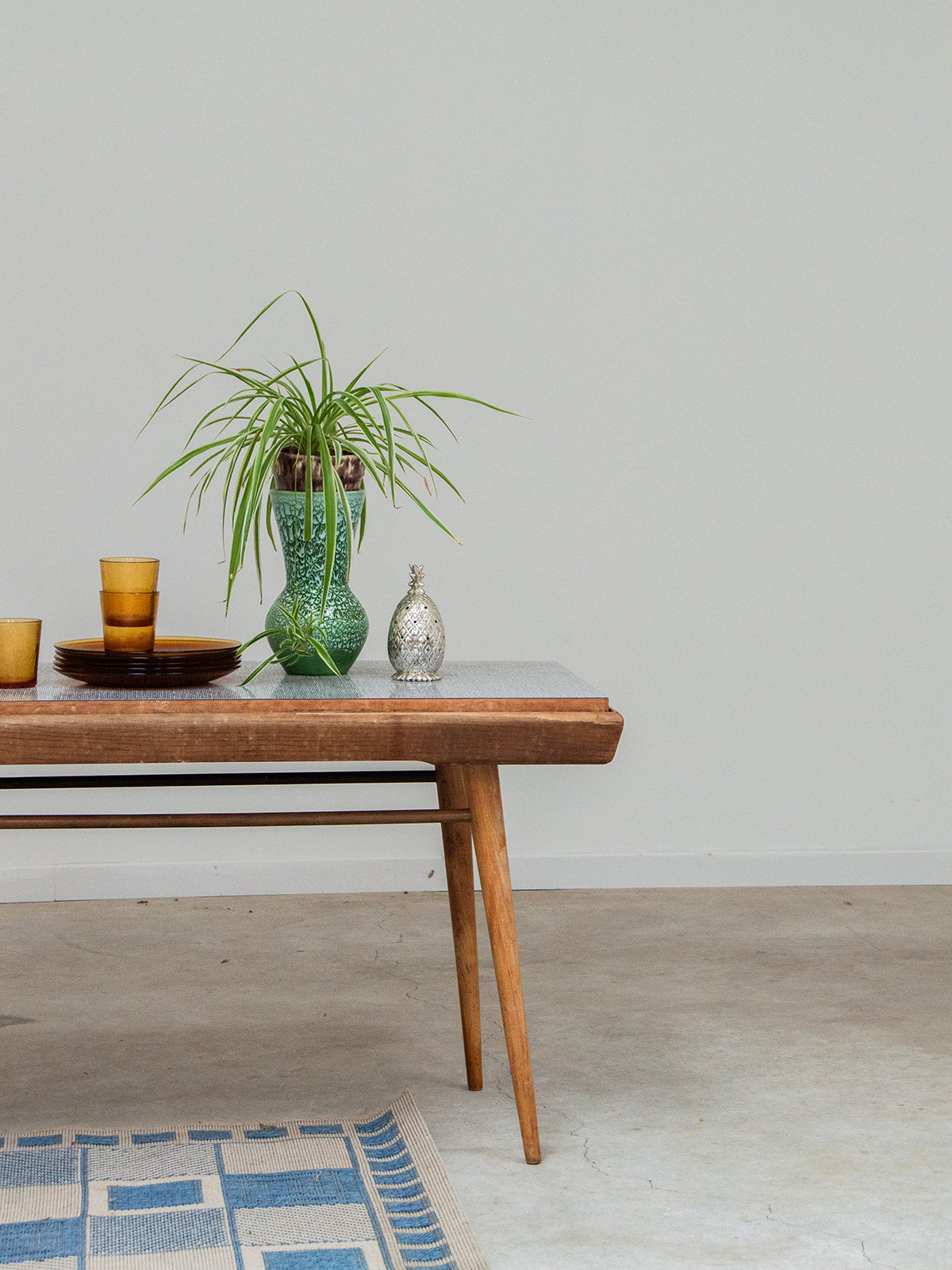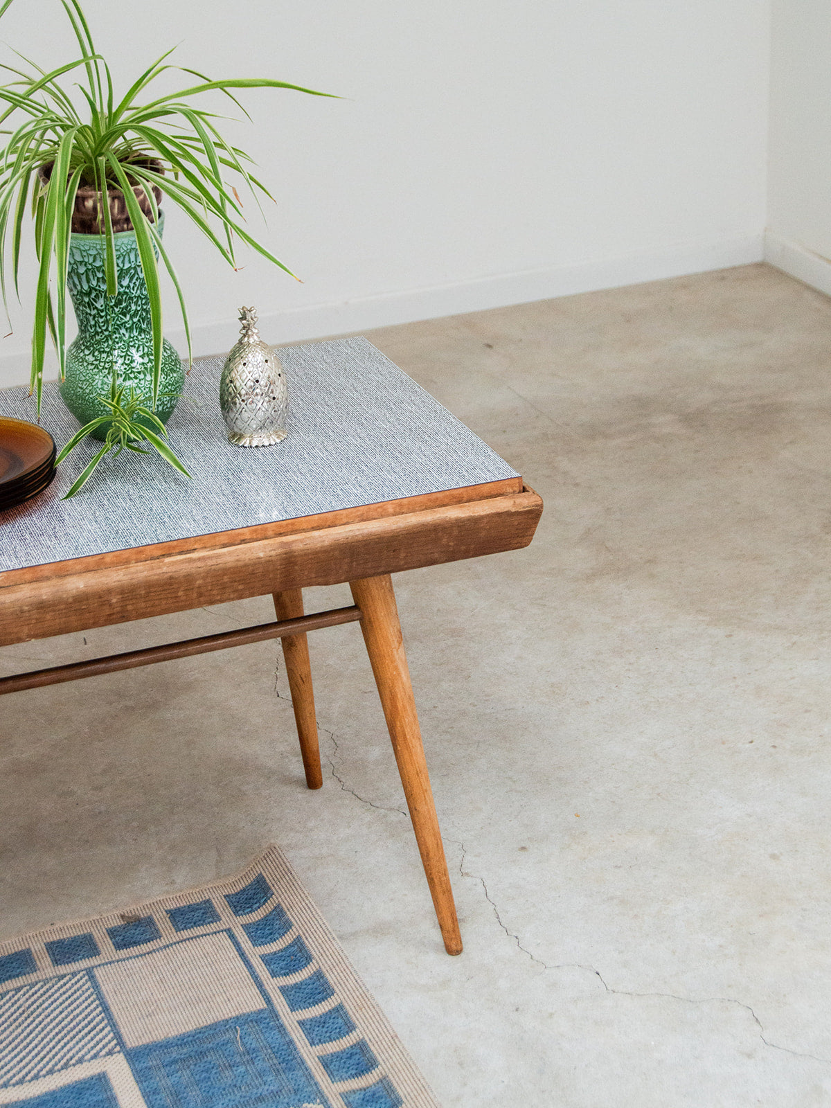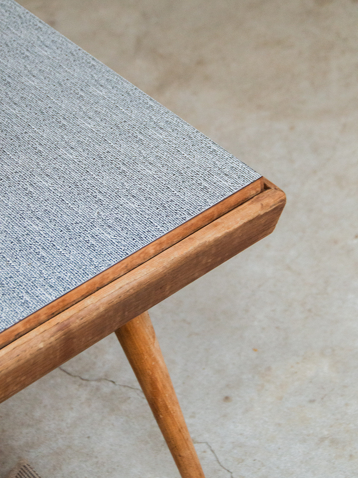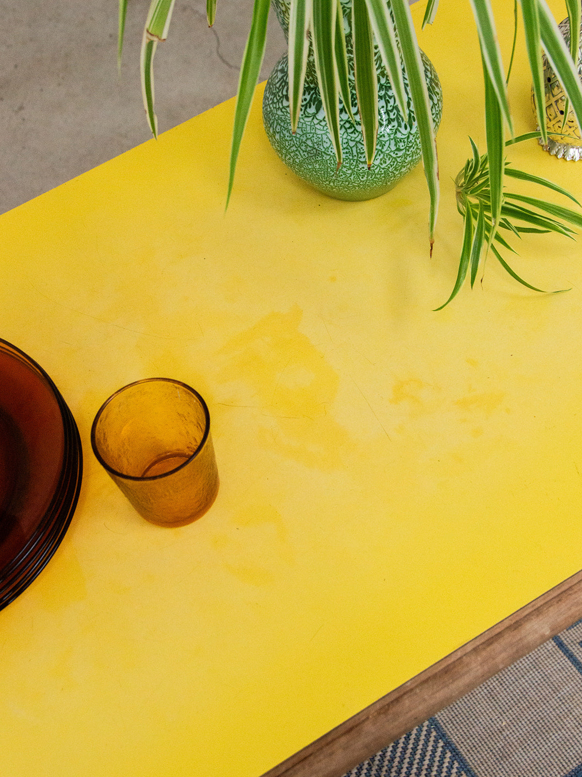 Bring a retro and practical touch to your home with this extra-tall side or coffee table. Its reversible yellow and gray Formica top offers two different ambiances to suit your tastes, while the wooden structure ensures strength and charm. With its signs of wear, it reveals its authentic, vintage character, perfect for complementing a living room or reading nook.