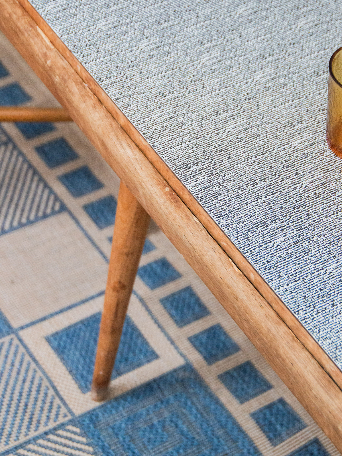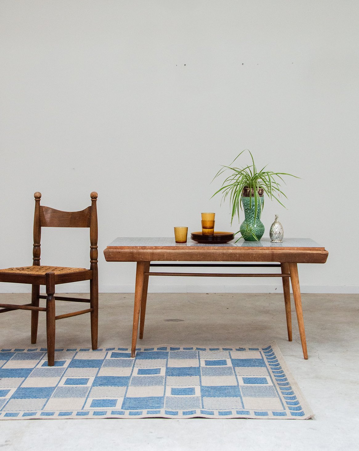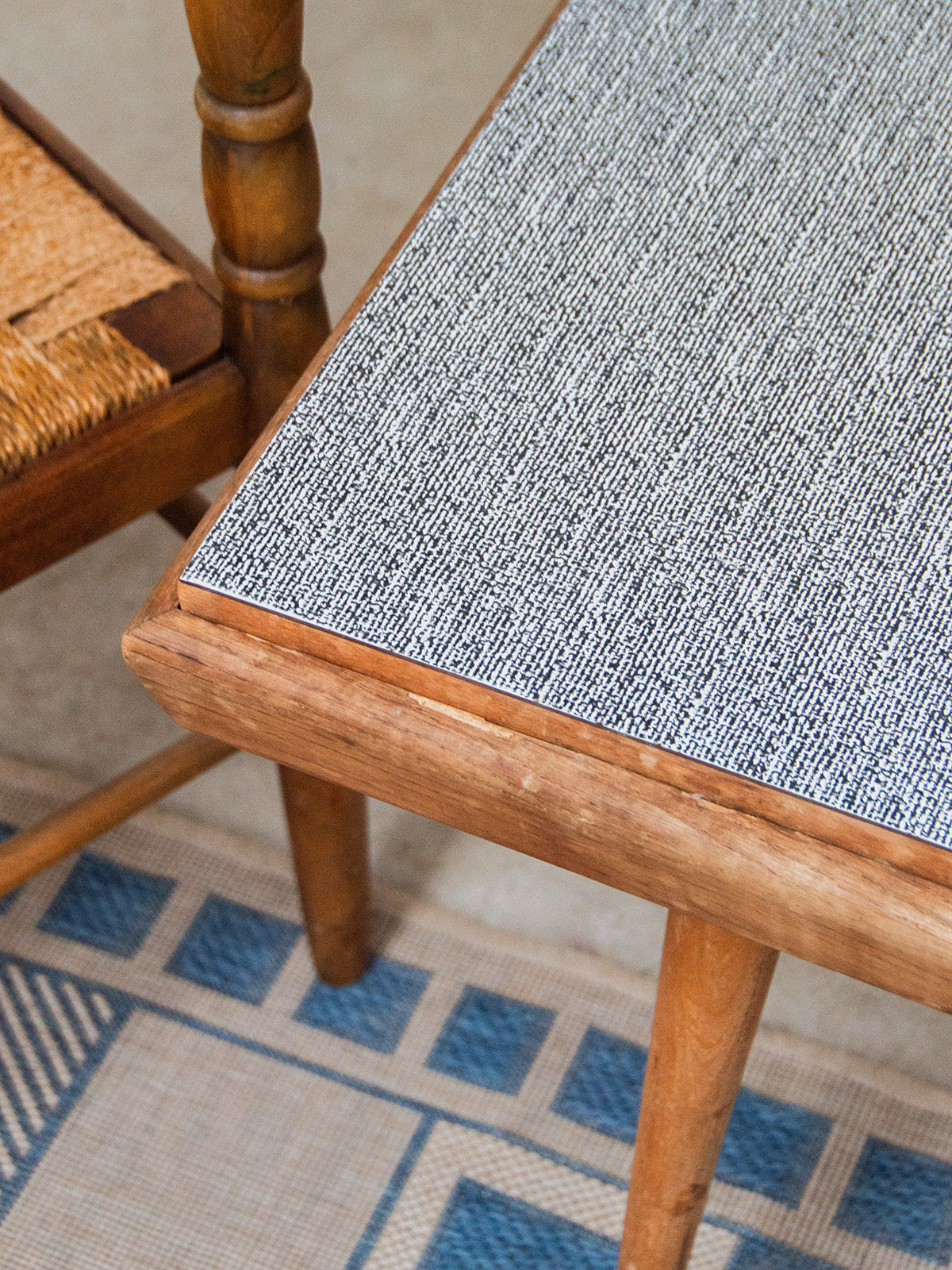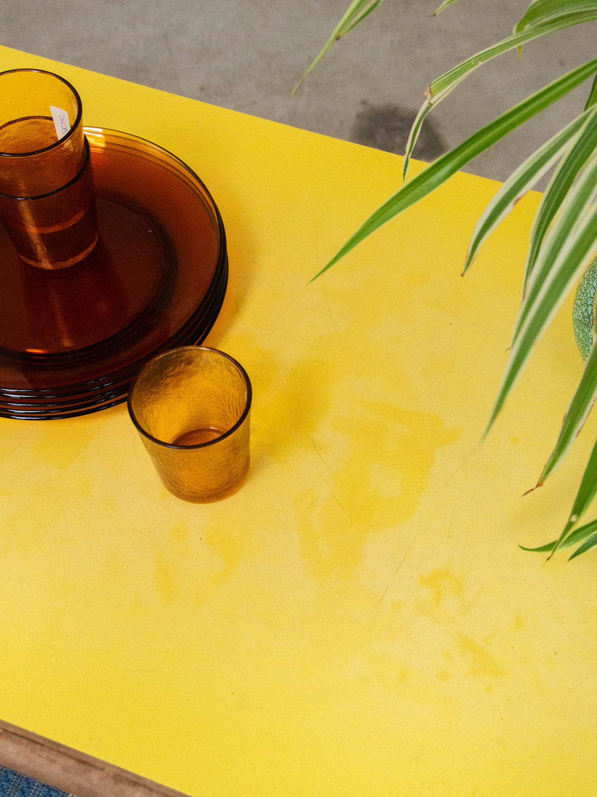 Bring a retro and practical touch to your home with this extra-tall side or coffee table. Its reversible yellow and gray Formica top offers two different ambiances to suit your tastes, while the wooden structure ensures strength and charm. With its signs of wear, it reveals its authentic, vintage character, perfect for complementing a living room or reading nook.