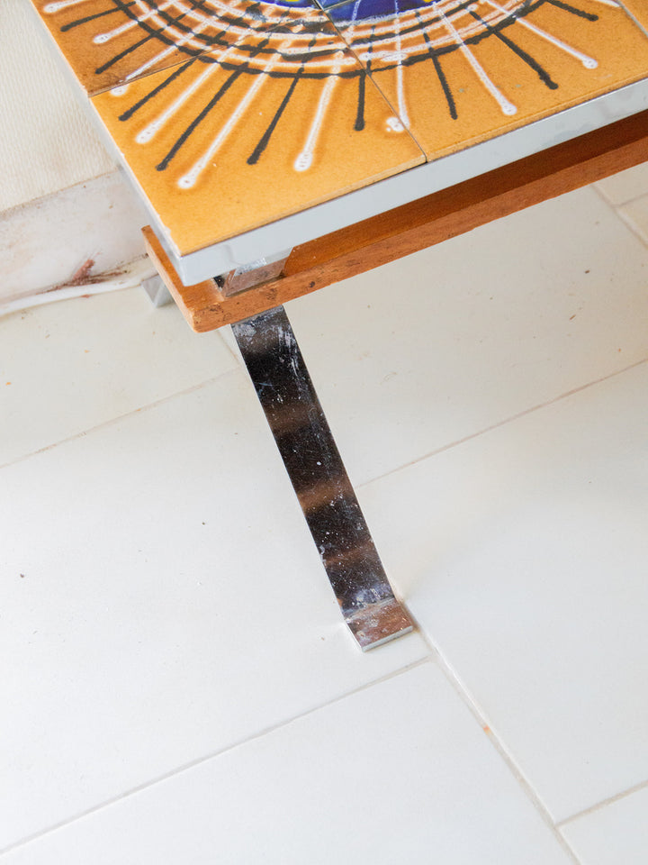 Bring a touch of elegance to your home with our orange and patterned earthenware tile coffee table. Its splayed, slim, and crossed metal legs offer a contemporary design, while the central bar under the tabletop ensures excellent stability. Perfect for holding your appetizers or favorite books, this table combines aesthetics and practicality. Ideal for brightening up your living room, it blends harmoniously with any style of decor.