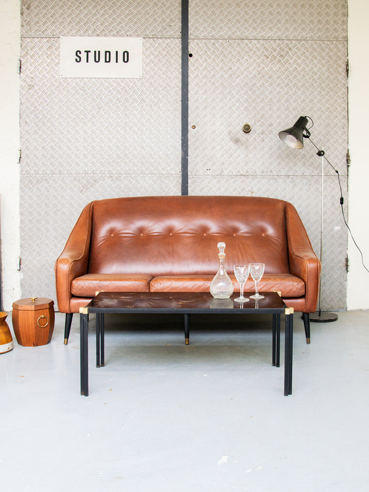 Bring a touch of elegance to your home with this Larco coffee table. Its metal frame, accented by brass details, gives it a unique look. The black glass top, embellished with orange and gold accents, creates a beautiful visual contrast. Although it shows some slight signs of wear, it remains a statement piece. An ideal choice for those seeking both functionality and style.