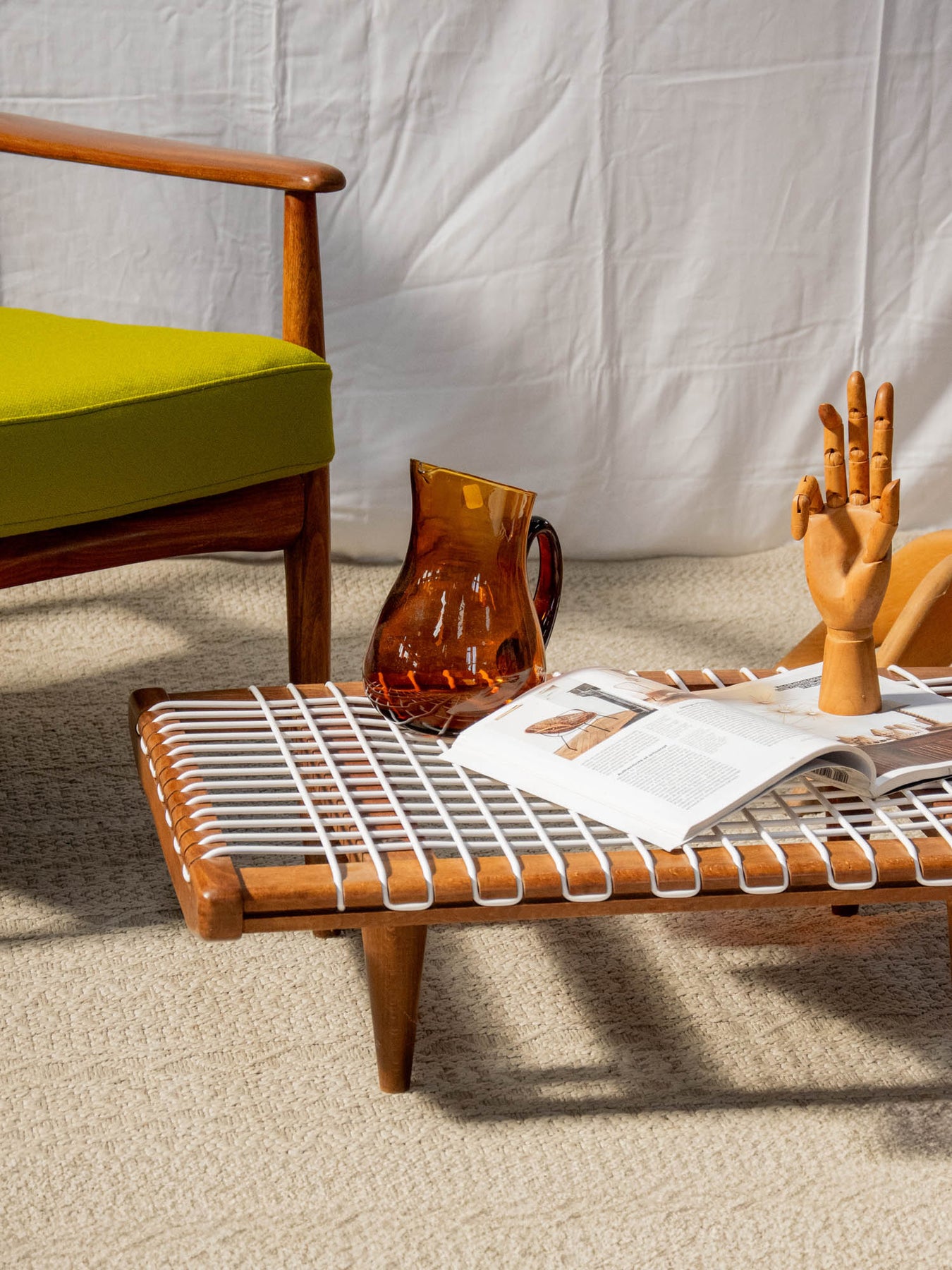 Discover this uniquely designed, ultra-low coffee table that will add a modern touch to your home. Its white scoubidou string top combines lightness and originality, while its wooden structure ensures strength and elegance. Ideal for contemporary spaces, this table is just as suitable for relaxing moments as it is for drinks with friends. Adopt a bold style while maintaining simplicity!