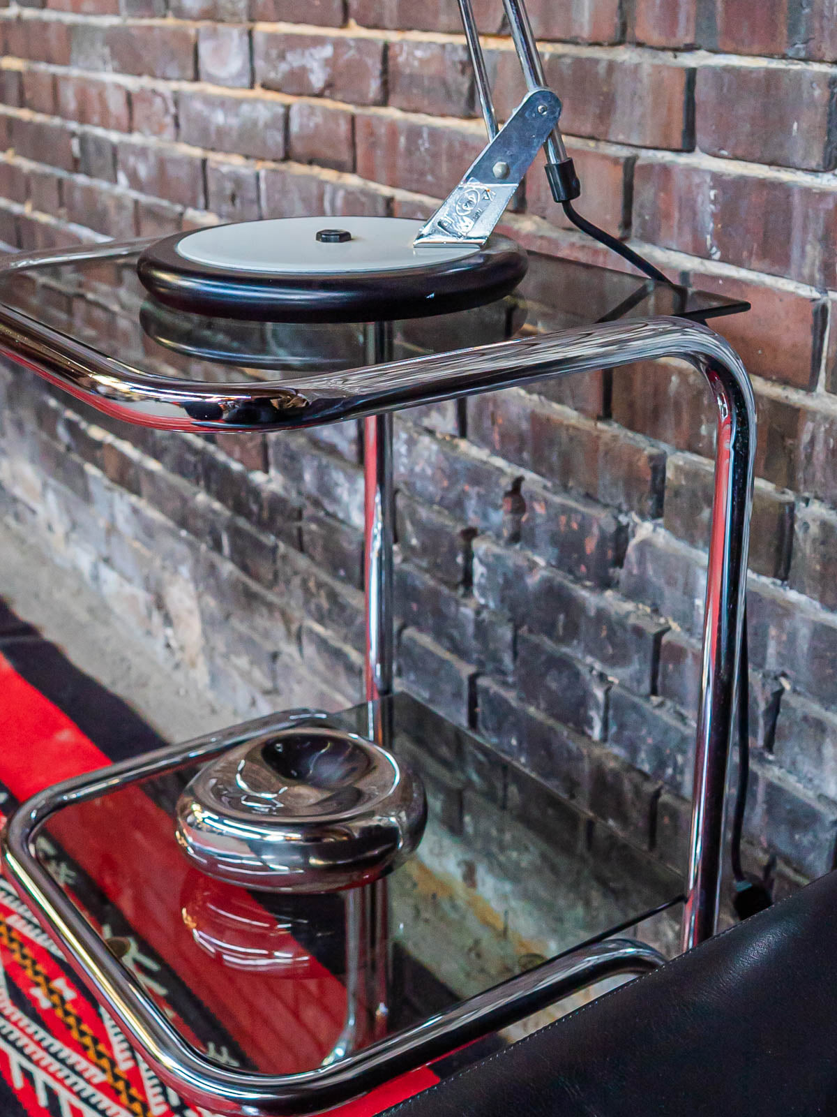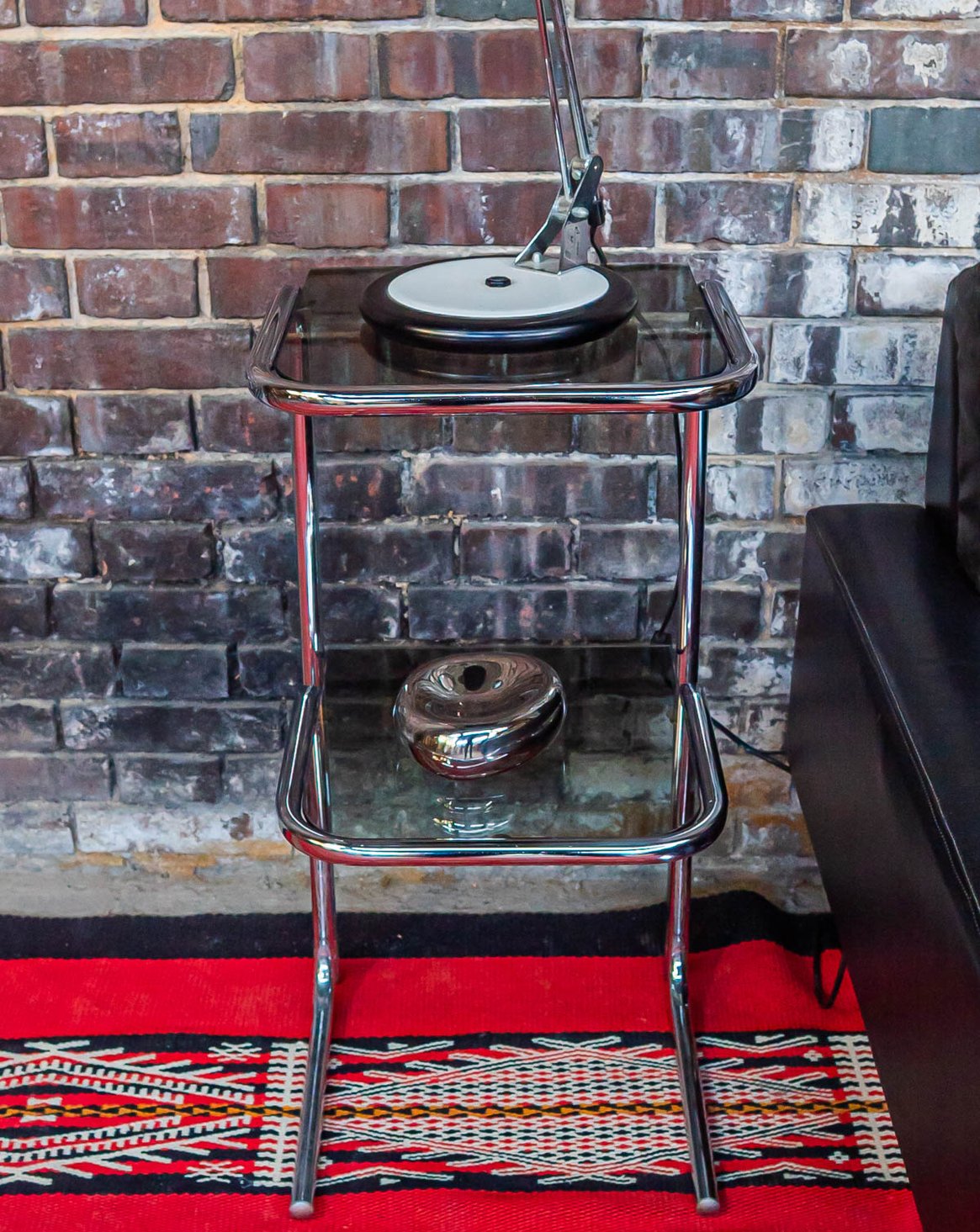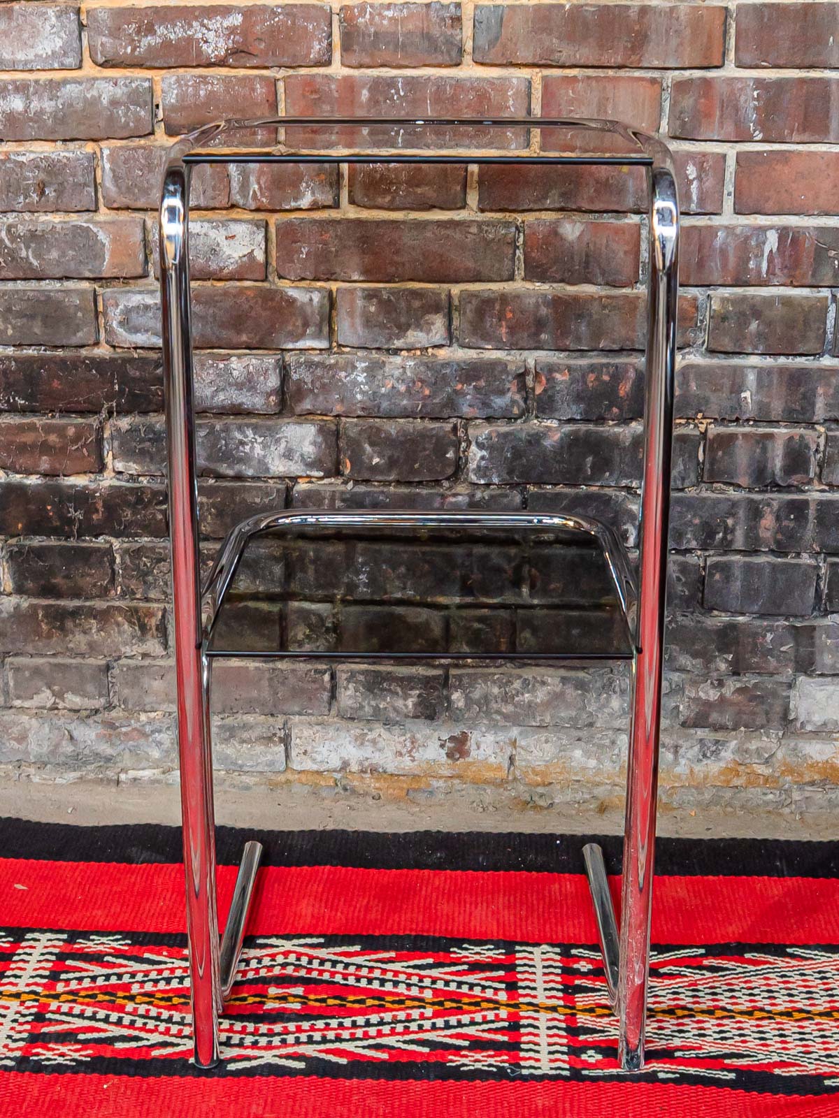 Discover this elegant 80s side table, combining retro style with modern functionality. With its two levels of smoked glass tops, it offers an ideal space to showcase your decorative objects or favorite books. Its chrome-plated metal legs add a touch of shine while ensuring perfect stability. A must-have asset to add a touch of sophistication to your interior.