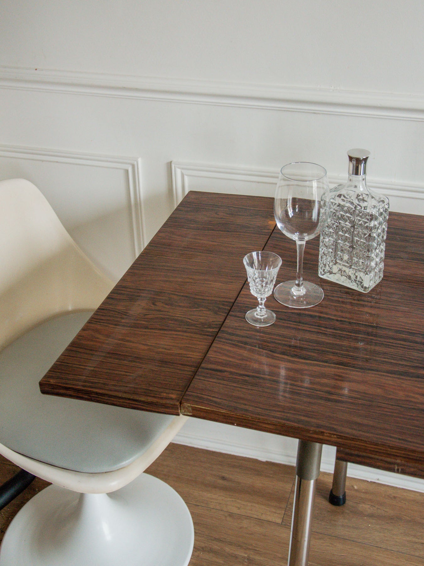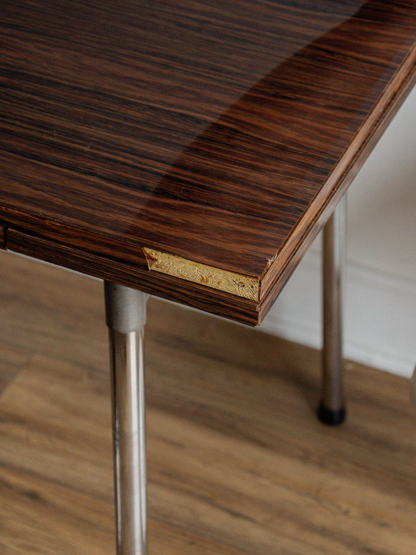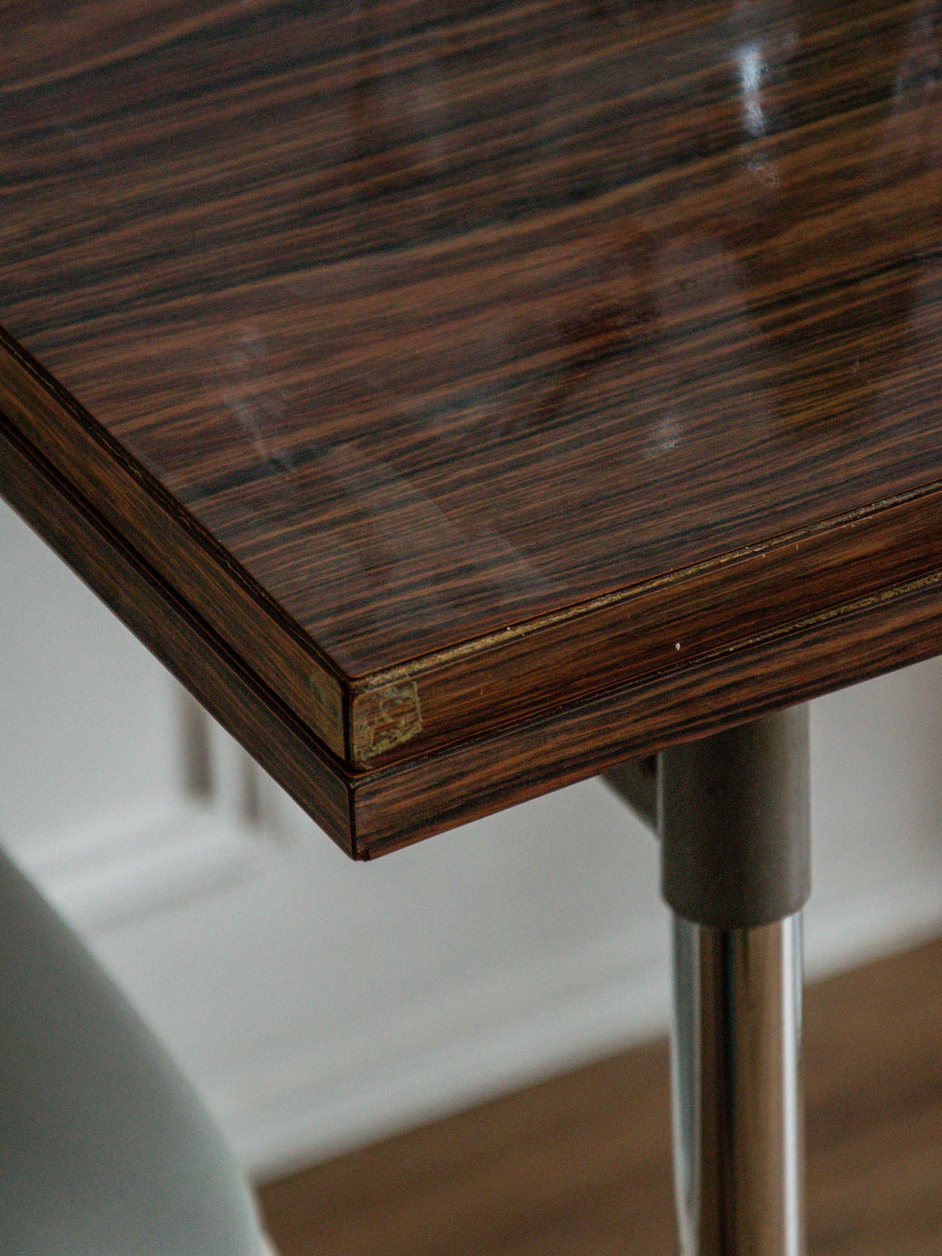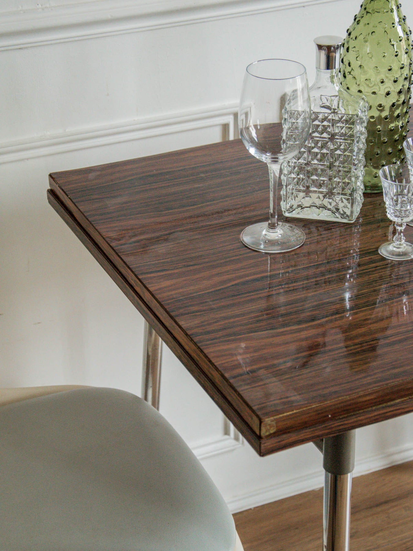 Discover this elegant brown Formica dining table, which will bring a retro touch to your interior. Practical and functional, it is equipped with extensions to accommodate your guests. Note that a few small imperfections on the edge of the tabletop, visible in the photos, add character to this unique piece. Ideal for meals with family or friends, this table combines aesthetics and conviviality for 2 to 4 people.