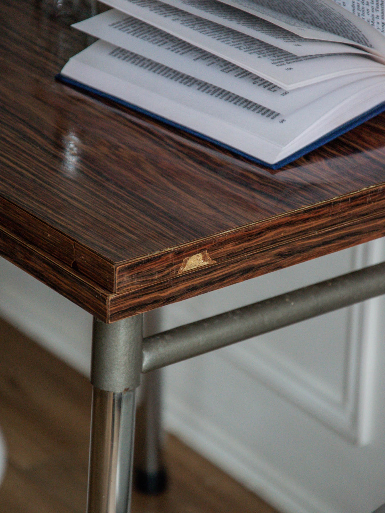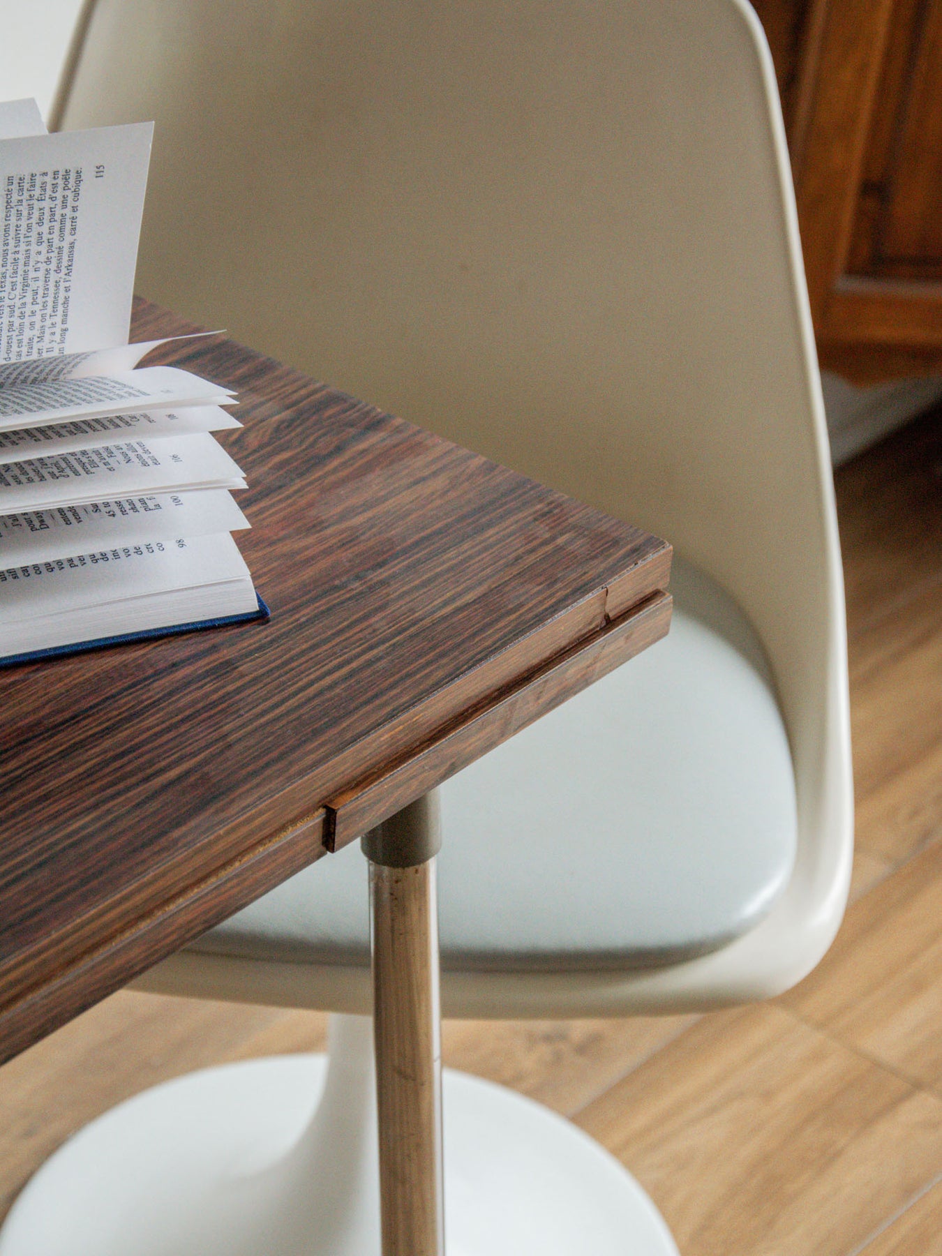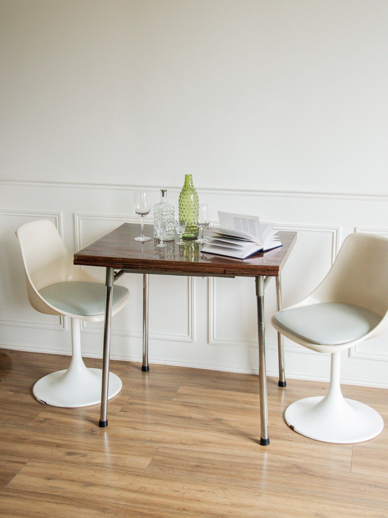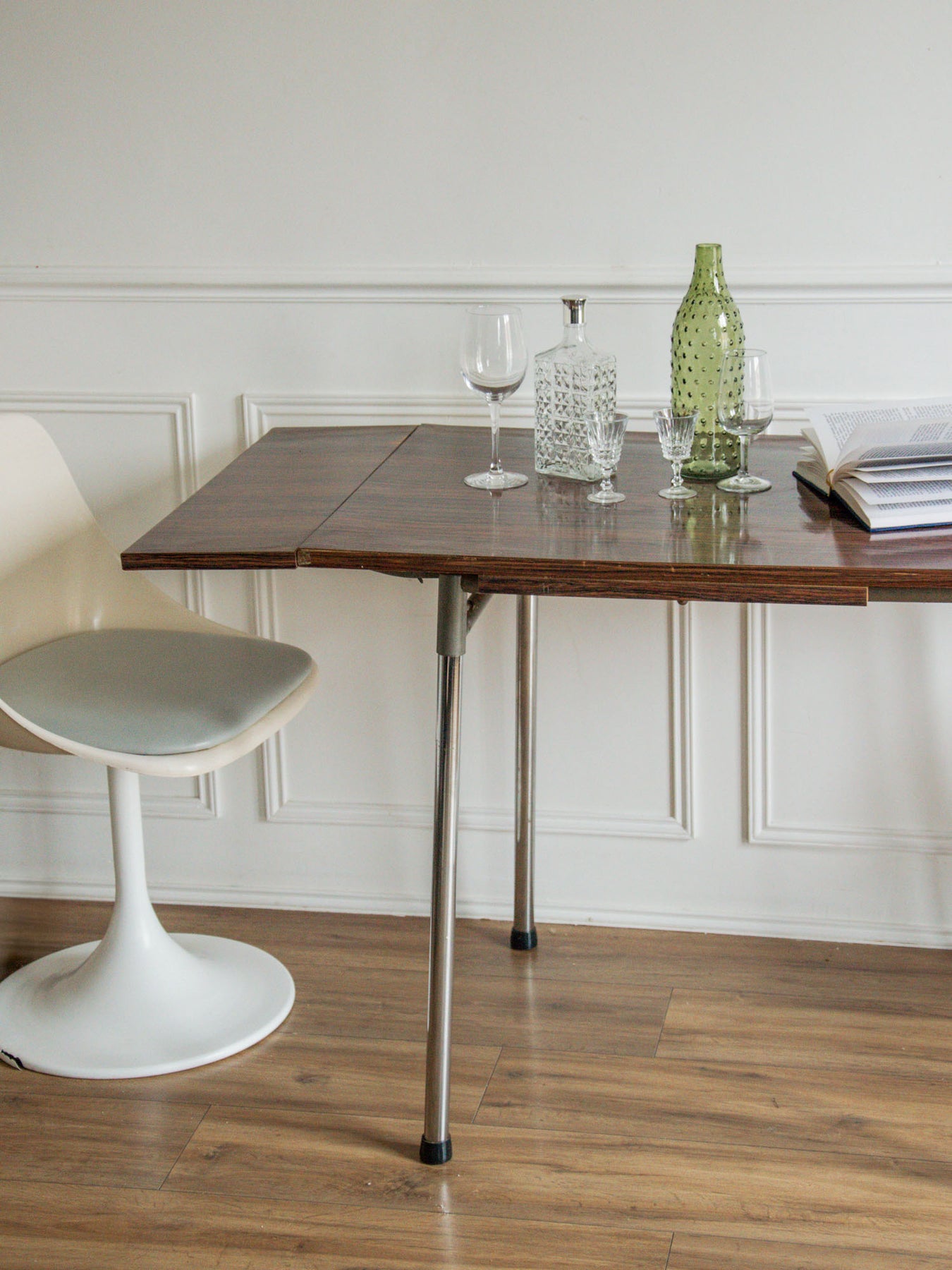 Discover this elegant brown Formica dining table, which will bring a retro touch to your interior. Practical and functional, it is equipped with extensions to accommodate your guests. Note that a few small imperfections on the edge of the tabletop, visible in the photos, add character to this unique piece. Ideal for meals with family or friends, this table combines aesthetics and conviviality for 2 to 4 people.