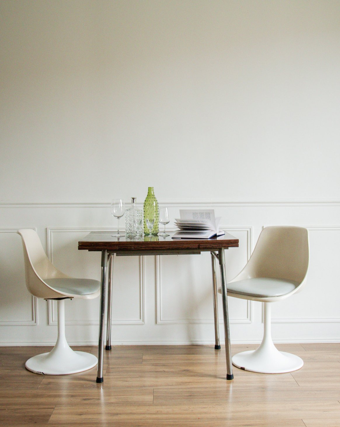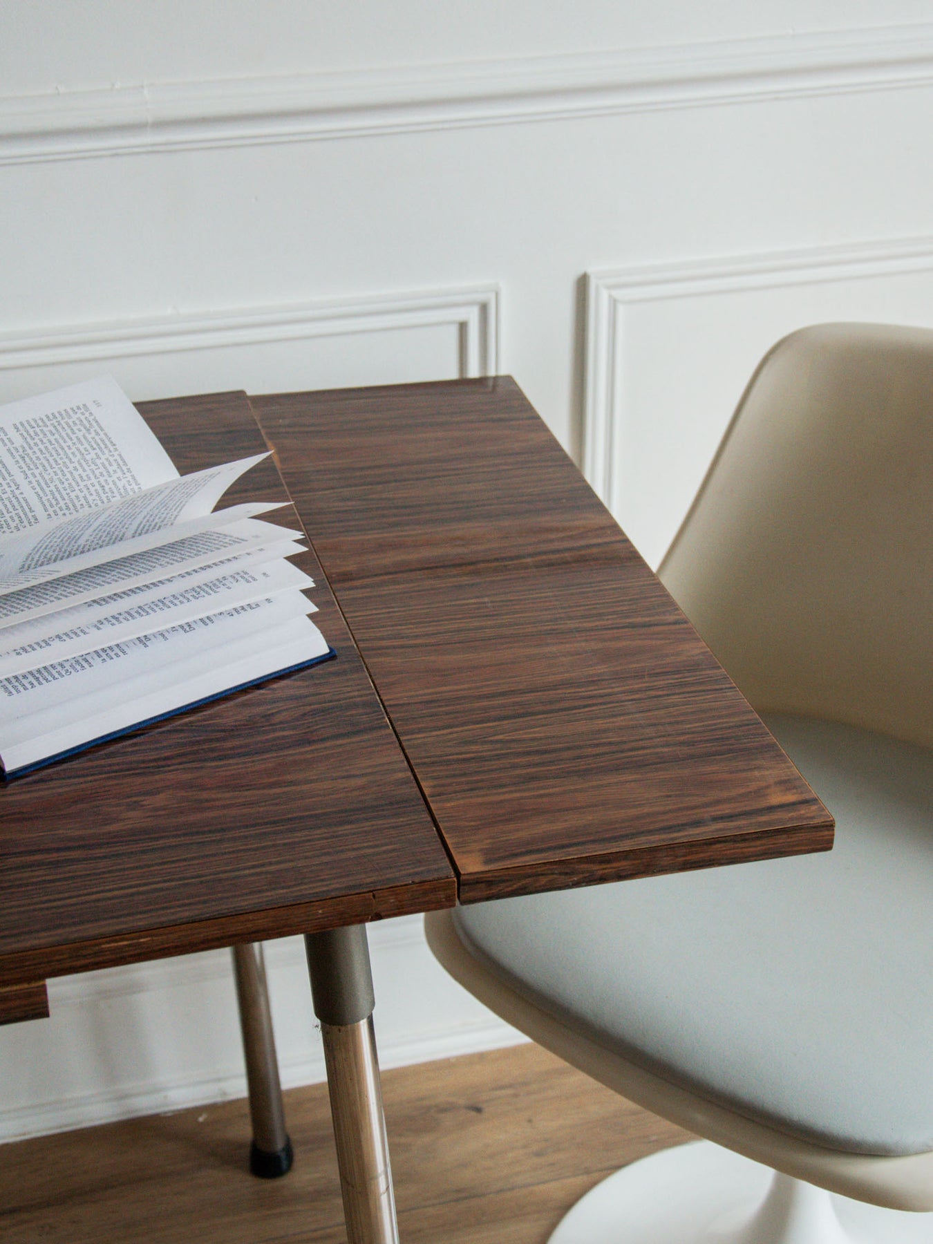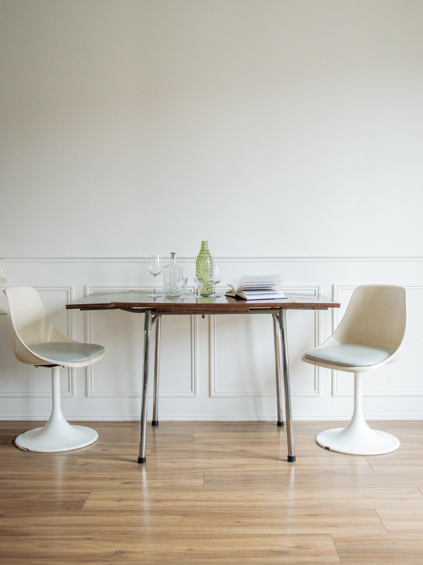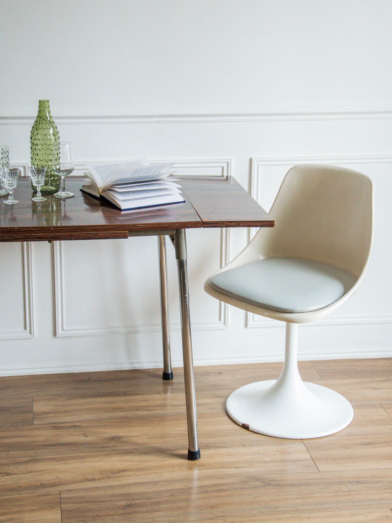 Discover this elegant brown Formica dining table, which will bring a retro touch to your interior. Practical and functional, it is equipped with extensions to accommodate your guests. Note that a few small imperfections on the edge of the tabletop, visible in the photos, add character to this unique piece. Ideal for meals with family or friends, this table combines aesthetics and conviviality for 2 to 4 people.