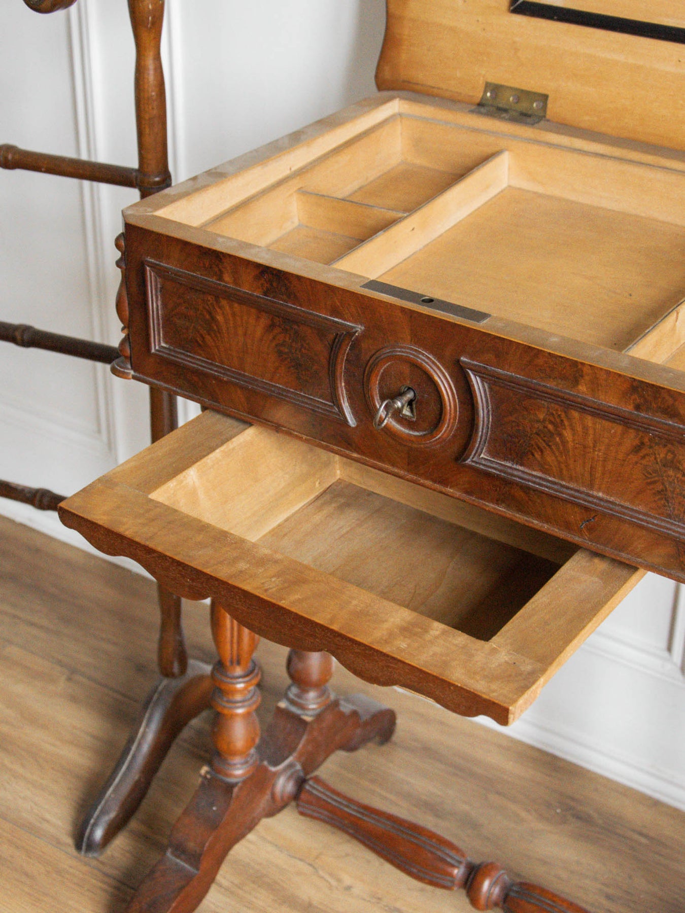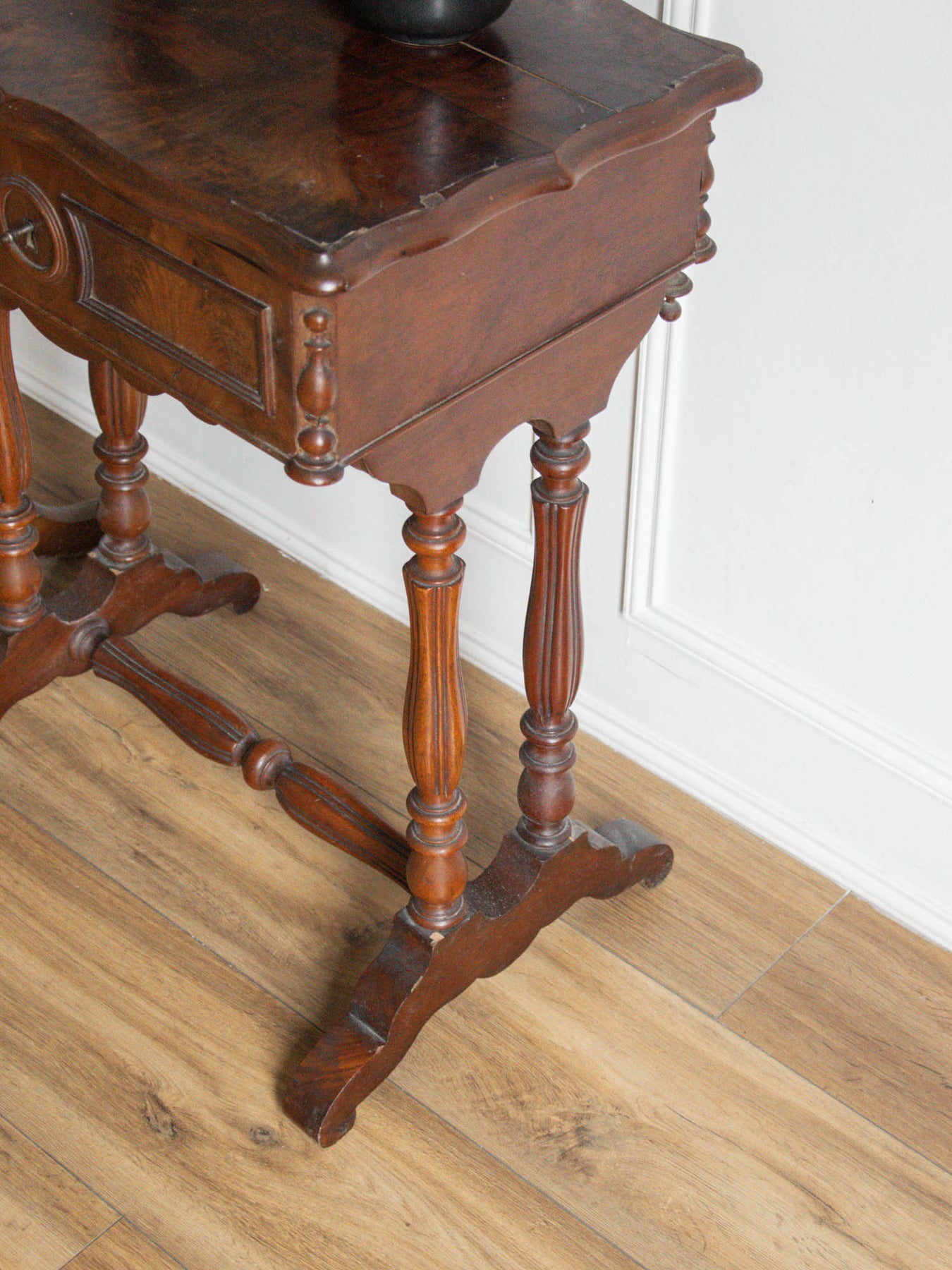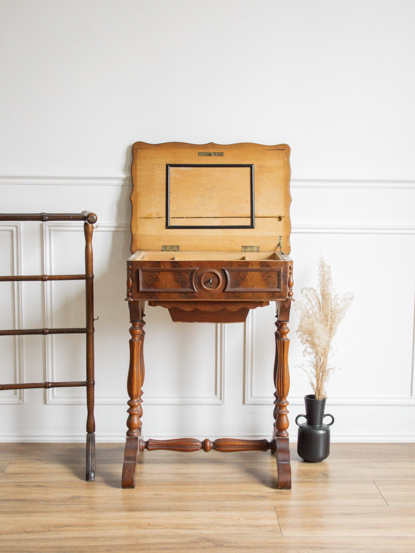 Bring a touch of elegance to your space with this refined wooden dressing table. Featuring clever storage, it keeps your accessories close at hand while adding a decorative touch thanks to its beautifully crafted key. Note that the top no longer fits perfectly, which prevents the dressing table from closing completely, and it no longer has a mirror. Despite this slight flaw, it remains a must-have for creating a warm and functional beauty area.