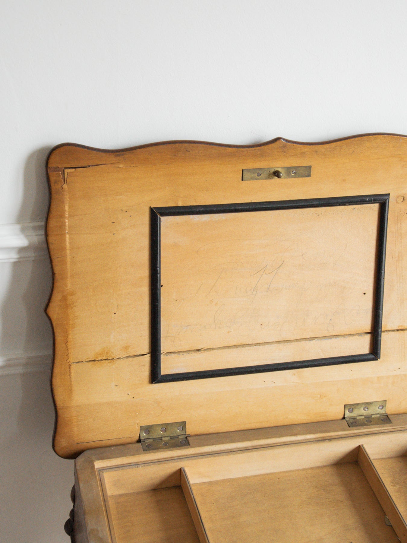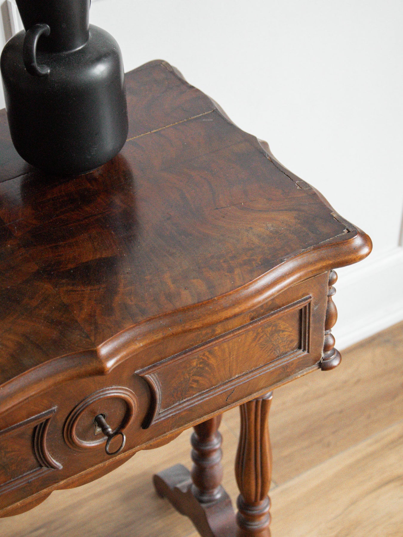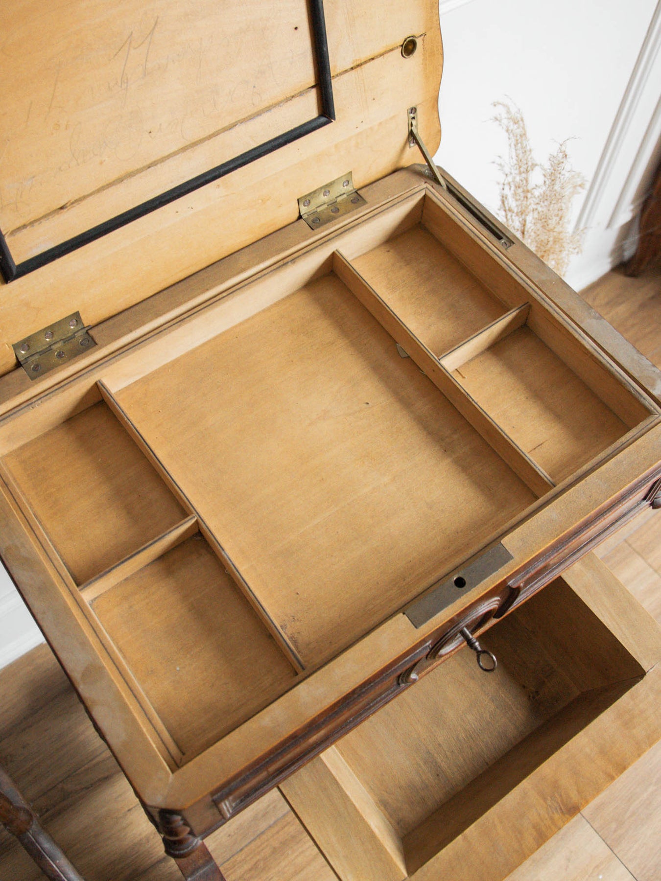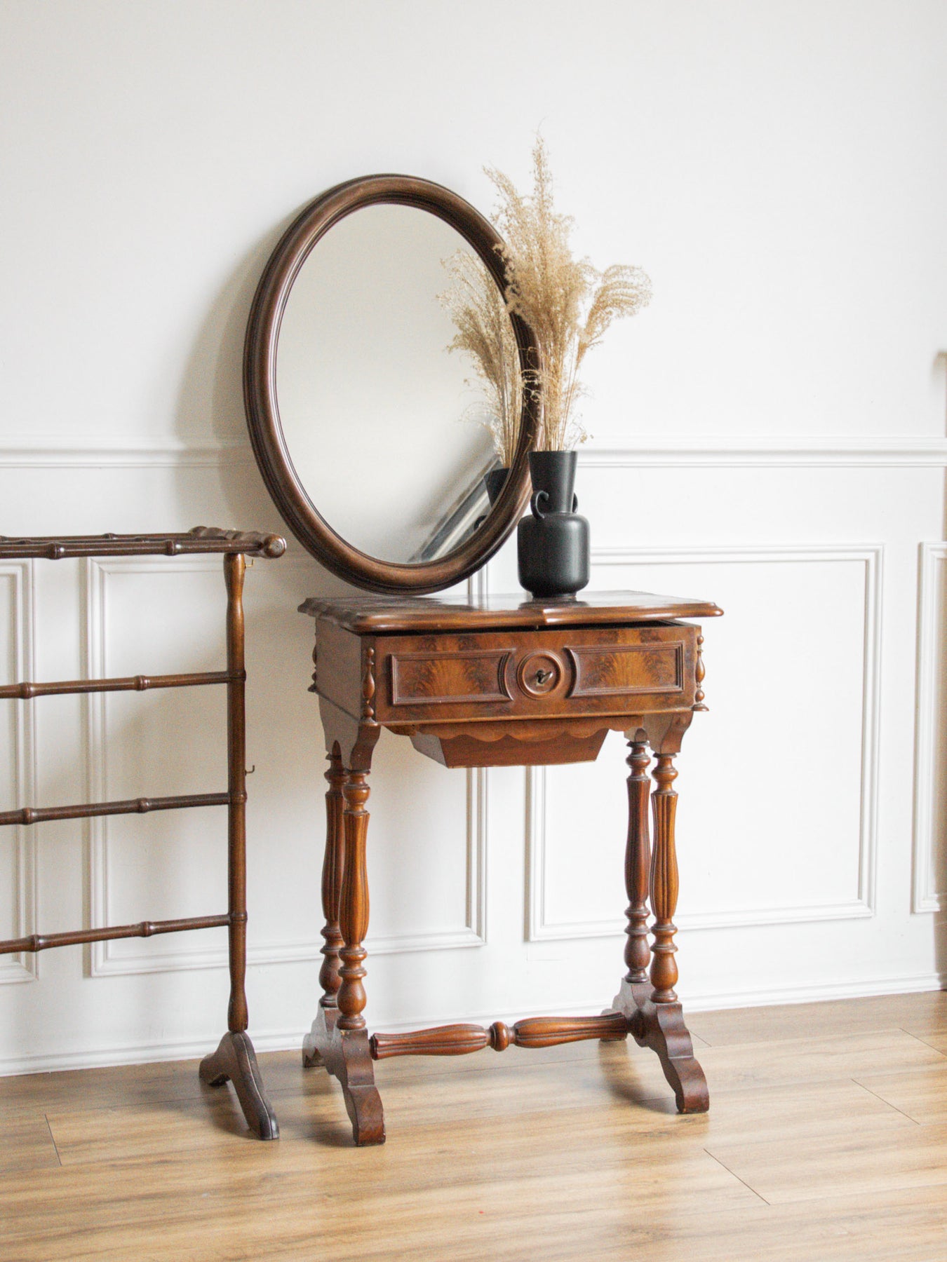 Bring a touch of elegance to your space with this refined wooden dressing table. Featuring clever storage, it keeps your accessories close at hand while adding a decorative touch thanks to its beautifully crafted key. Note that the top no longer fits perfectly, which prevents the dressing table from closing completely, and it no longer has a mirror. Despite this slight flaw, it remains a must-have for creating a warm and functional beauty area.