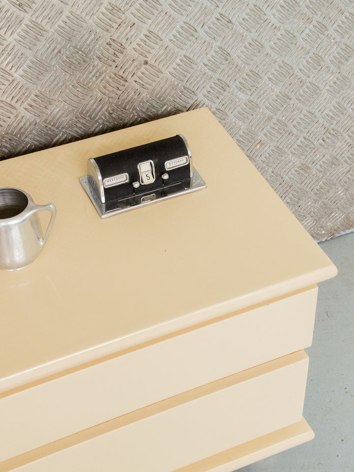 Discover this pair of off-white lacquered wood nightstands with a glossy finish that beautifully captures the light. Each features two practical drawers, perfect for keeping your essentials close at hand. Their simple, clean lines blend easily into a contemporary or vintage bedroom. Some signs of age are visible, without detracting from their overall elegance. A discreet and functional pair to complete your sleeping space in style.
