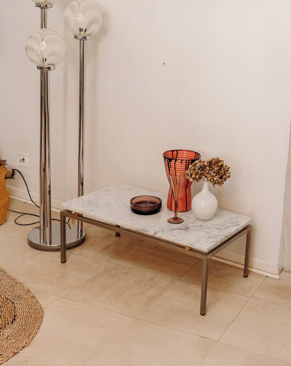 Discover this elegant vintage rectangular marble and brass coffee table, inspired by Florence Knoll's iconic creations for Knoll Editions in the 1970s. Its marble top, although marked by some light scratches and slightly damaged corners, testifies to the time and authenticity of the piece. This table, with its square brass base, will fit perfectly into a Haussmann-style interior, highlighting the dazzling whiteness of the marble and the charm of the old parquet floors. Give your living room a touch of timeless elegance with this beautiful piece with its unique character.