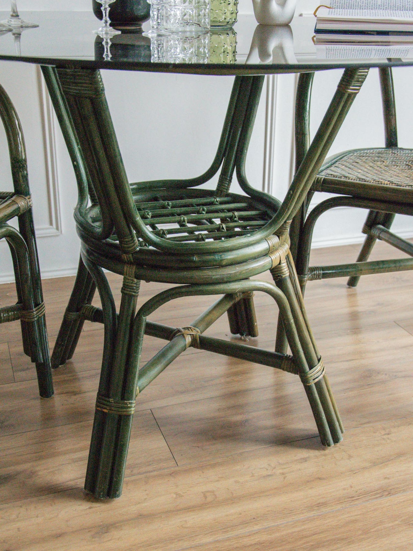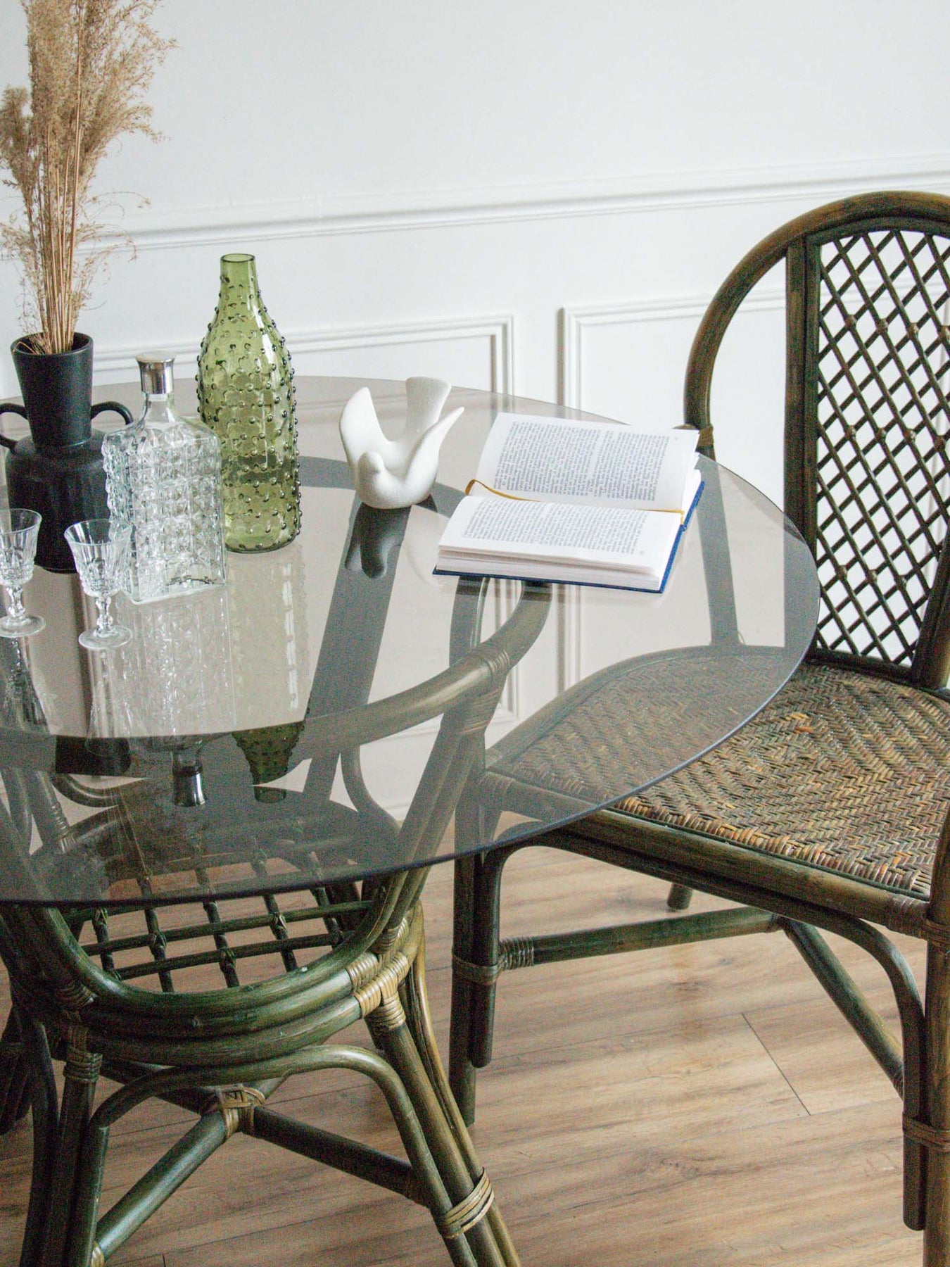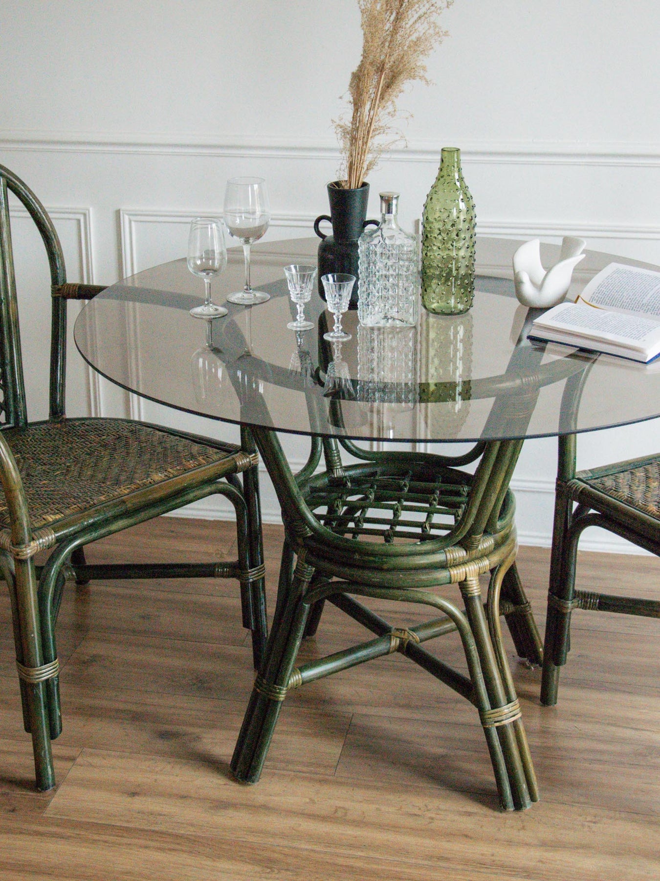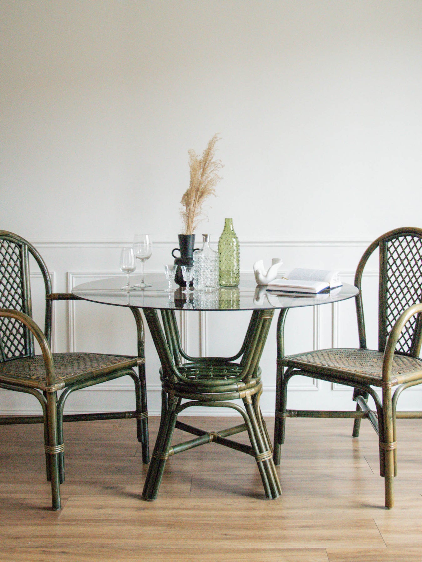 Bring a touch of elegance to your dining room with this beautiful green rattan dining table. Featuring a round smoked glass top, it comfortably seats up to four guests, perfect for your convivial meals. Pair it with the Ernest No. 557 green rattan dining chair for a harmonious and stylish space. Its timeless design and meticulous finish make it a must-have for all lovers of refined decor.