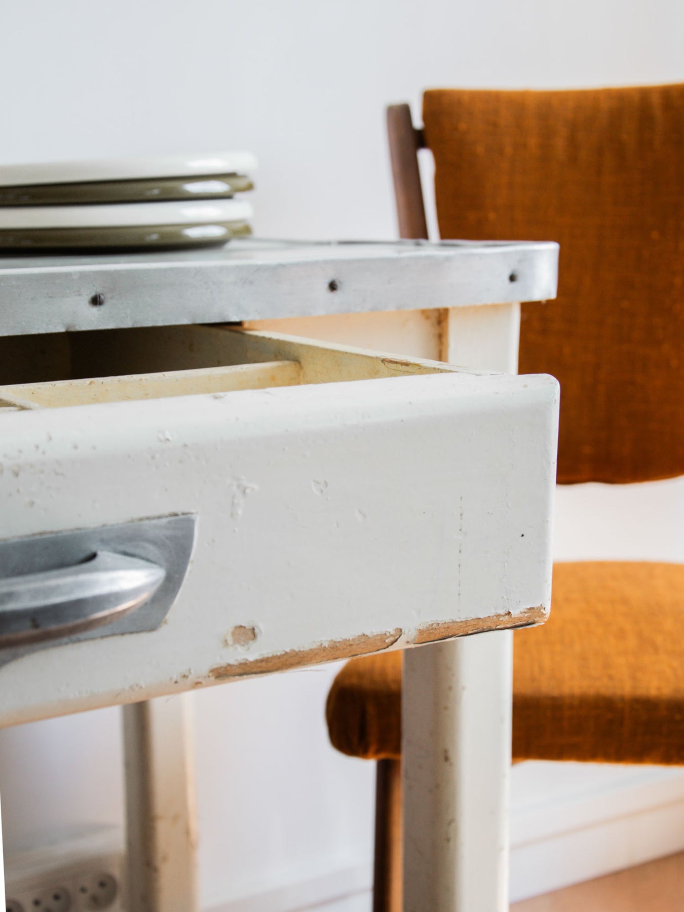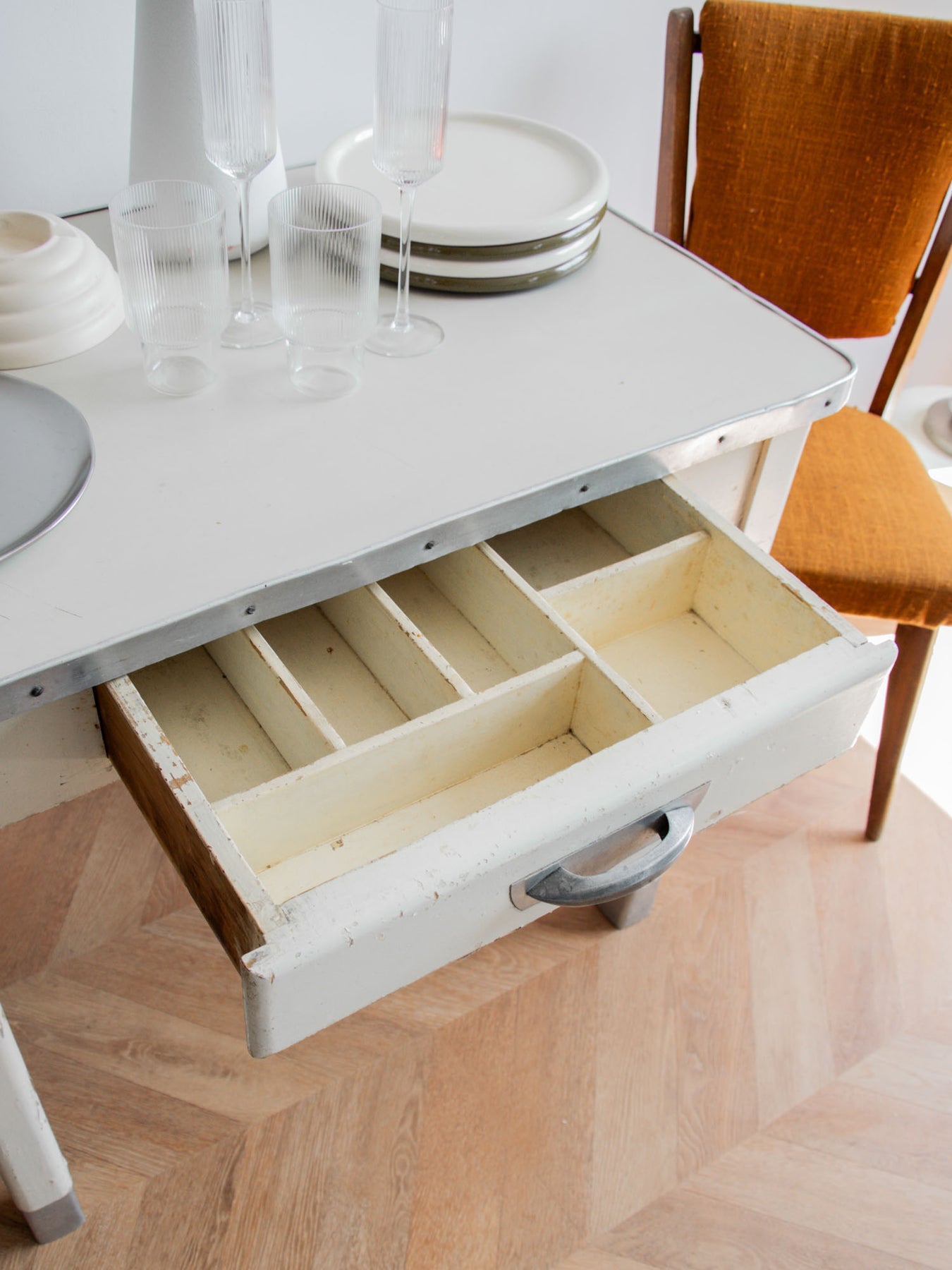 Bring a touch of authenticity to your home with this stunning wooden farmhouse table, delicately painted white and weathered by time. Its aluminum frame ensures lasting strength, while its compartmentalized drawer, adorned with an elegant metal handle, offers functional storage. Perfect for seating up to four guests, it combines country charm and practicality, embodying the essence of convivial meals in a piece of furniture with a unique character.