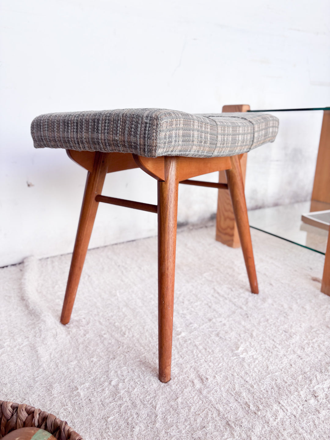 Add a vintage touch to your home with this beautiful 1960s Czech stool. Featuring iconic compass legs, it combines retro aesthetics with modern comfort. Its original fabric seat features a warm pattern that will add character to your decor. A must-have for design lovers looking to combine style and functionality.