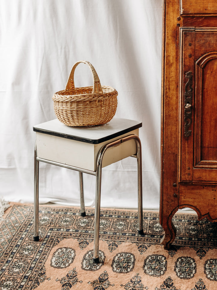 Transform your home with this gray Formica trunk stool with chrome legs, an iconic piece with retro charm. With some signs of age, it tells a beautiful story while providing practical storage space. Its elegant design and neutral color blend easily into any decor, bringing a vintage touch to your space. An ideal choice for combining style and functionality!