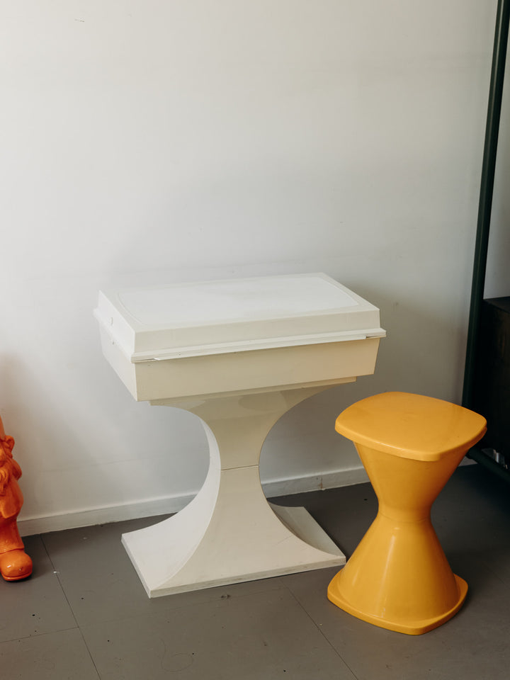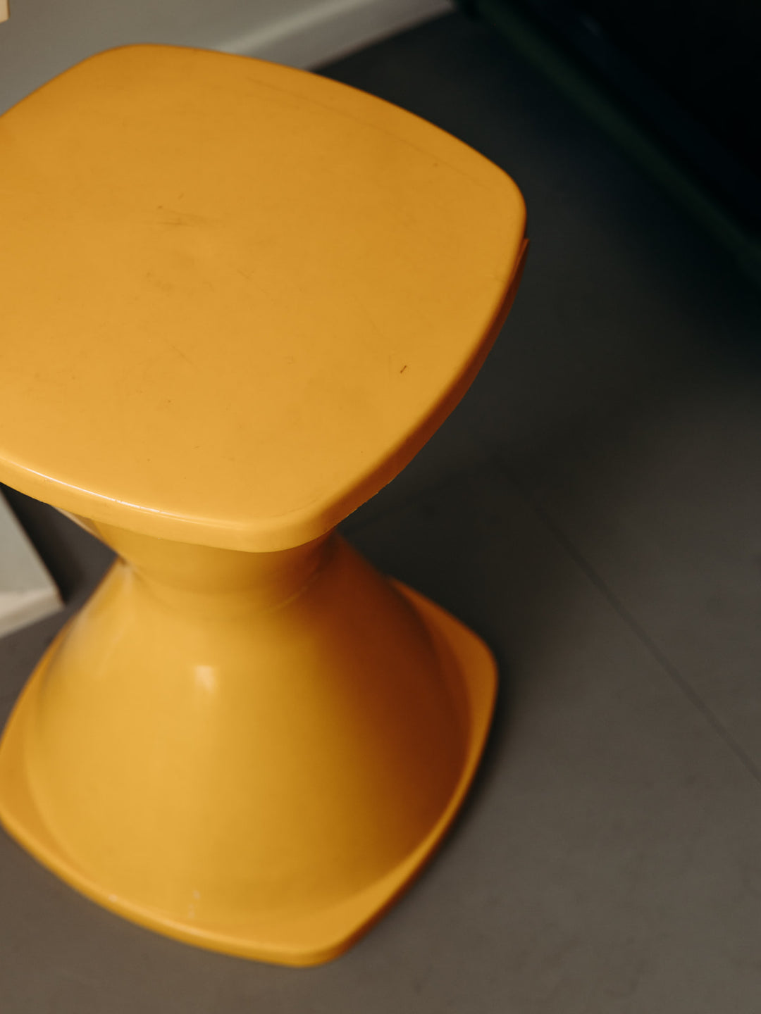 Add a contemporary touch to your home with this yellow plastic stool featuring a bold hourglass design. Its elegant curves and vibrant color make it perfect for brightening up any room. While some signs of wear are visible, they demonstrate the unique character of this piece. Practical and stylish, this stool will work equally well indoors and outdoors.