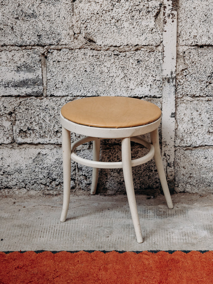 Discover this vintage-style stool, featuring a brown leatherette seat and an ecru wood frame. Its curved legs give it a unique and elegant silhouette while ensuring good stability. Compact and easy to move, it fits equally well in a kitchen, living room, or entryway. Ideal as an occasional seat or decorative element. A charming piece with a bold retro style.