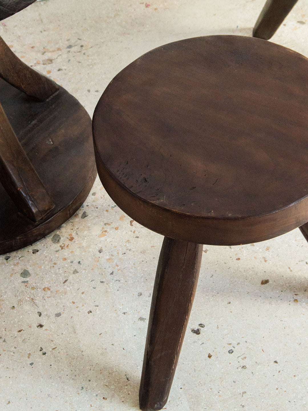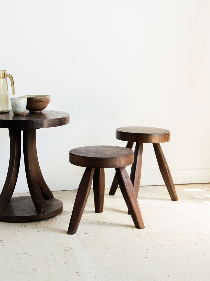 Discover this low, teak tripod stool with its sleek, warm design. Its flat seat highlights the wood's finesse and natural hue. Stable and discreet, it can be used as an occasional seat or decorative piece. Its timeless style easily fits into any interior. A beautiful, authentic object that's both practical and aesthetically pleasing. Made from recycled wood, 10 pieces were created!