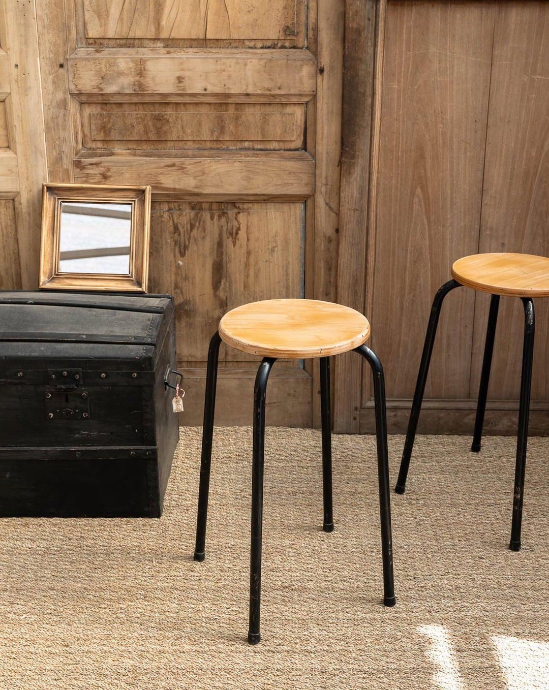 Bring a retro touch to your home with this set of two vintage stools. Featuring a stylish and comfortable wooden seat, their sturdy metal frame ensures optimal durability while adding character to your decor. Perfect for a bar, kitchen, or living room, these stools complement any style and create a welcoming atmosphere. An ideal choice for combining aesthetics and practicality in your living space.