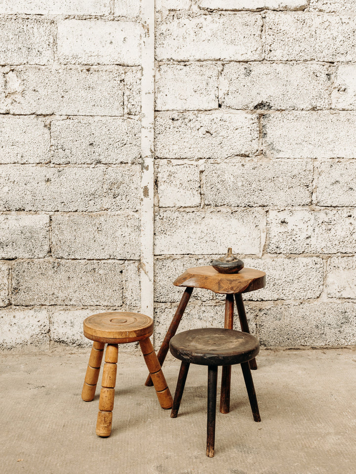 Discover this brutalist wooden stool with a tripod design and an original U-shape, which will bring a touch of authenticity to your interior. Although it has a small stain and dent, it has been treated and remains in good overall condition. Its pitted wood adds character and testifies to its history. A practical and elegant piece, perfect for those who appreciate the charm of vintage furniture. Ideal for complementing a simple and natural decor.