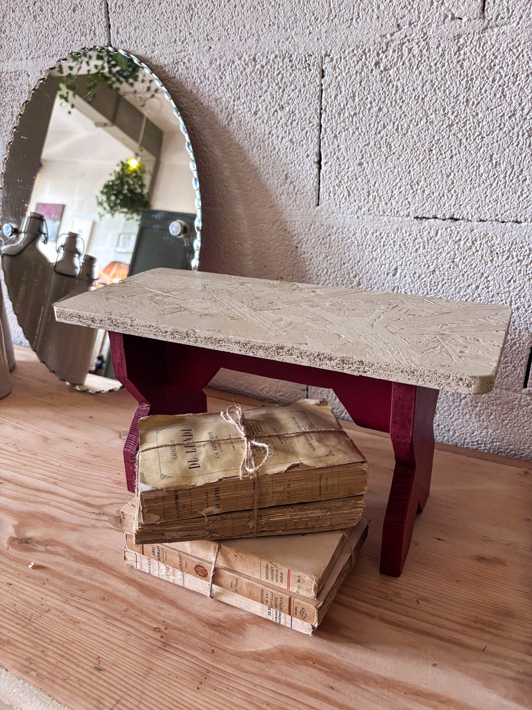 Bring a rustic touch to your home with this small antique wooden stool, delicately painted in white and red. Its charming design evokes the spirit of the countryside, making it both a practical and decorative accessory. Ideal for a reading nook or as an occasional seat, this stool will blend in with any decor style, while adding a warm and authentic touch. Each piece is unique, bearing witness to its history and artisanal expertise.