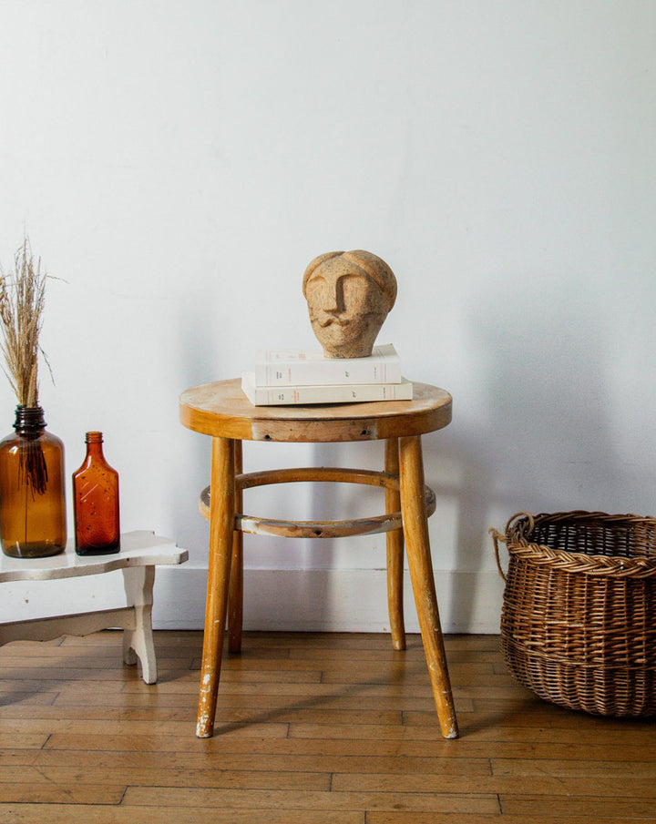 Discover this light wood stool inspired by the Baumann style, combining simplicity and elegance. Its two curved legs give it a unique and lightweight silhouette. Despite some signs of wear, it remains sturdy and functional. Perfect for adding a vintage touch to your home or complementing a dining area. A practical piece of furniture with authentic charm.