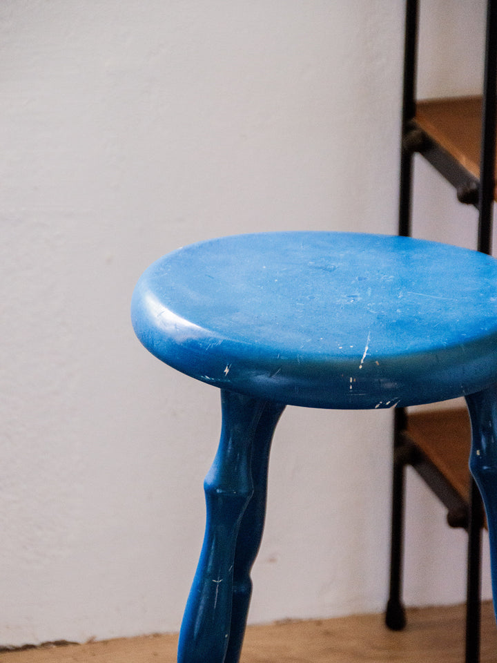 Discover this wooden tripod stool, beautifully repainted in blue for a touch of character. Its sculpted legs give it a unique, handcrafted charm. The round seat offers a soft and welcoming shape. A few signs of wear highlight its authenticity. Ideal as an extra seat or a decorative object full of personality.