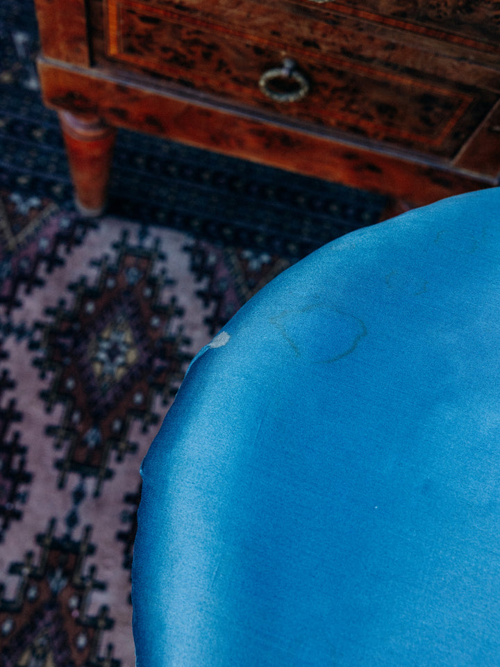Rediscover the charm of vintage furniture with this wooden stool with fluted legs, combining elegance and authenticity. Its delicately engraved seat is upholstered in a satin blue fabric, bringing a chic touch to your home. The slight marks of time bear witness to its history without altering its unique look. An ideal accessory to enhance your decor with refinement.