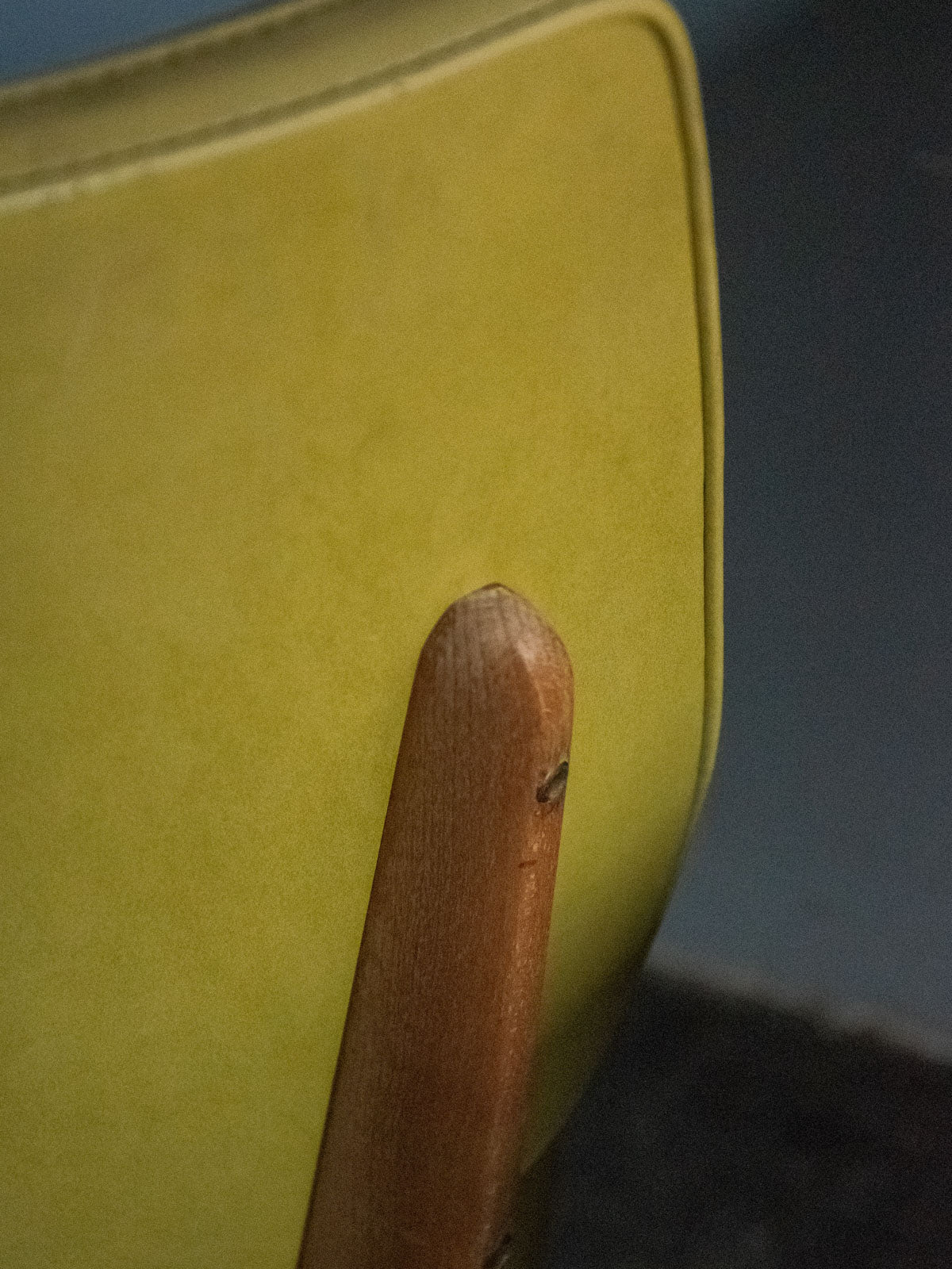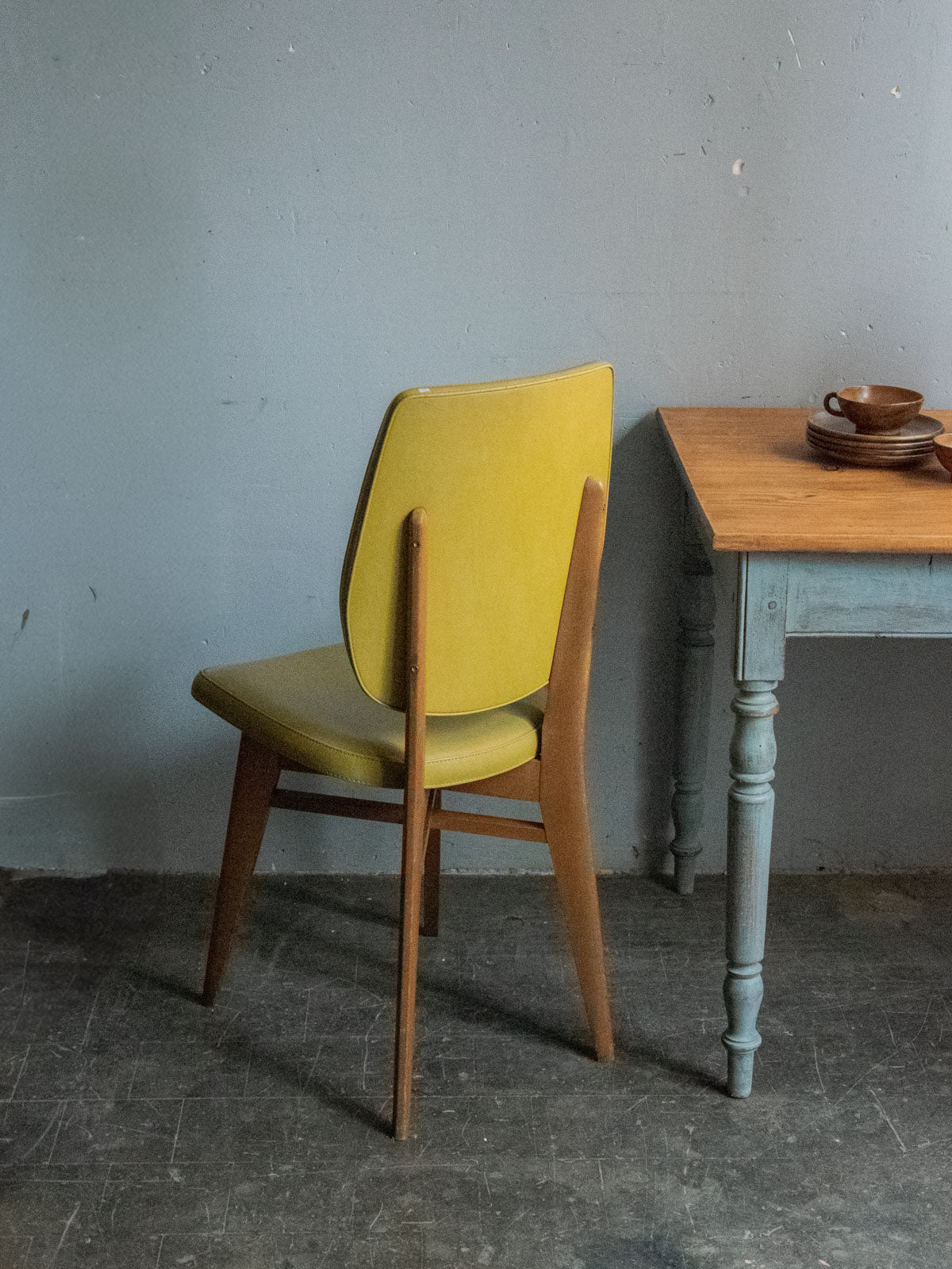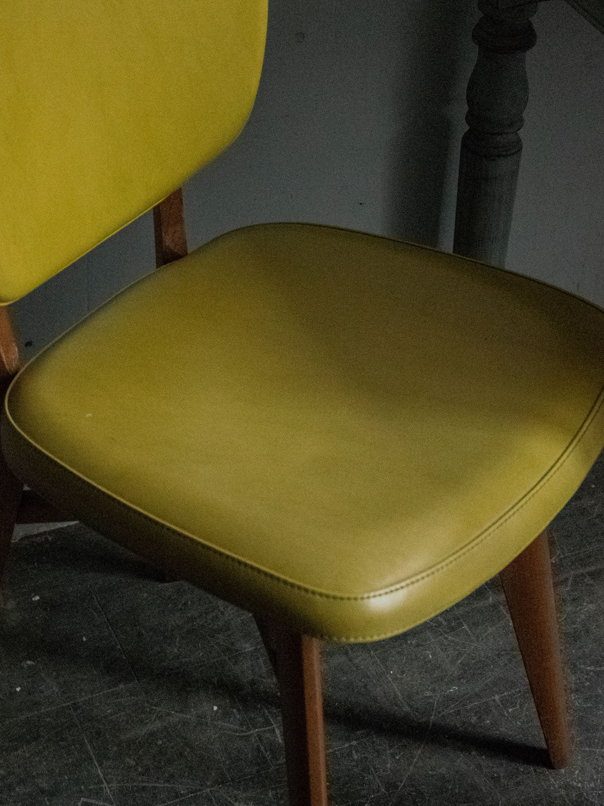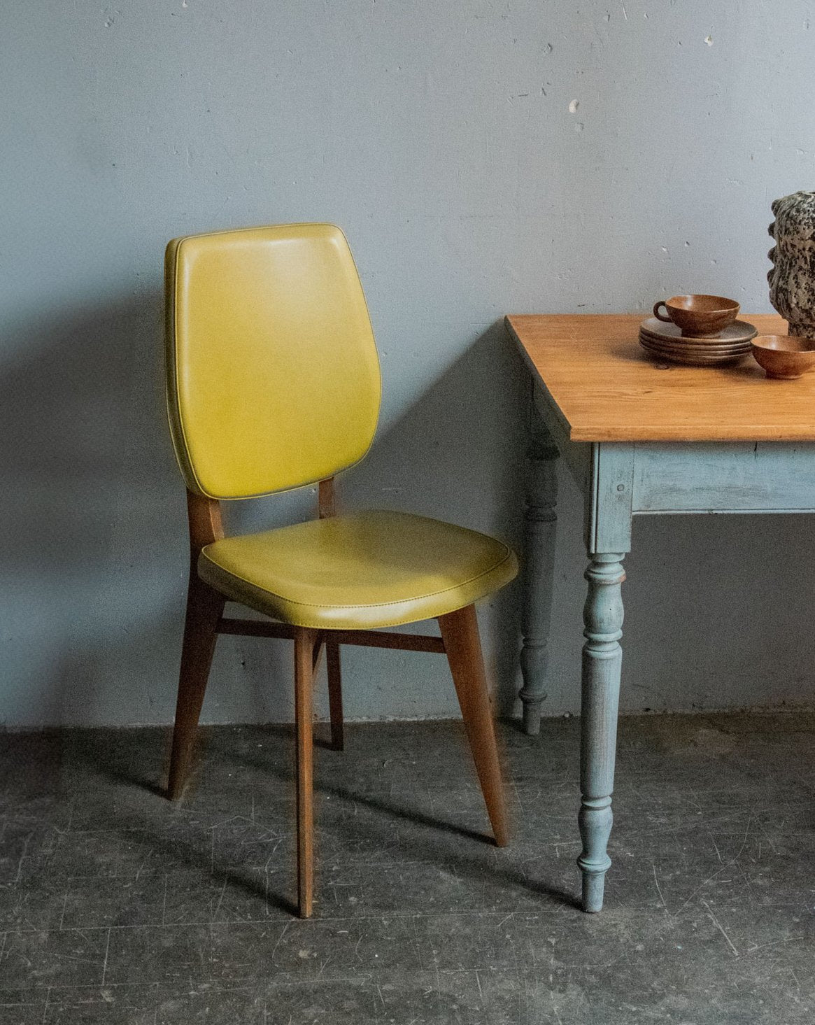 Add a touch of Scandinavian style to your home with this sleek chair. Its green leatherette seat and backrest add a fresh touch, while its wooden frame ensures strength and elegance. Although it shows slight wear, each piece has its own unique character. Available individually, this chair is ideal for complementing your decor or creating a cozy dining area. Two pieces in stock to satisfy all your desires!
