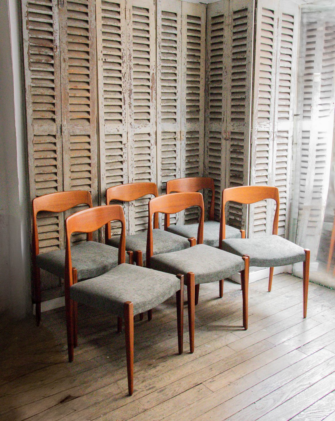 Bring a touch of Scandinavian elegance to your home with this set of six modern chairs. Featuring comfortable gray fabric seats and curved wooden backs, these chairs combine style and ergonomics. Their refined finish and clean lines make them an ideal choice for any living space. Perfect for enjoying time together around a table, they complement both contemporary and industrial décor.