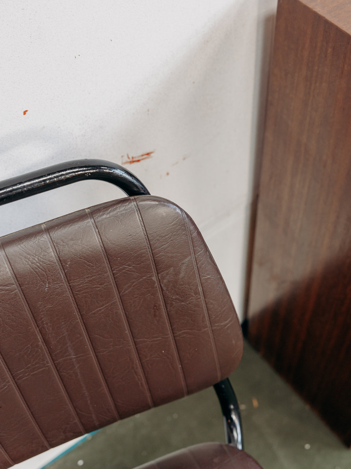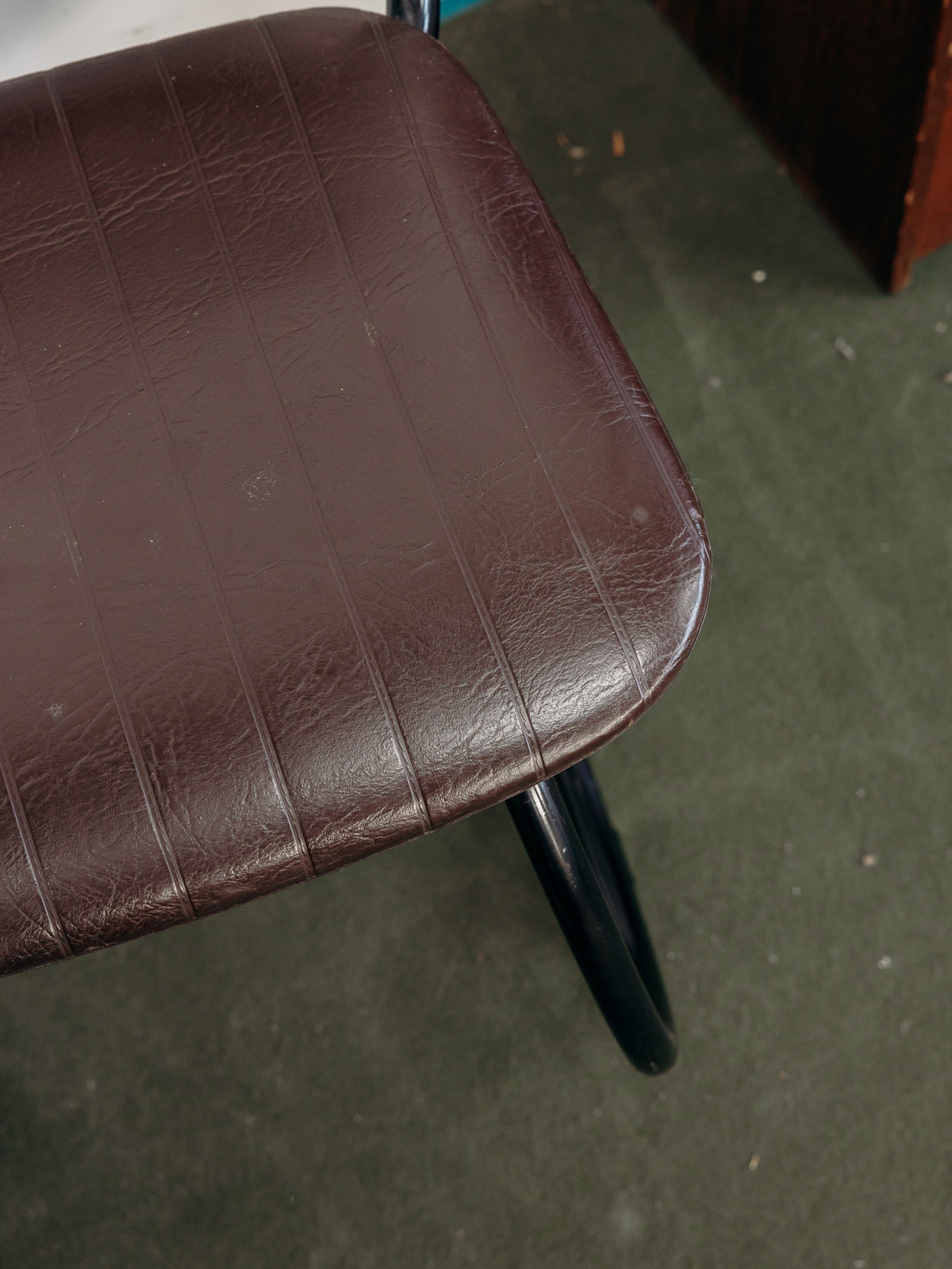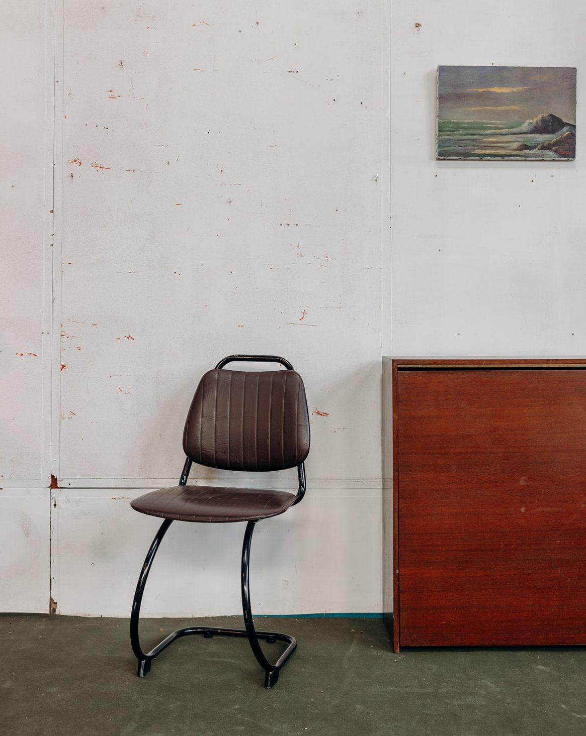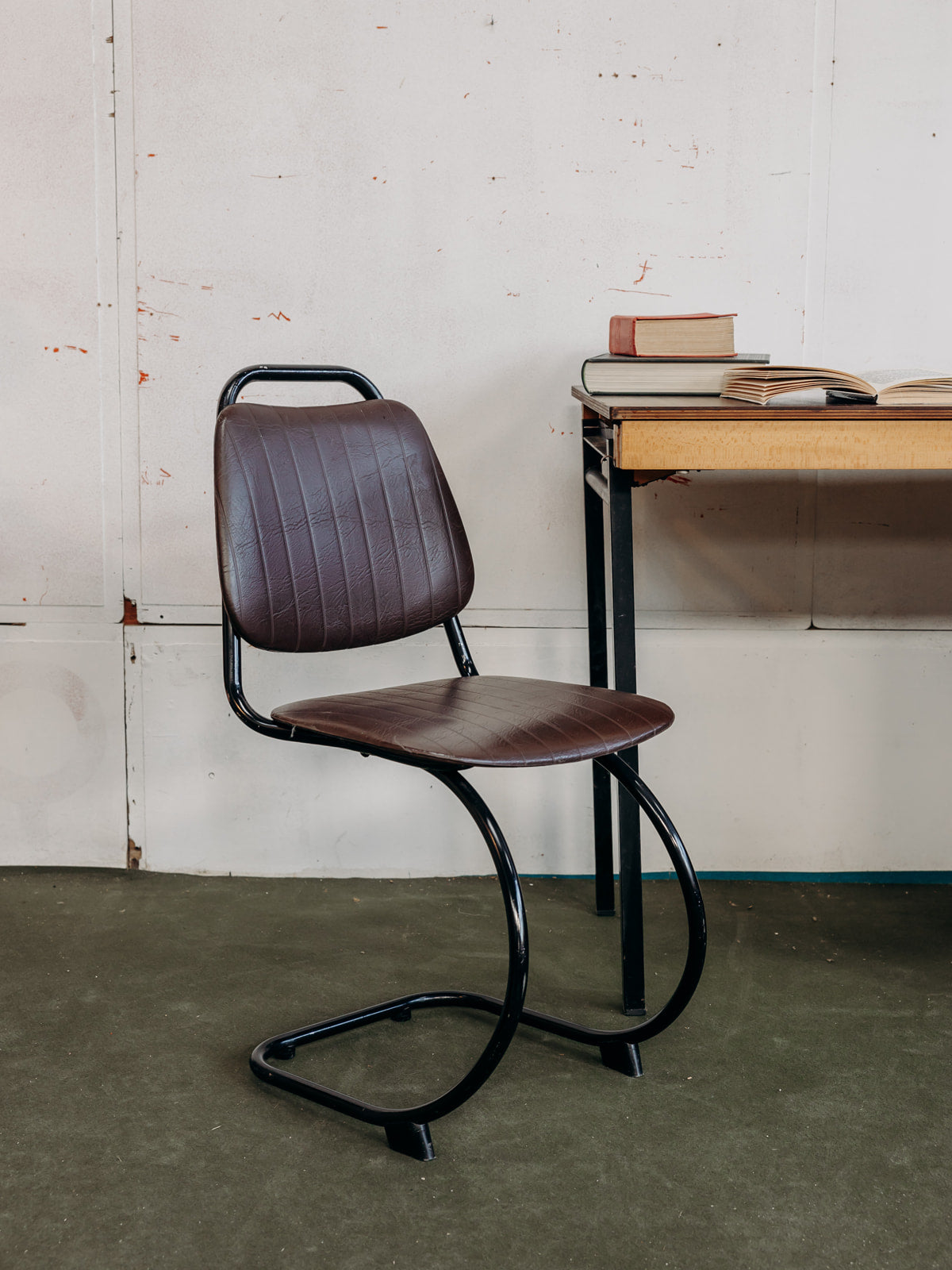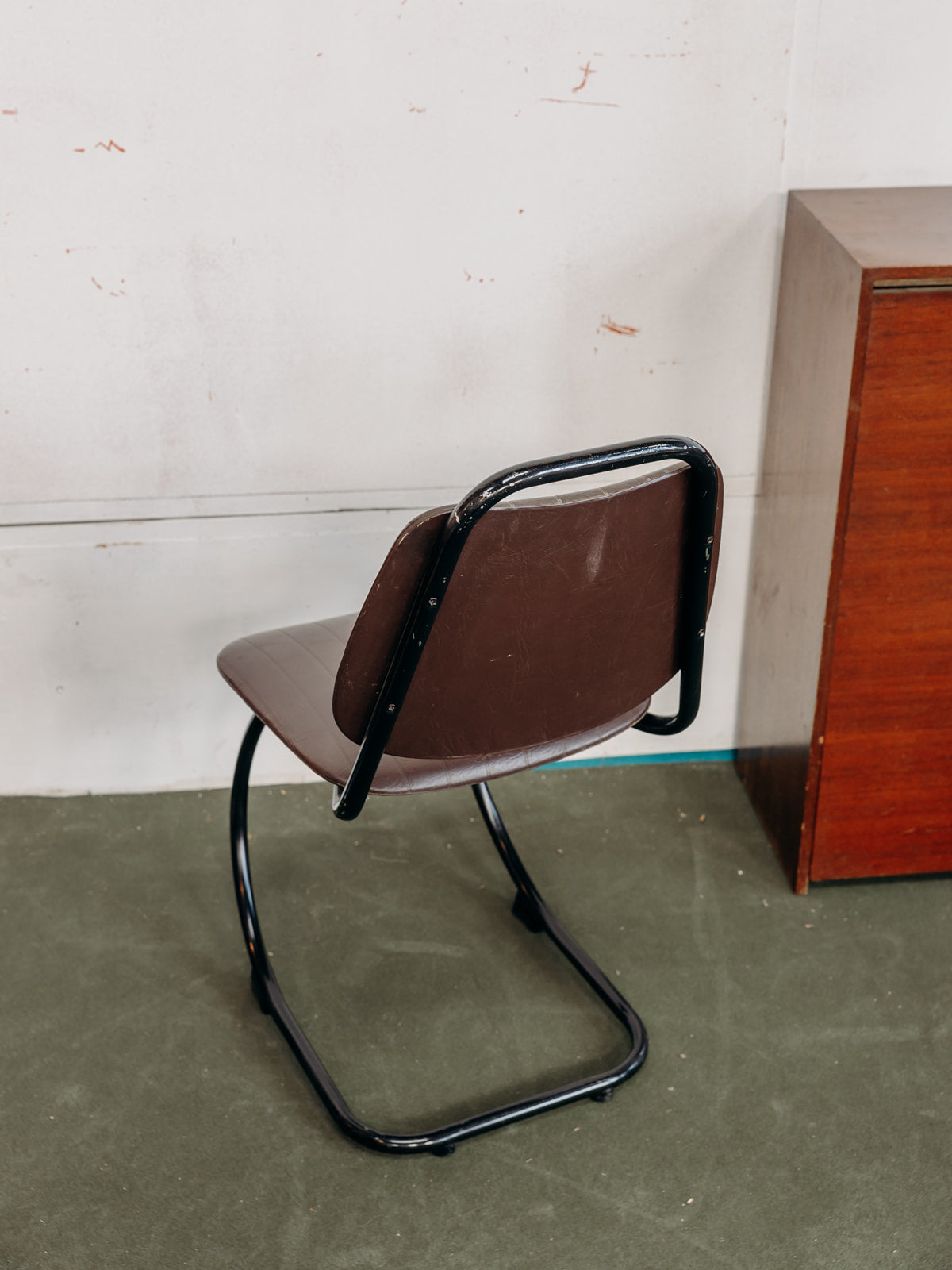 Découvrez cette élégante chaise de bureau en skaï marron, qui allie confort et esthétisme. Sa structure tubulaire en métal noir et ses pieds courbés lui confèrent une touche moderne tout en garantissant une robustesse à toute épreuve. Bien que présentant de légères usures, cette chaise reste un choix idéal pour apporter du caractère à votre espace de travail tout en offrant un confort optimal. Un must-have pour les amoureux du design contemporain !