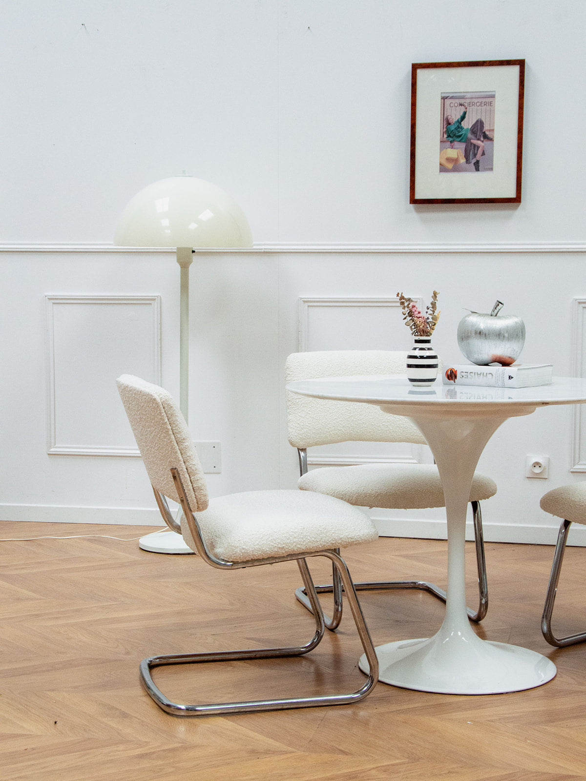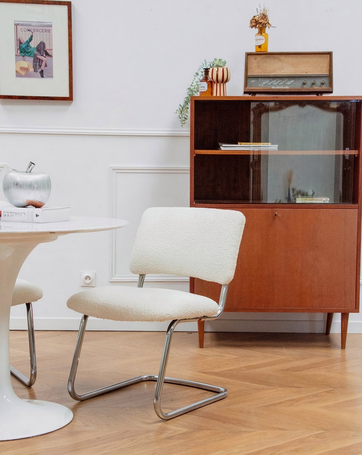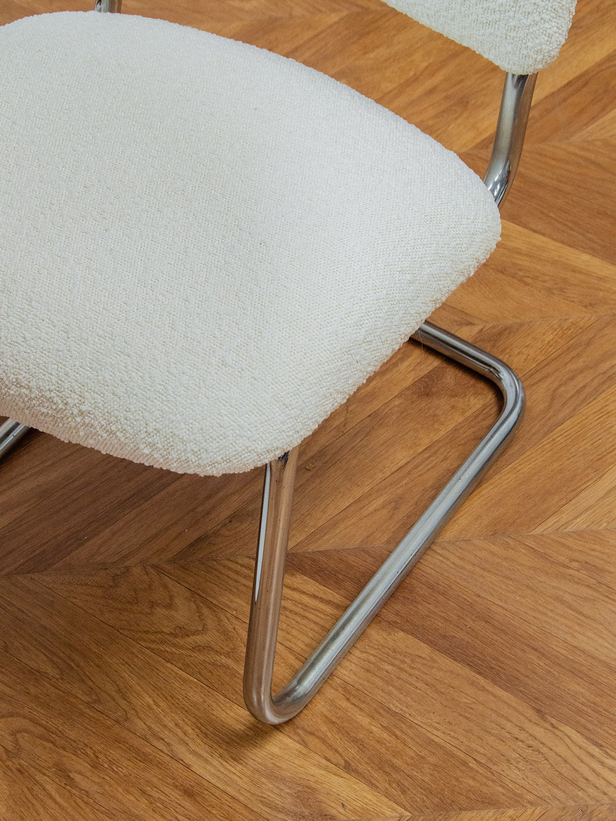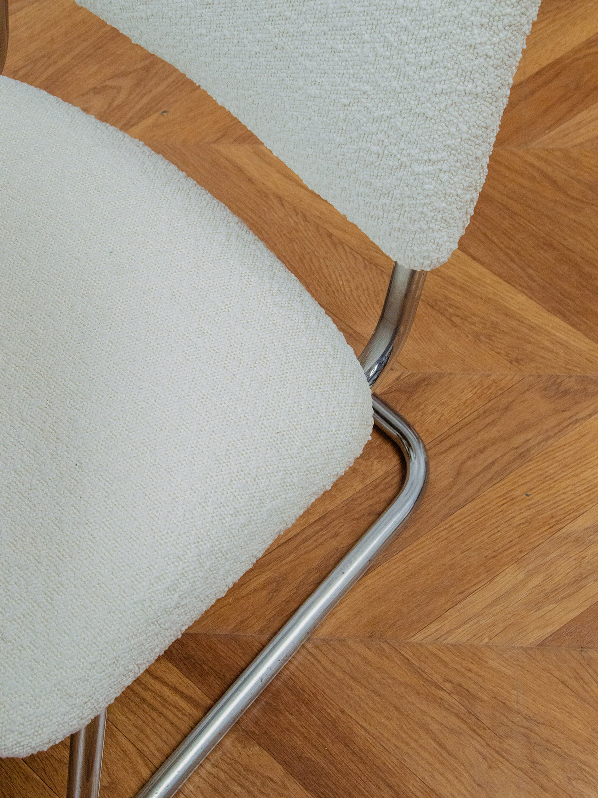 Immerse yourself in vintage elegance with these 1970s chairs, designed by Strafor and made in France. Reupholstered, they combine retro-chic style with undeniable comfort. Each chair features a chrome-plated metal frame and refined fabric in shades of white. Available individually, these unique pieces are ready to enhance your home with their timeless charm. Don't miss the opportunity to embrace this authenticity in your decor! Sold individually, 3 quantities are available.