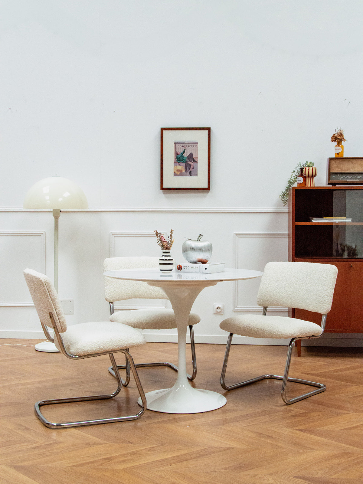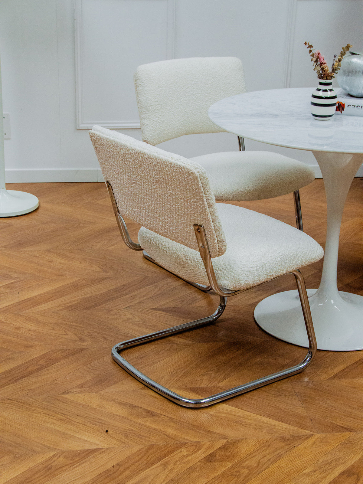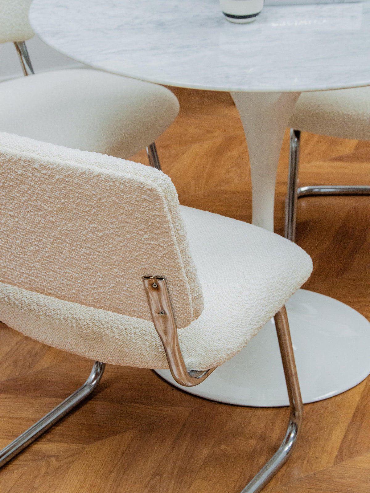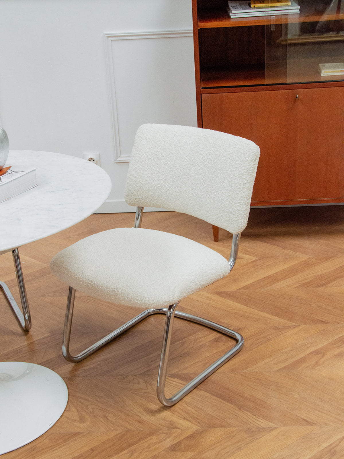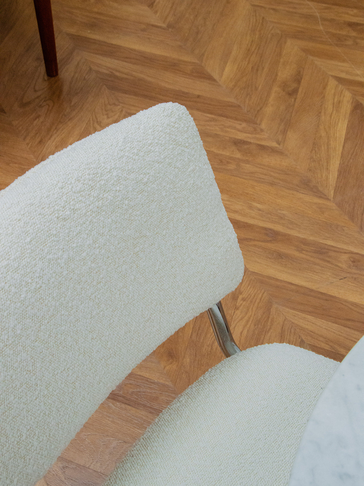 Immerse yourself in vintage elegance with these 1970s chairs, designed by Strafor and made in France. Reupholstered, they combine retro-chic style with undeniable comfort. Each chair features a chrome-plated metal frame and refined fabric in shades of white. Available individually, these unique pieces are ready to enhance your home with their timeless charm. Don't miss the opportunity to embrace this authenticity in your decor! Sold individually, 3 quantities are available.