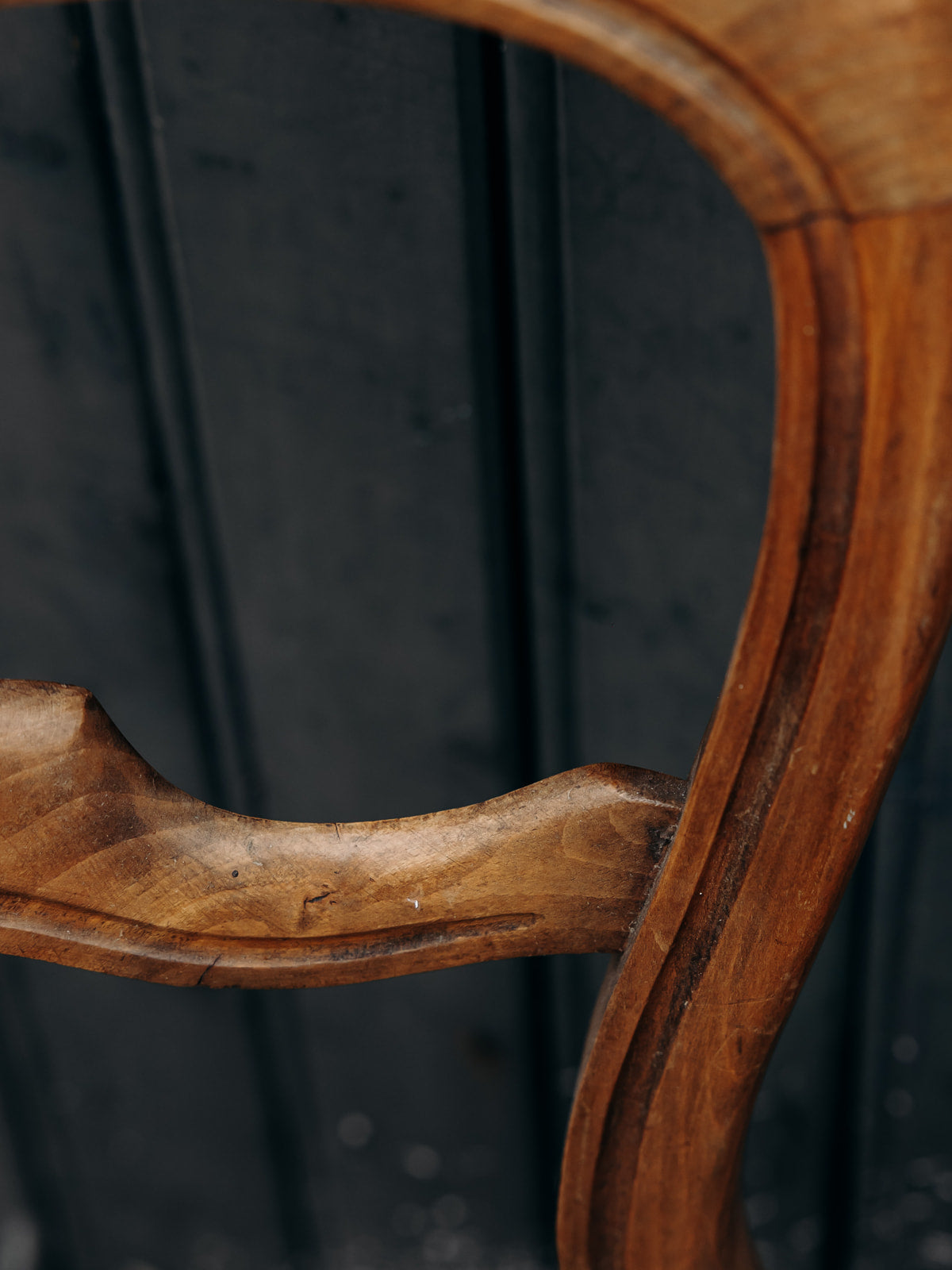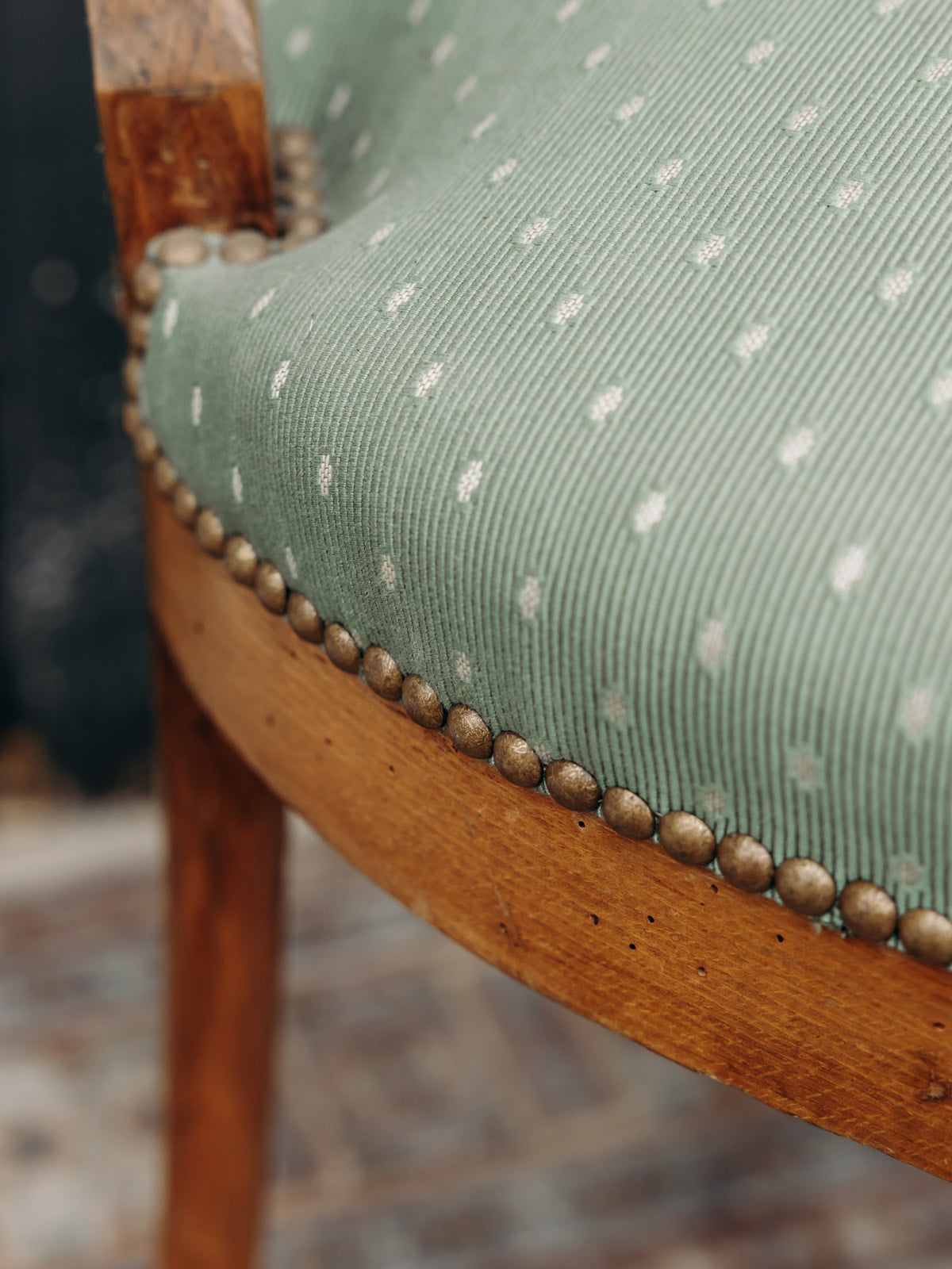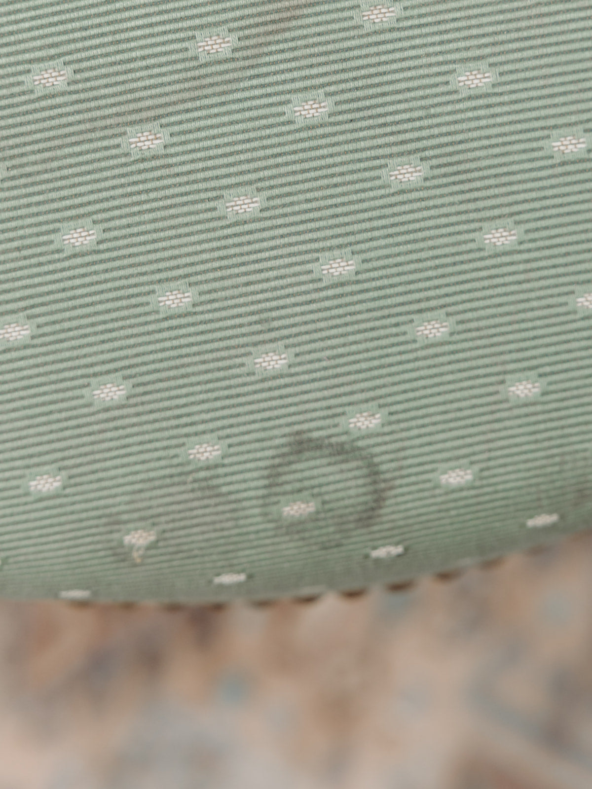Discover this timeless wooden chair. Its sturdy structure showcases beautiful details, while its green fabric seat, slightly embossed as seen in the photos, adds a touch of originality and character to your interior. A piece that combines style, comfort, and conviviality, perfect for enhancing your decor.