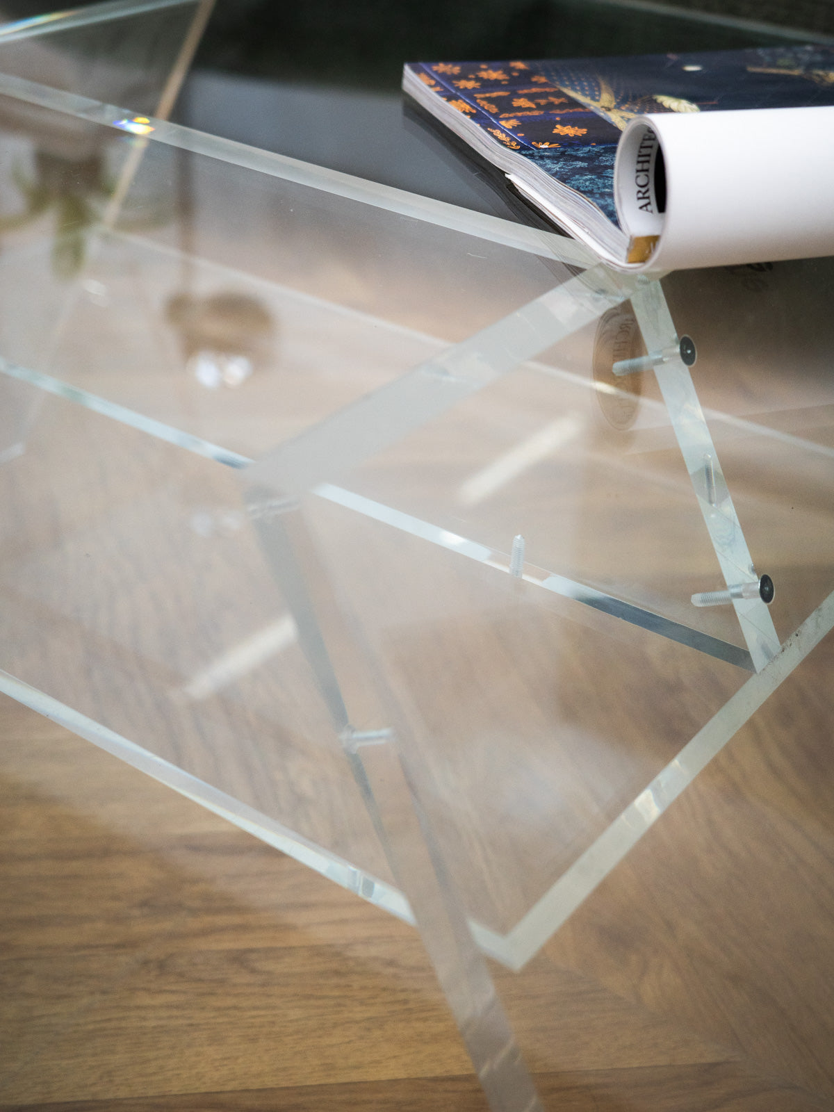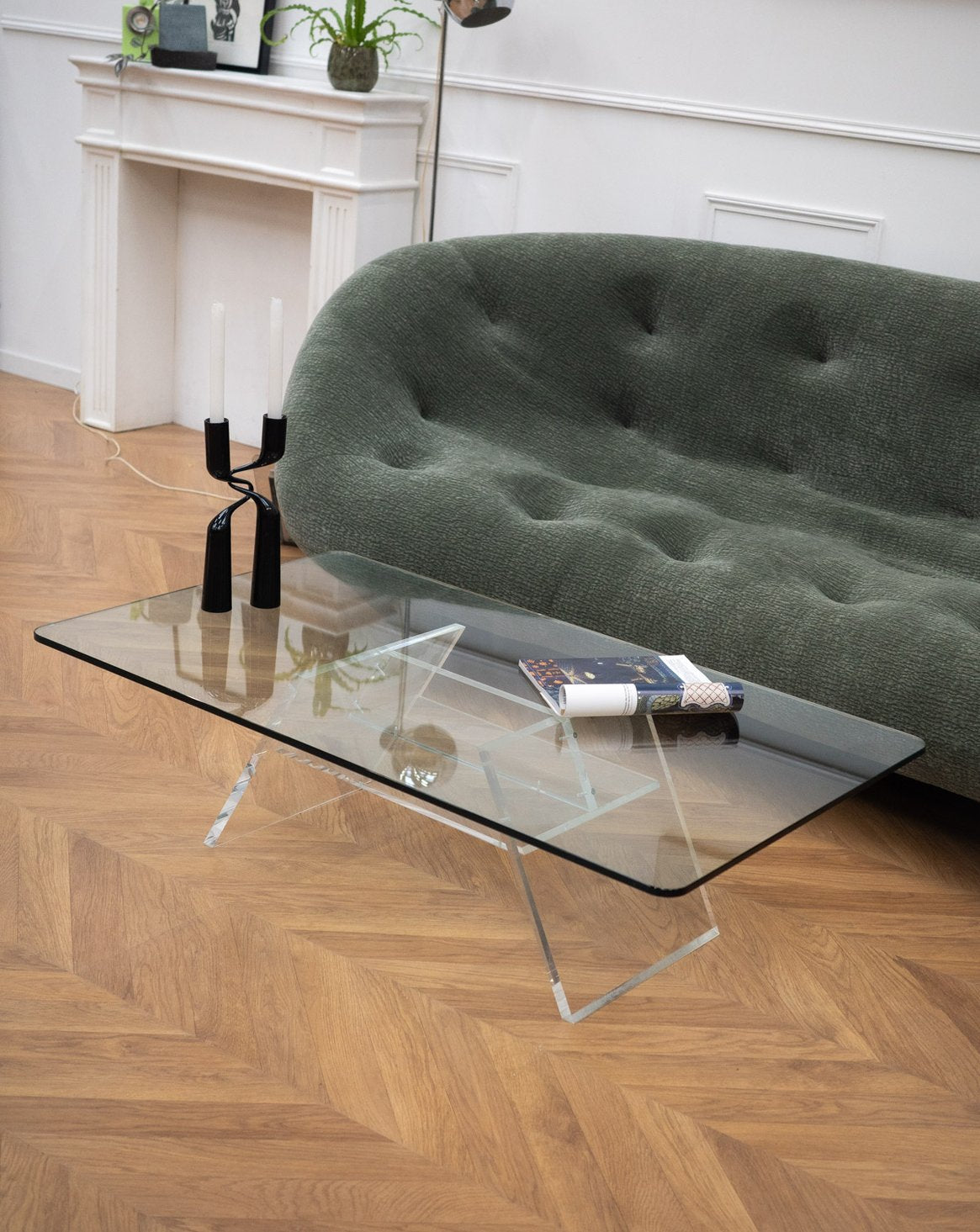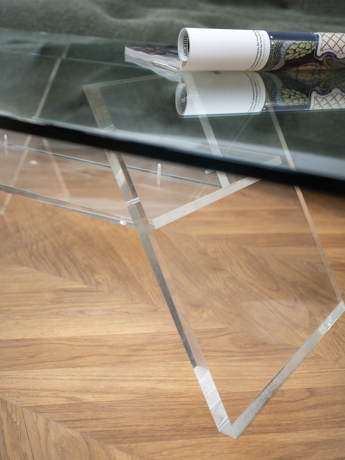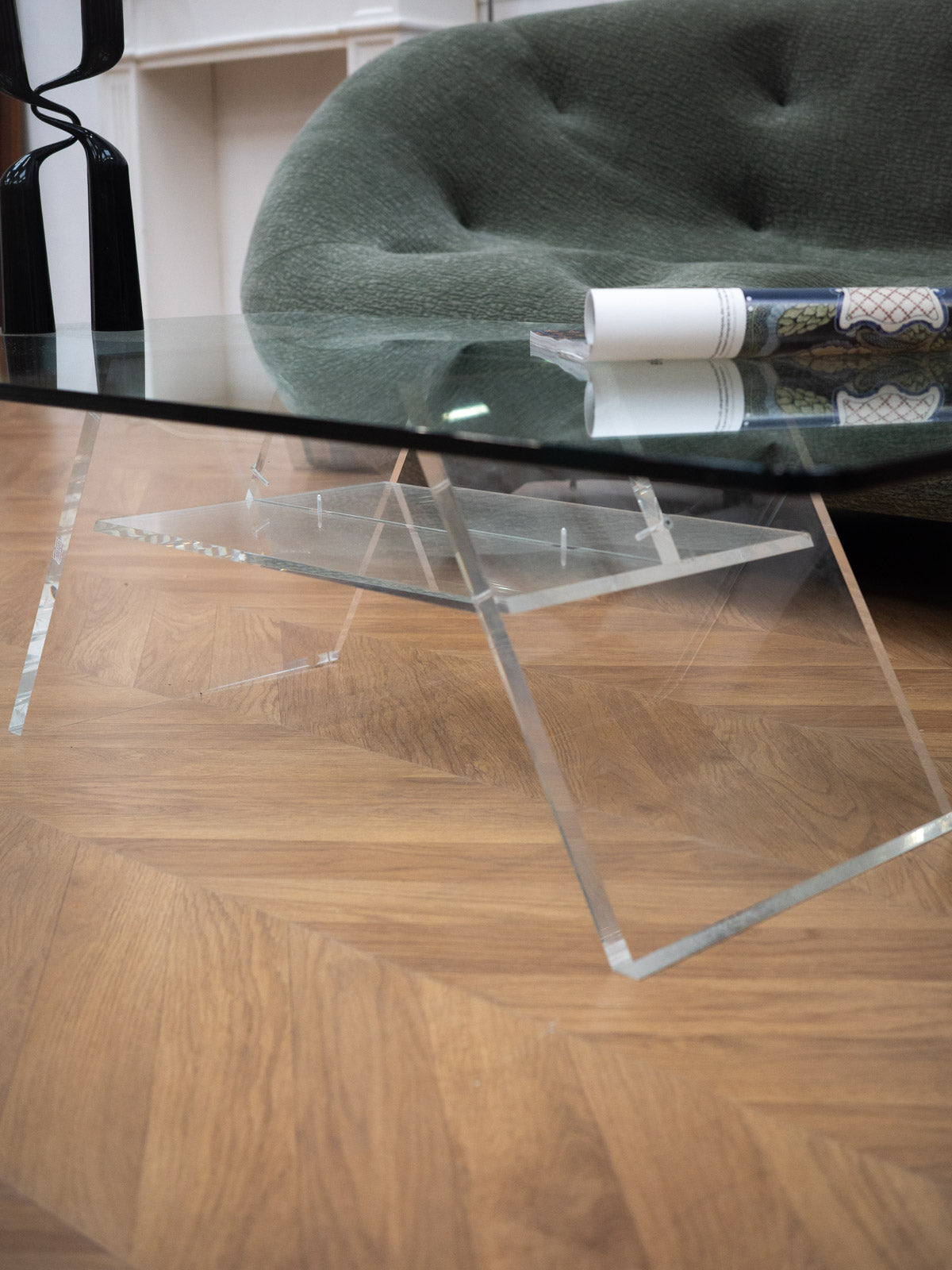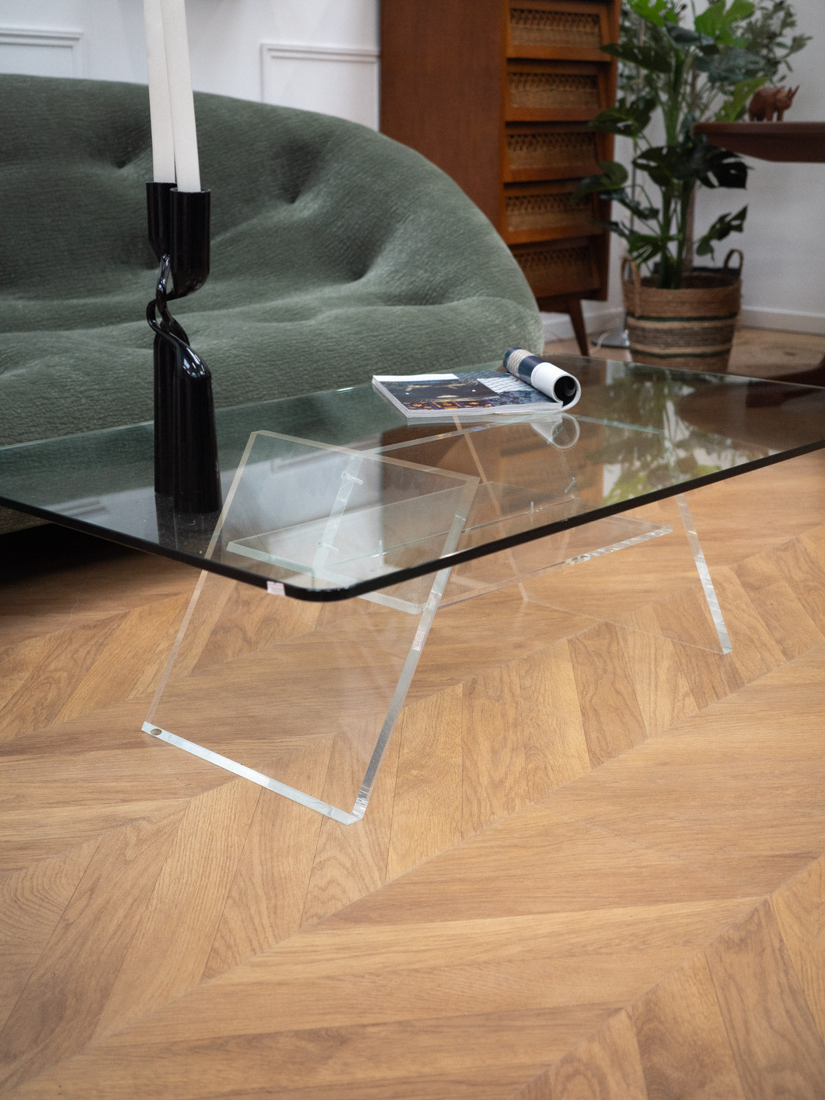 Découvrez cette élégante table basse au charme intemporel inspirée des années 70. Avec son plateau en verre transparent et son piétement en plexiglass, elle se distingue par des angles arrondis qui lui confèrent une douceur visuelle. Son double plateau, posé sur socle, offre deux niveaux d'utilisation, créant ainsi un effet léger et lumineux dans votre espace. Son design allie fonctionnalité et esthétisme, tout en présentant quelques traces d'usure, témoignage de son authenticité. Une pièce idéale pour ajouter une touche vintage à votre intérieur.