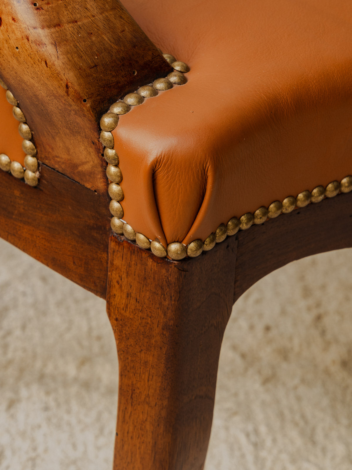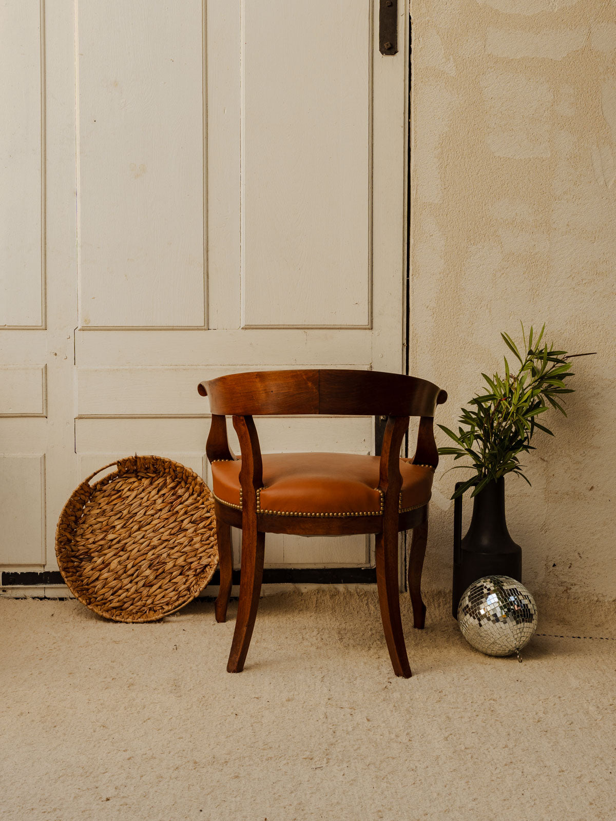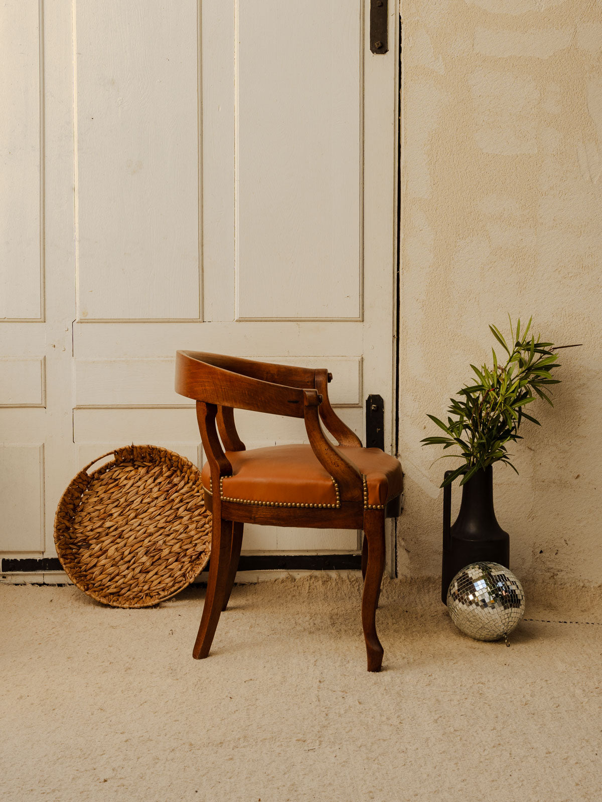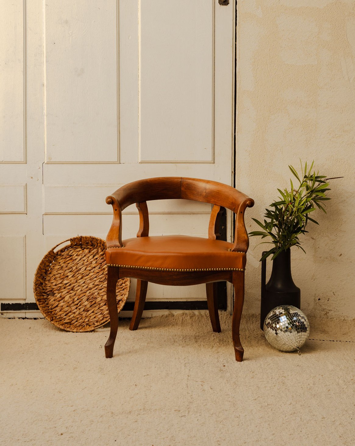 Discover this magnificent walnut and studded leatherette armchair, an iconic piece from the 19th century, Napoleon era. Combining elegance and comfort, this armchair stands out with its refined design and decorative studs that highlight the classic lines of its look. Perfect for adding a touch of authenticity to your interior, it will charm lovers of period furniture and those looking for a vintage accent. A unique piece that combines history and style, ideal for enhancing your living room or office.