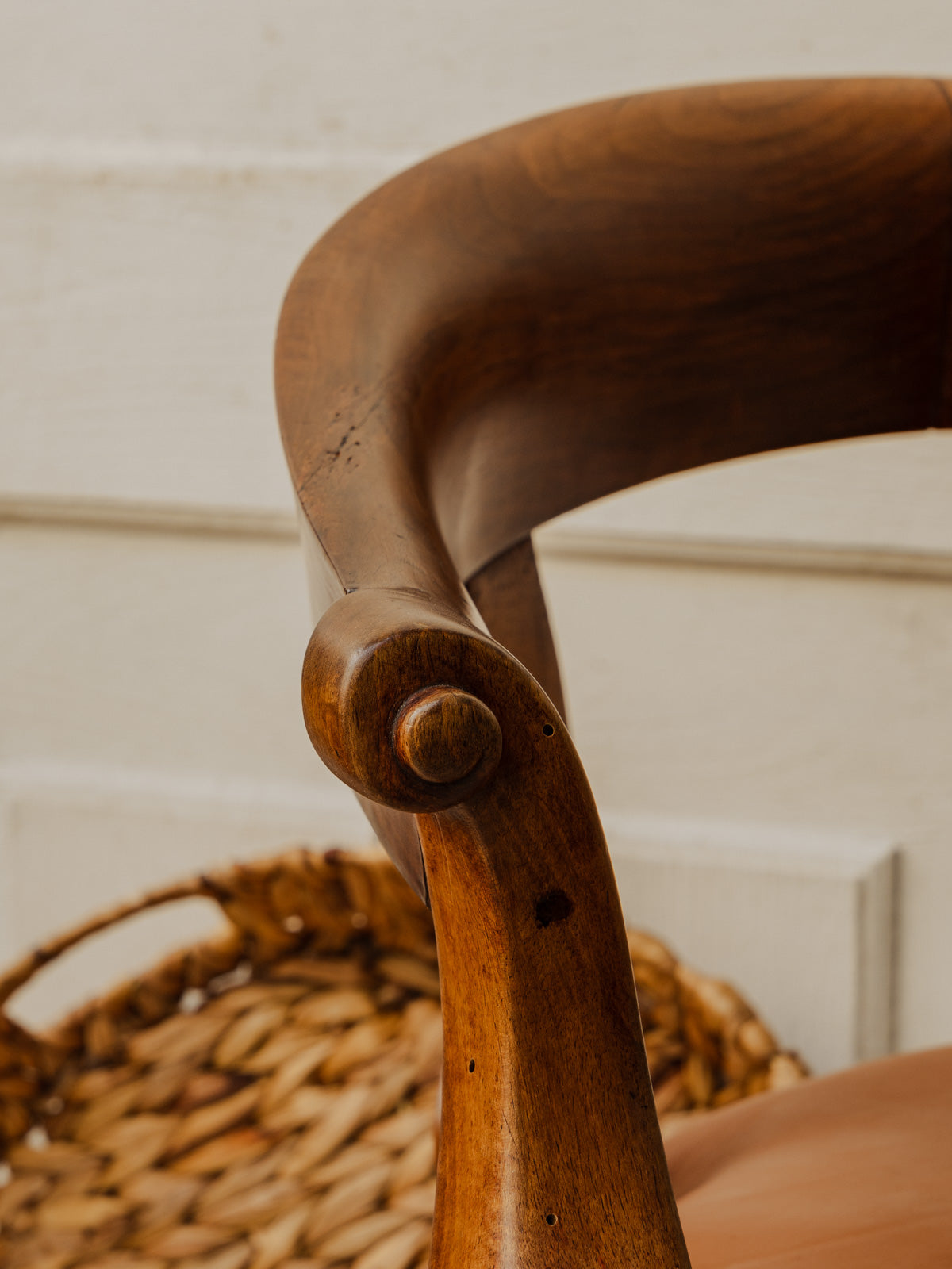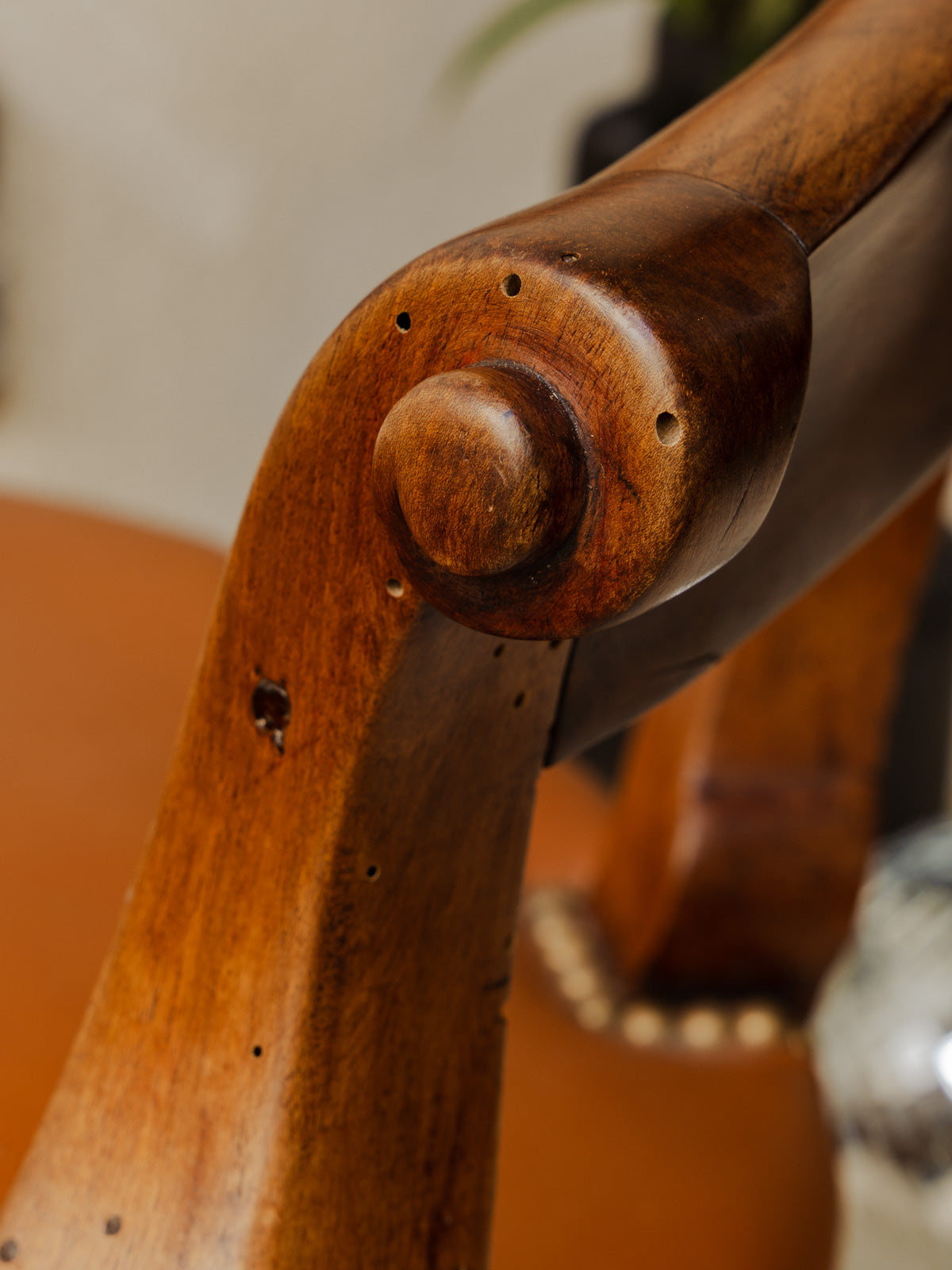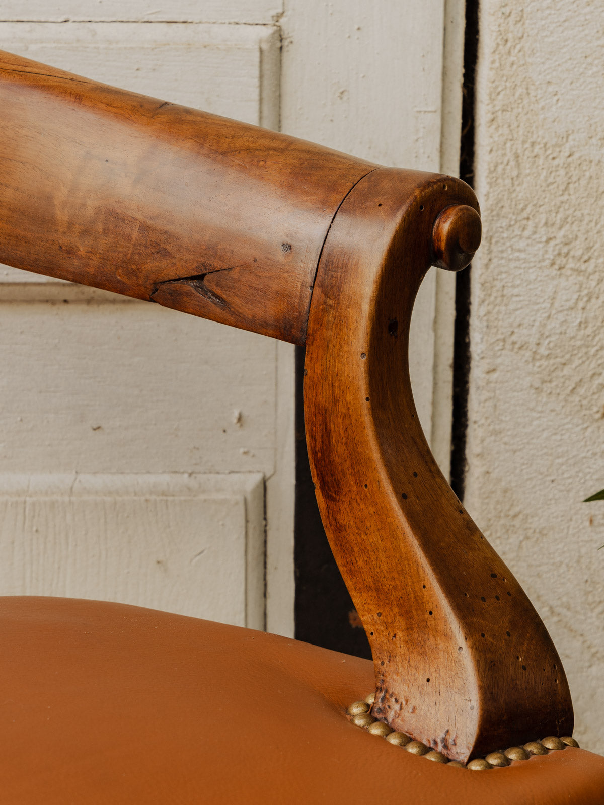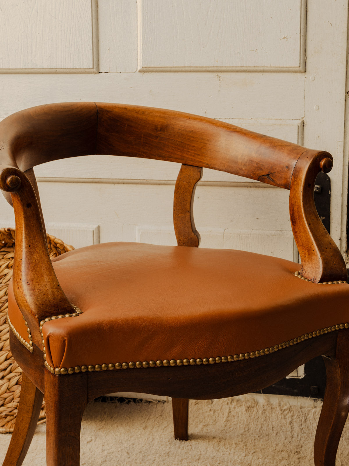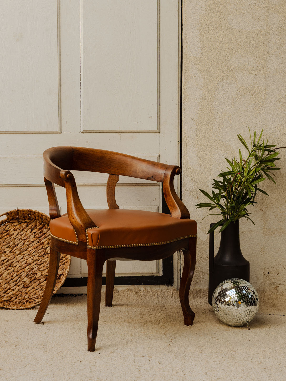 Discover this magnificent walnut and studded leatherette armchair, an iconic piece from the 19th century, Napoleon era. Combining elegance and comfort, this armchair stands out with its refined design and decorative studs that highlight the classic lines of its look. Perfect for adding a touch of authenticity to your interior, it will charm lovers of period furniture and those looking for a vintage accent. A unique piece that combines history and style, ideal for enhancing your living room or office.